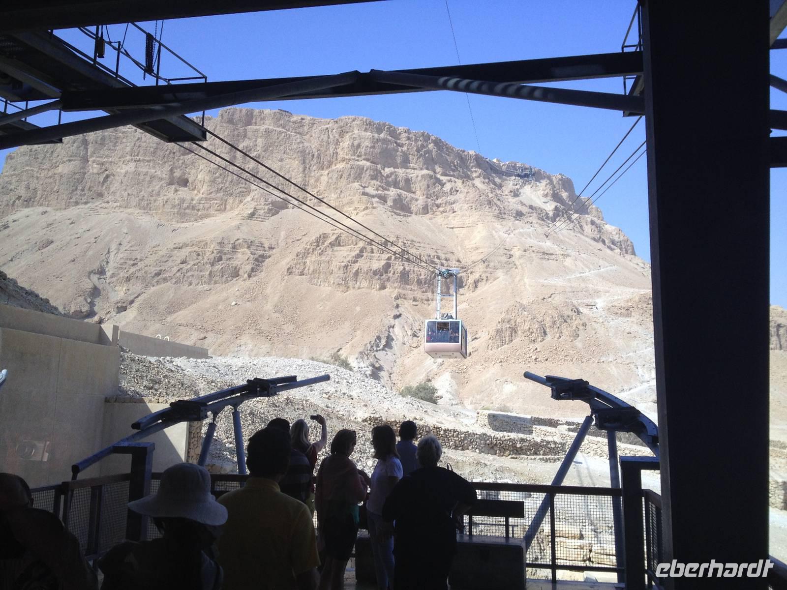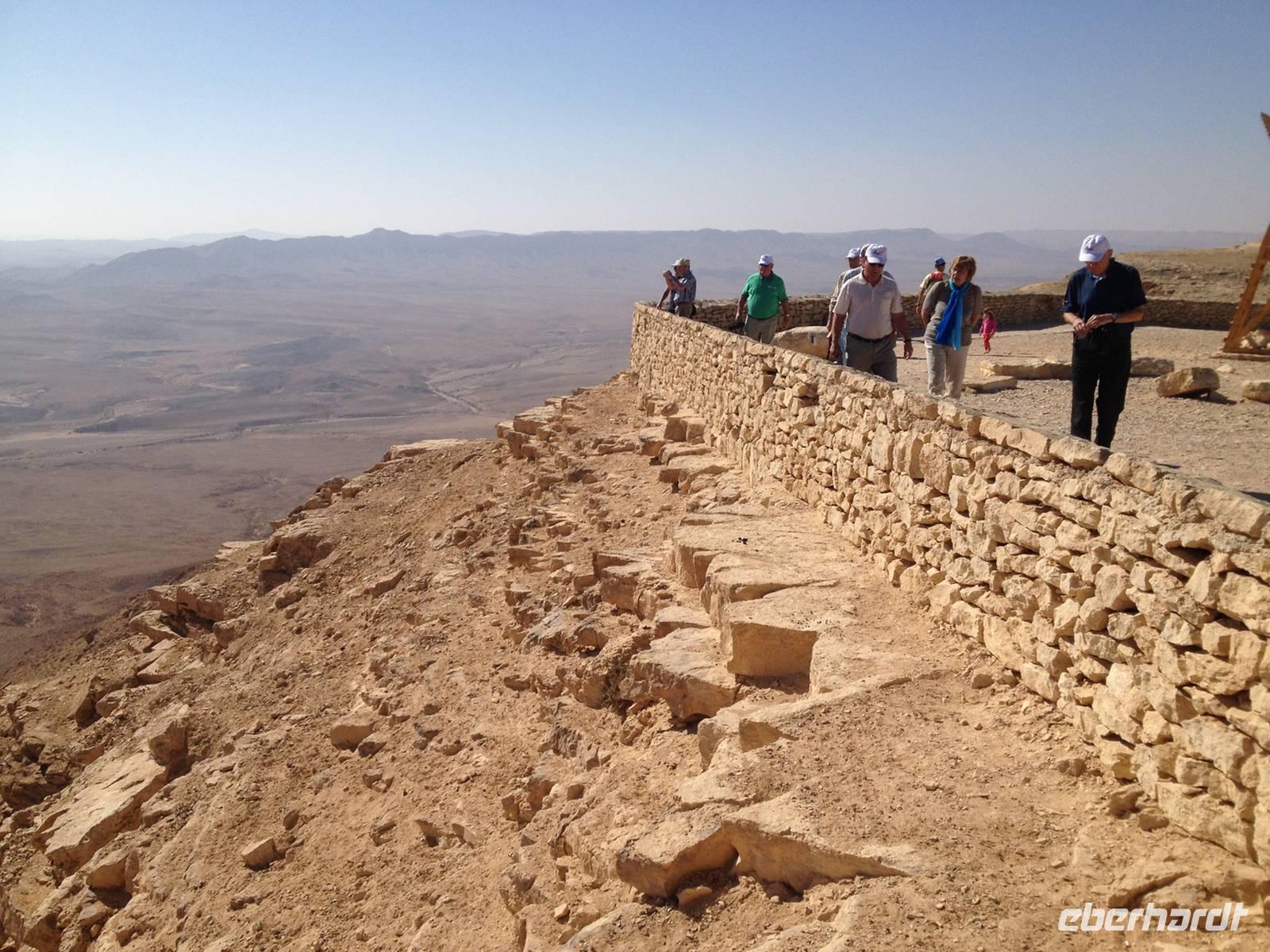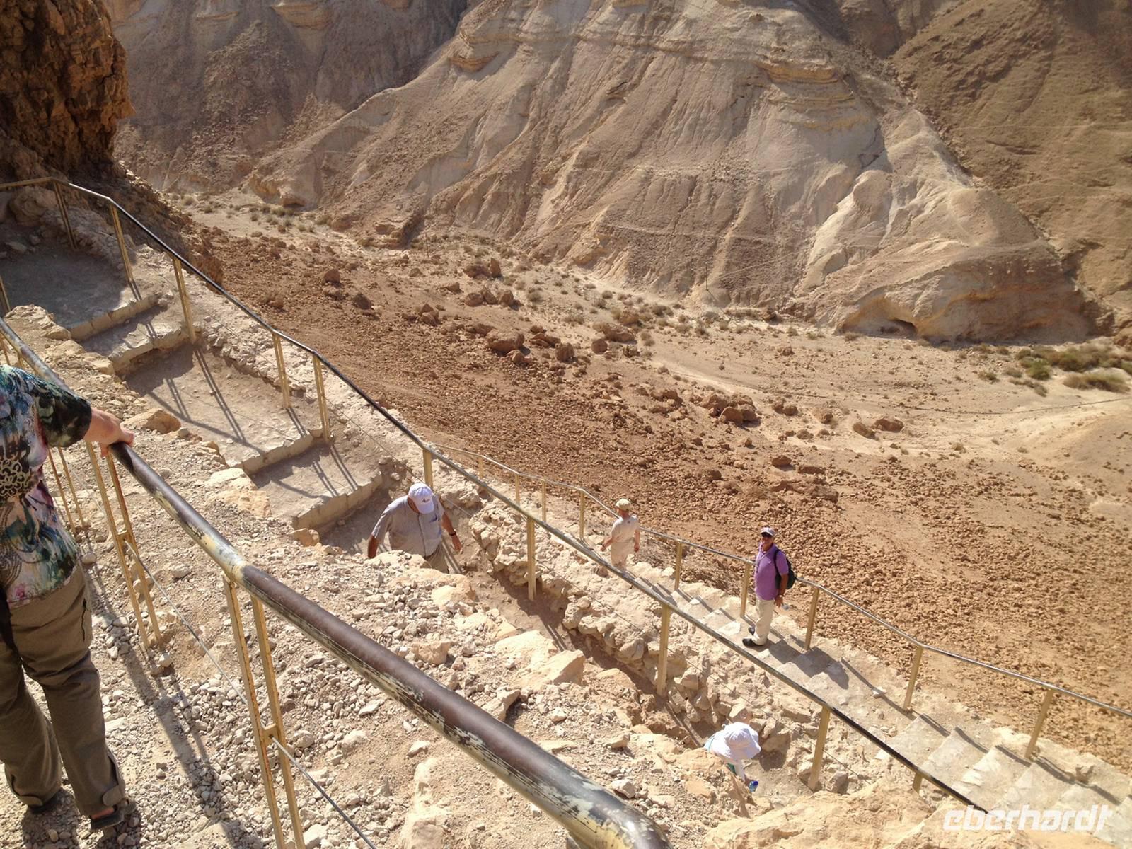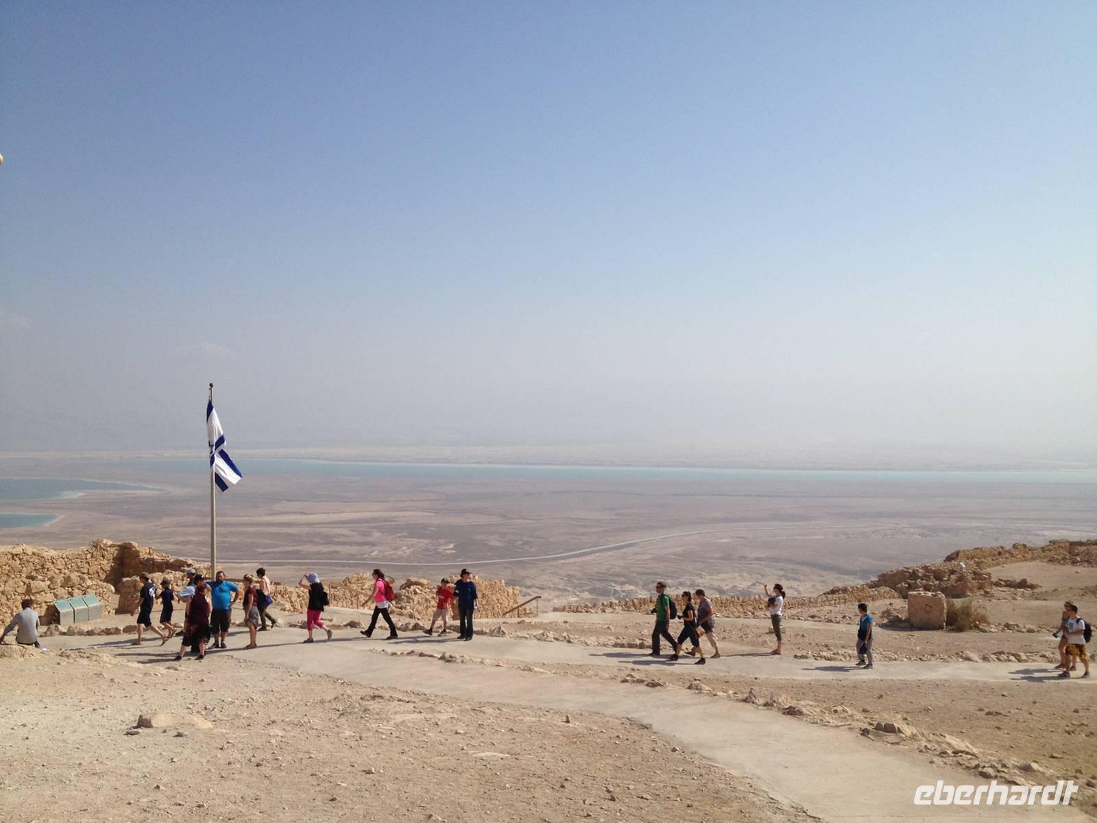 Nachdem wir mit der Seilbahn auf das 440 Meter hohe Plateau fuhren, konnten wir uns die Ereignisse, die sich in den Jahren 72 und 73 zutrugen und den Mythos Masada begründen, gleich lebhaft vorstellen. Von hier oben konnte man die ganze Gegend wunderbar überblicken: Ringsum zu Füßen des Bergmassivs sahen wir den Erdwall, der von den Römern als Umzingelung aufgeschüttet wurde. Und wie Perlen auf der Schnur liegen die steinernen Schutzwälle von insgesamt acht Truppenlagern des römischen Statthalters von Judäa, Flavius Silva. Im Westen zeigten sich die zu einer Rampe aufgeschütteten Erdschichten, über die die X. Legion die Festung schließlich stürmte. Und nach unserem Rundgang „stürmten" wir als Eberhardt-Legion die Römische Rampe erneut, um auf der anderen Seite wieder in unseren Bus zu kommen.