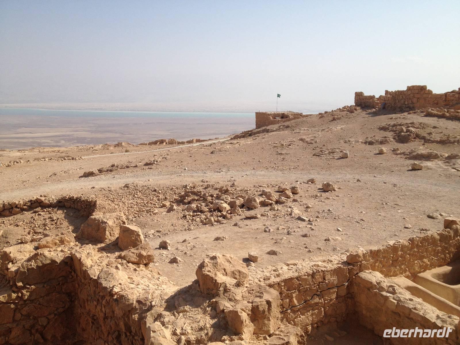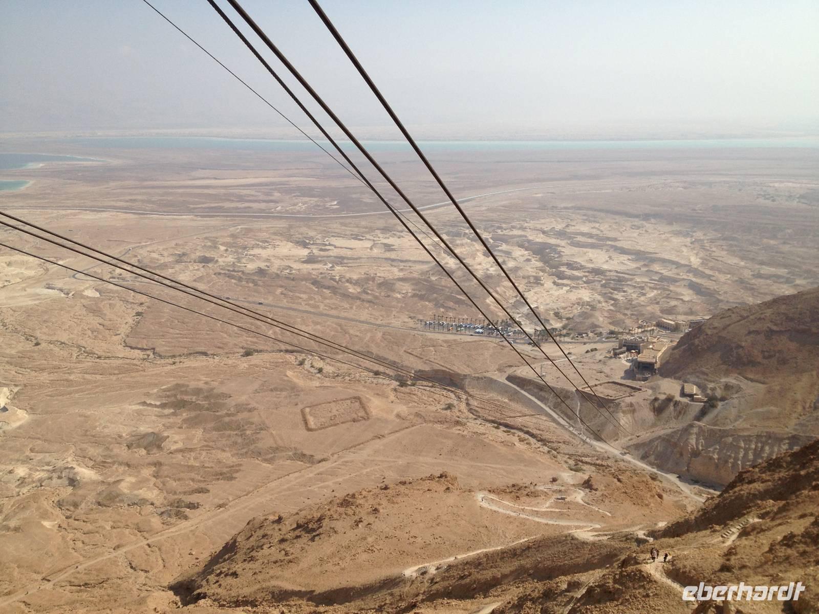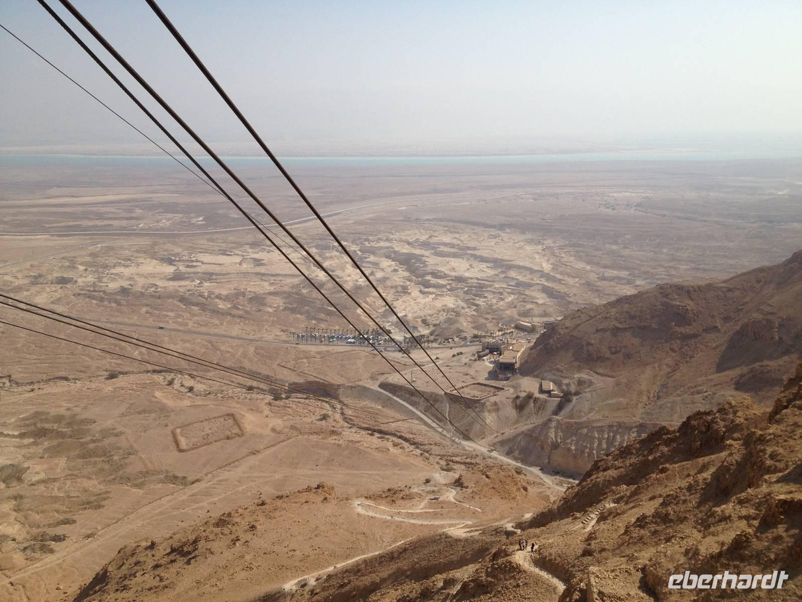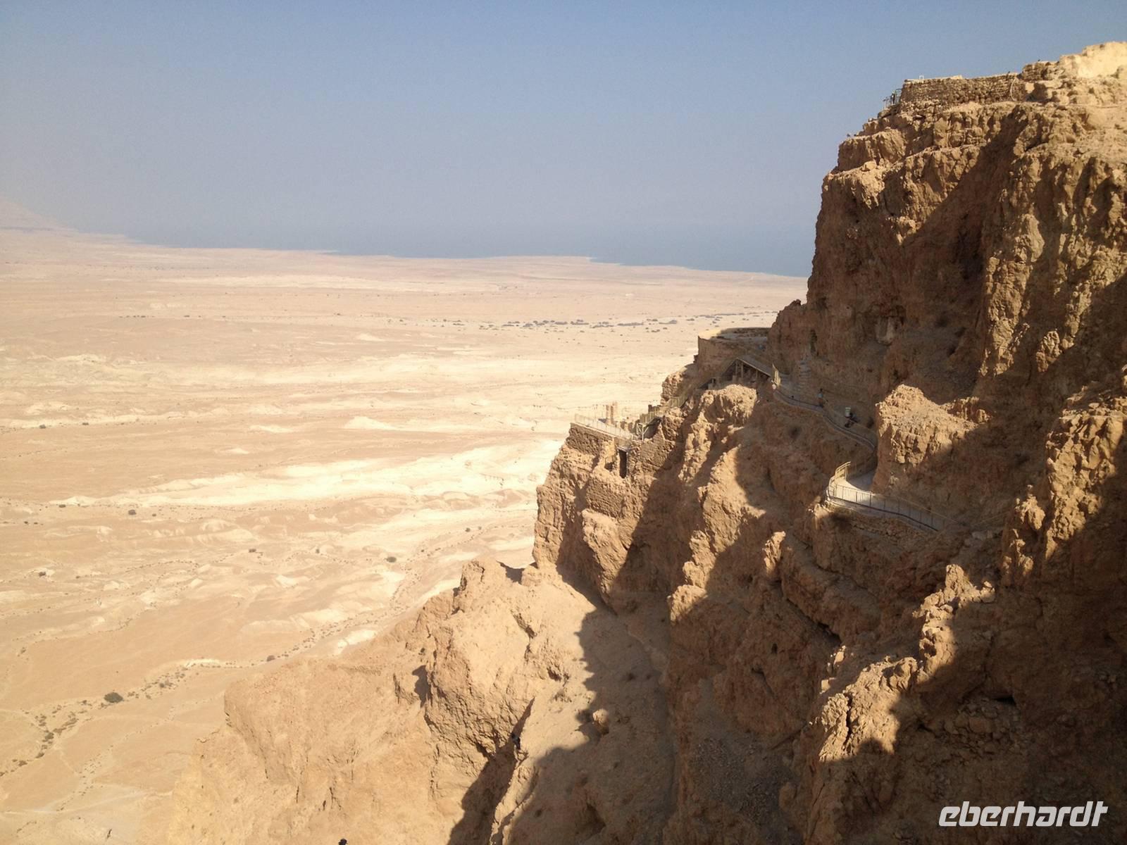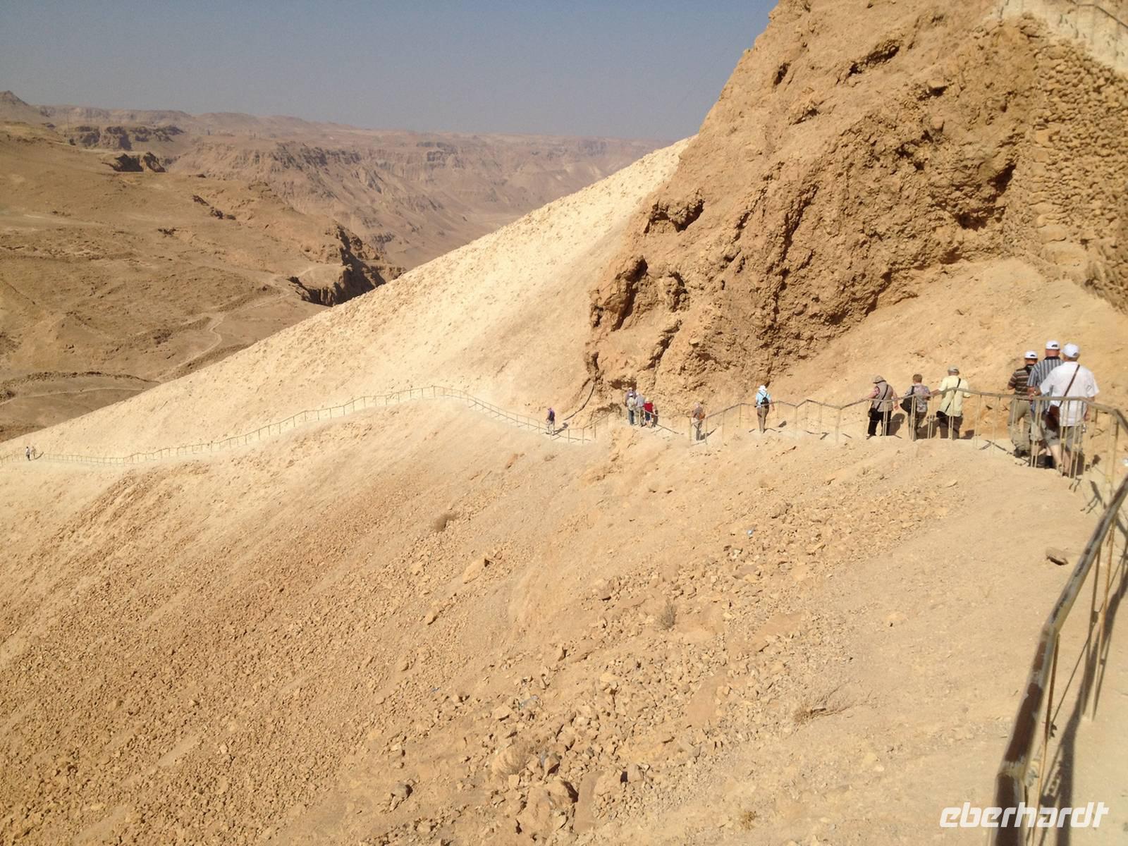 Nachdem wir mit der Seilbahn auf das 440 Meter hohe Plateau fuhren, konnten wir uns die Ereignisse, die sich in den Jahren 72 und 73 zutrugen und den Mythos Masada begründen, gleich lebhaft vorstellen. Von hier oben konnte man die ganze Gegend wunderbar überblicken: Ringsum zu Füßen des Bergmassivs sahen wir den Erdwall, der von den Römern als Umzingelung aufgeschüttet wurde. Und wie Perlen auf der Schnur liegen die steinernen Schutzwälle von insgesamt acht Truppenlagern des römischen Statthalters von Judäa, Flavius Silva. Im Westen zeigten sich die zu einer Rampe aufgeschütteten Erdschichten, über die die X. Legion die Festung schließlich stürmte. Und nach unserem Rundgang „stürmten" wir als Eberhardt-Legion die Römische Rampe erneut, um auf der anderen Seite wieder in unseren Bus zu kommen.