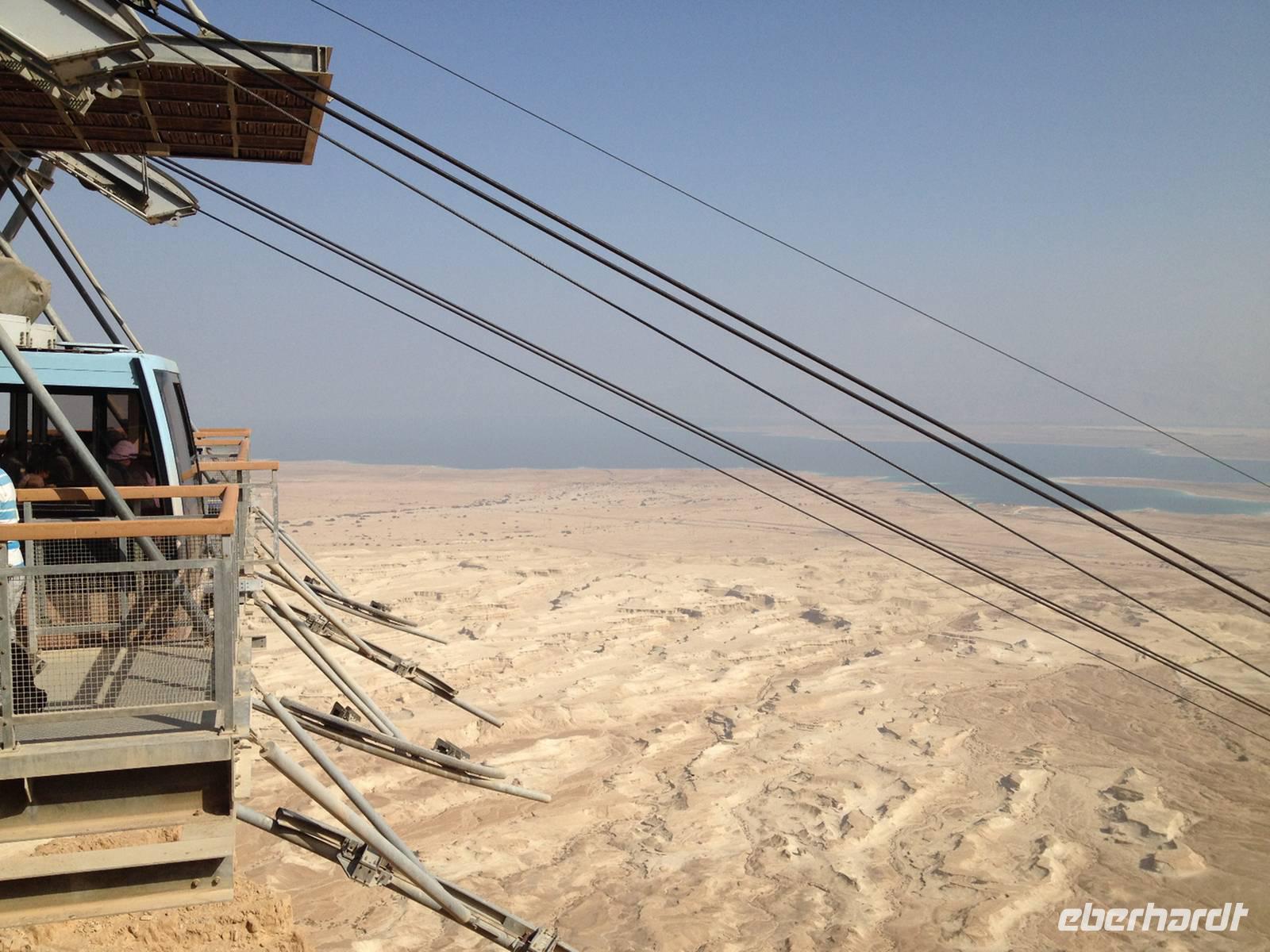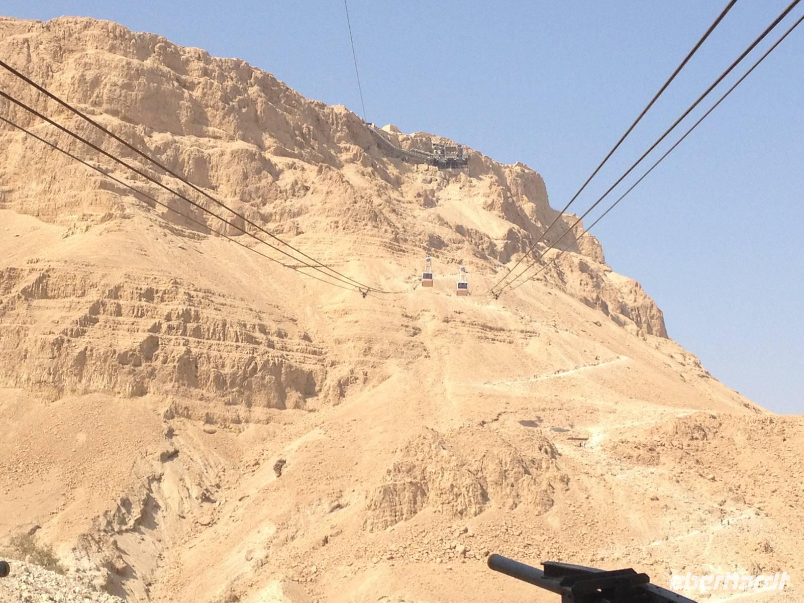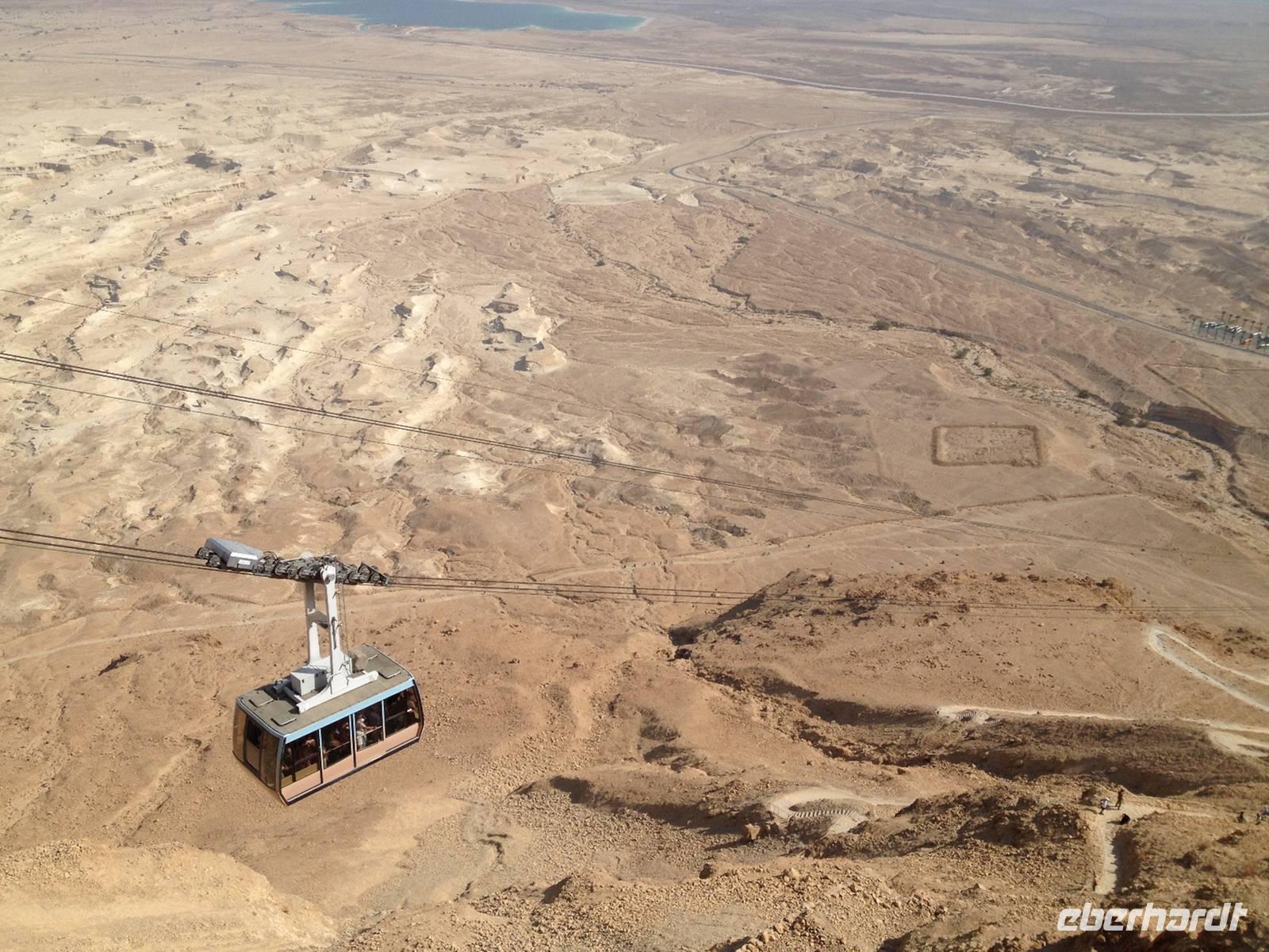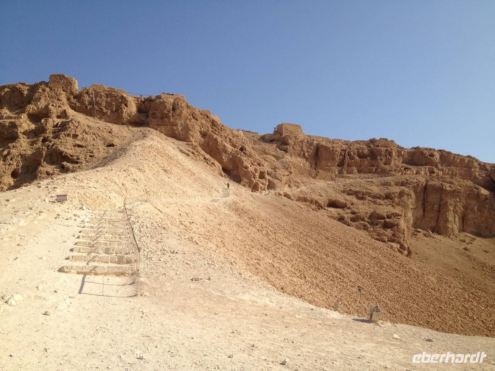 Nachdem wir mit der Seilbahn auf das 440 Meter hohe Plateau fuhren, konnten wir uns die Ereignisse, die sich in den Jahren 72 und 73 zutrugen und den Mythos Masada begründen, gleich lebhaft vorstellen. Von hier oben konnte man die ganze Gegend wunderbar überblicken: Ringsum zu Füßen des Bergmassivs sahen wir den Erdwall, der von den Römern als Umzingelung aufgeschüttet wurde. Und wie Perlen auf der Schnur liegen die steinernen Schutzwälle von insgesamt acht Truppenlagern des römischen Statthalters von Judäa, Flavius Silva. Im Westen zeigten sich die zu einer Rampe aufgeschütteten Erdschichten, über die die X. Legion die Festung schließlich stürmte. Und nach unserem Rundgang „stürmten" wir als Eberhardt-Legion die Römische Rampe erneut, um auf der anderen Seite wieder in unseren Bus zu kommen.