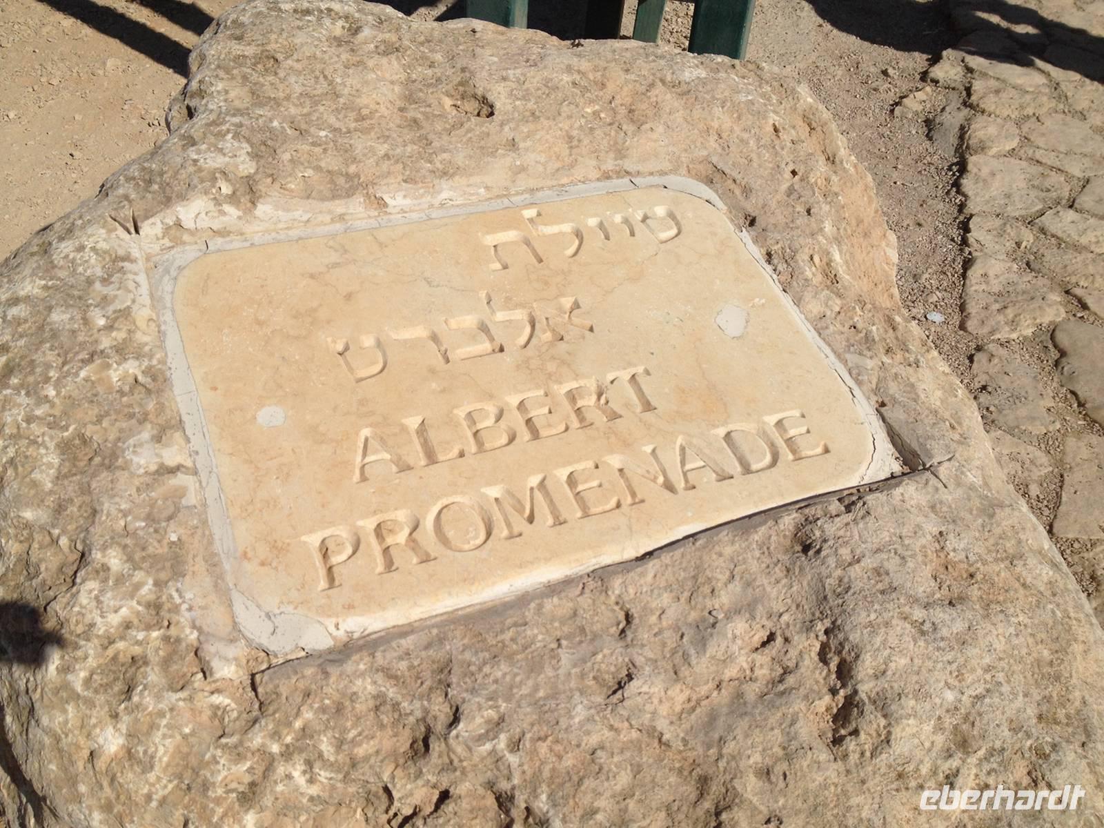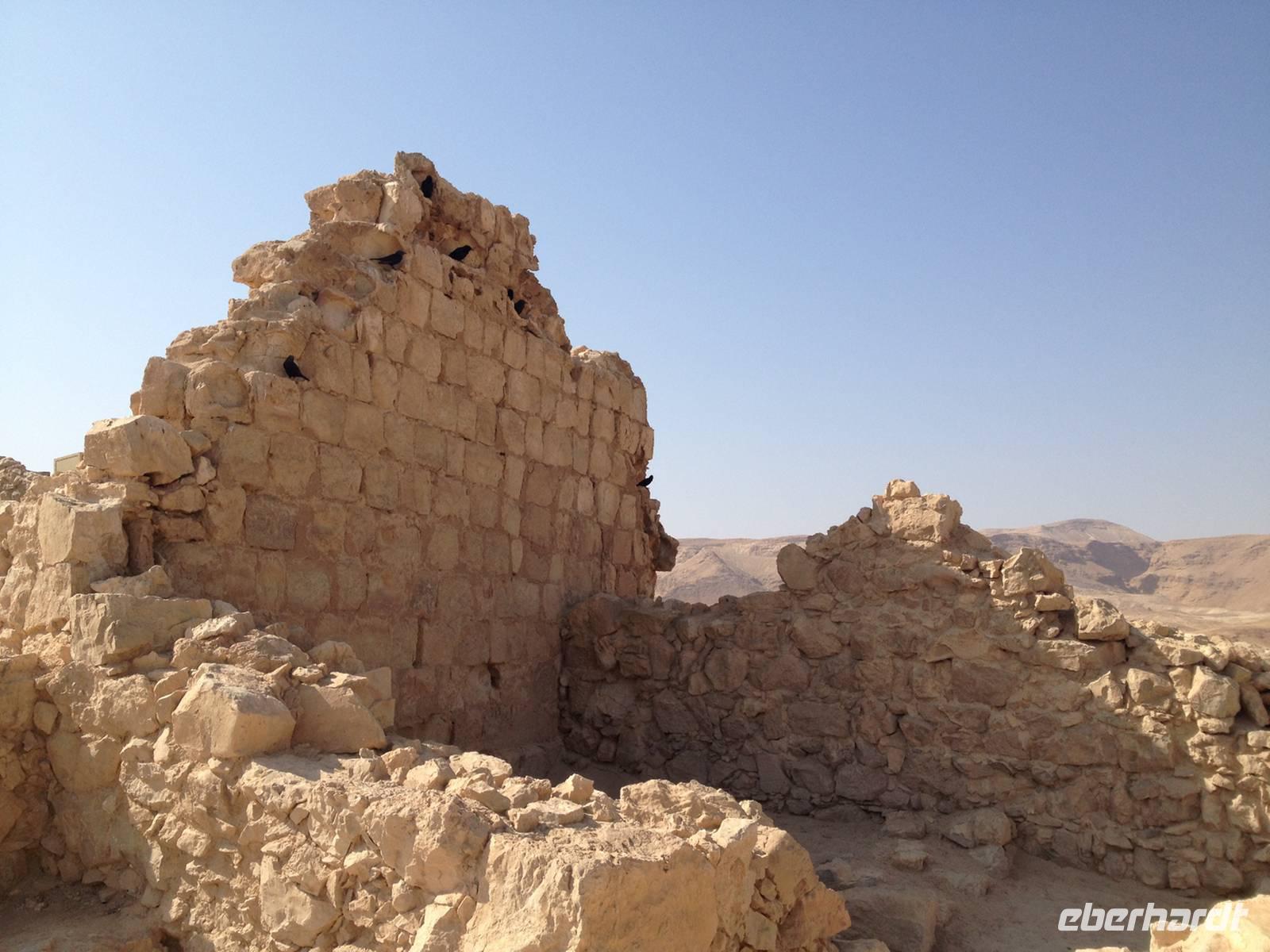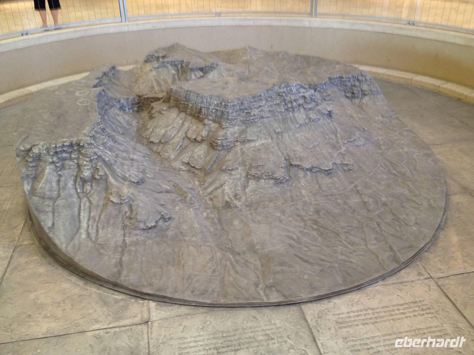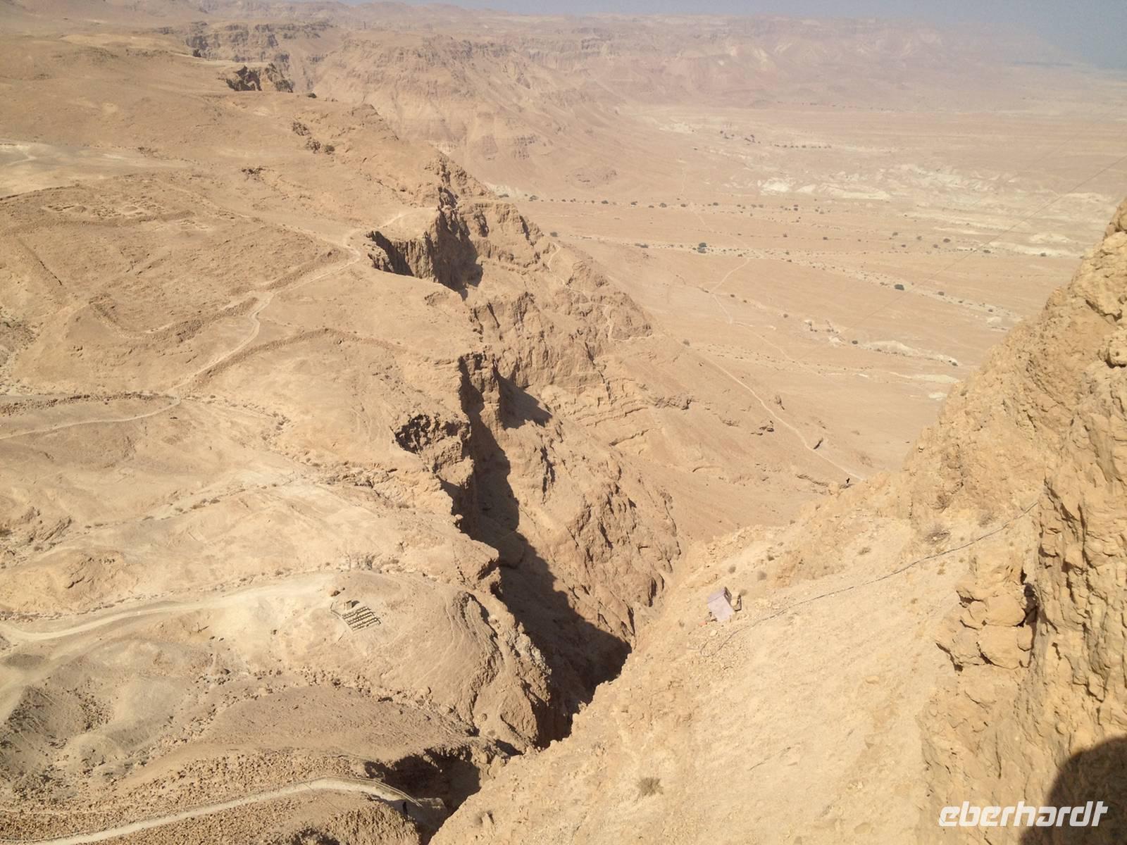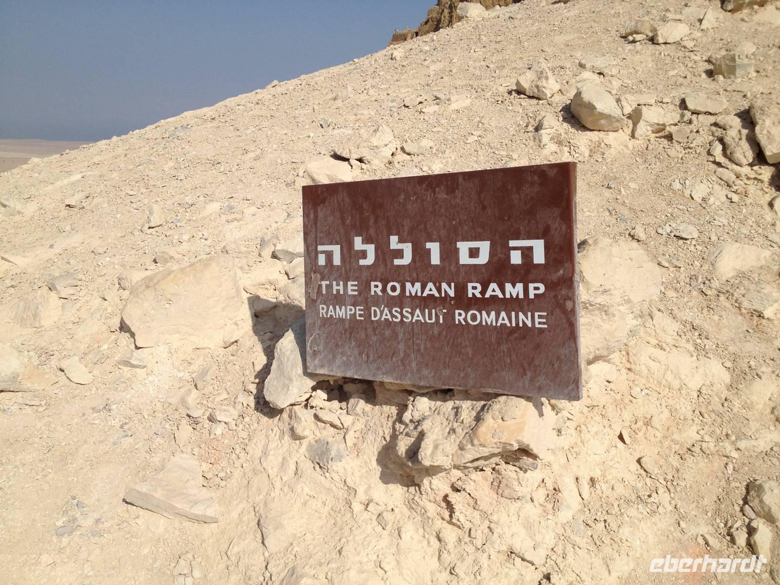 Nachdem wir mit der Seilbahn auf das 440 Meter hohe Plateau fuhren, konnten wir uns die Ereignisse, die sich in den Jahren 72 und 73 zutrugen und den Mythos Masada begründen, gleich lebhaft vorstellen. Von hier oben konnte man die ganze Gegend wunderbar überblicken: Ringsum zu Füßen des Bergmassivs sahen wir den Erdwall, der von den Römern als Umzingelung aufgeschüttet wurde. Und wie Perlen auf der Schnur liegen die steinernen Schutzwälle von insgesamt acht Truppenlagern des römischen Statthalters von Judäa, Flavius Silva. Im Westen zeigten sich die zu einer Rampe aufgeschütteten Erdschichten, über die die X. Legion die Festung schließlich stürmte. Und nach unserem Rundgang „stürmten" wir als Eberhardt-Legion die Römische Rampe erneut, um auf der anderen Seite wieder in unseren Bus zu kommen.