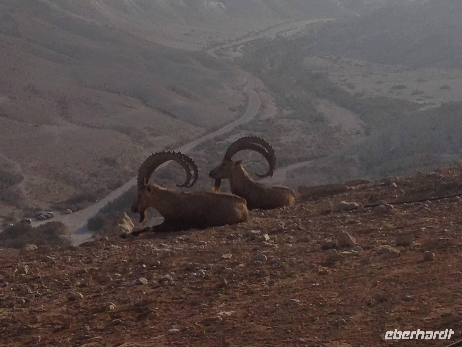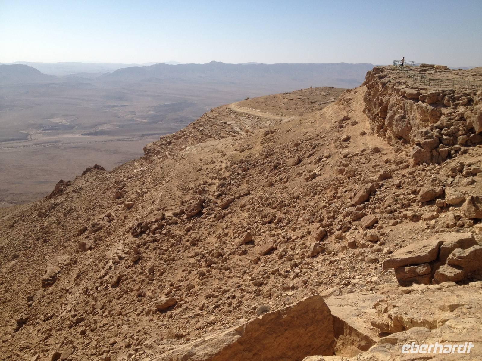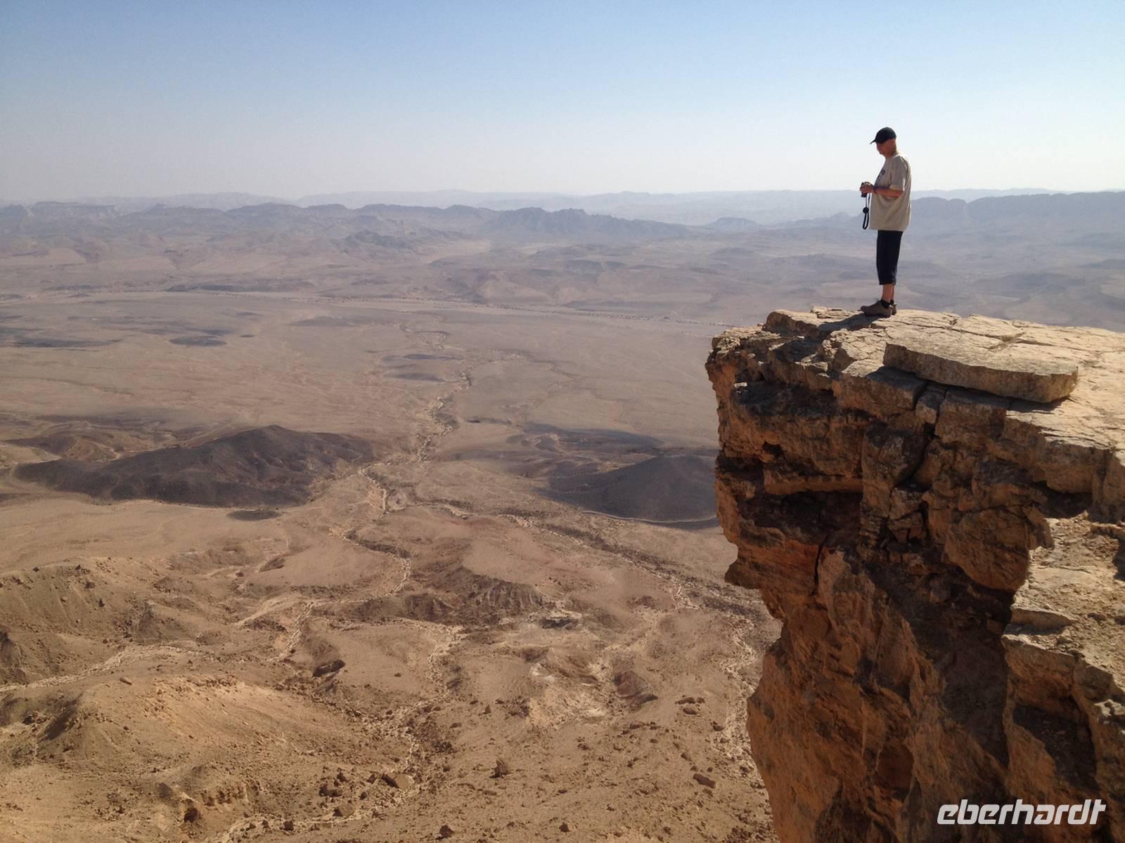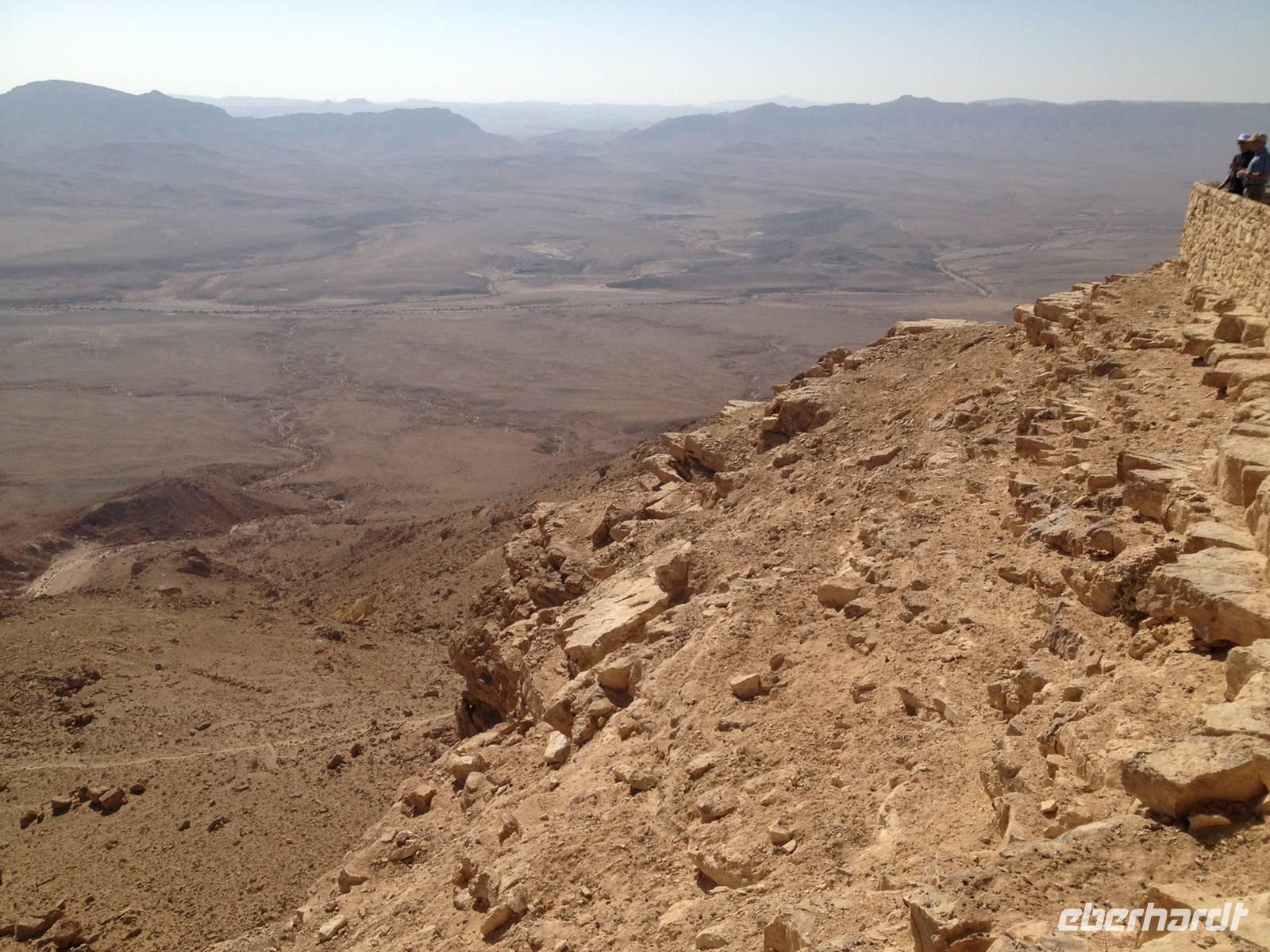 In der Mitte der Wüste liegt der gewaltige Ramonkrater. Mit einem Durchmesser von bis zu 40 Kilometern und einer Tiefe von 1000 Metern zählt er zu den einzigartigen Sehenswürdigkeiten Israels. Wir schlängelten uns die Serpentinenstraße hinauf zum Kraterrand und spazierten diesen entlang bis zu einer Aussichtsplattform. Einfach gigantisch!