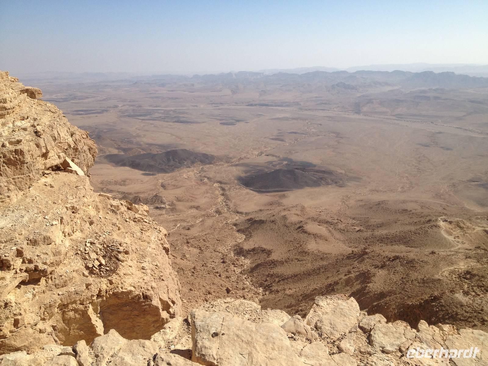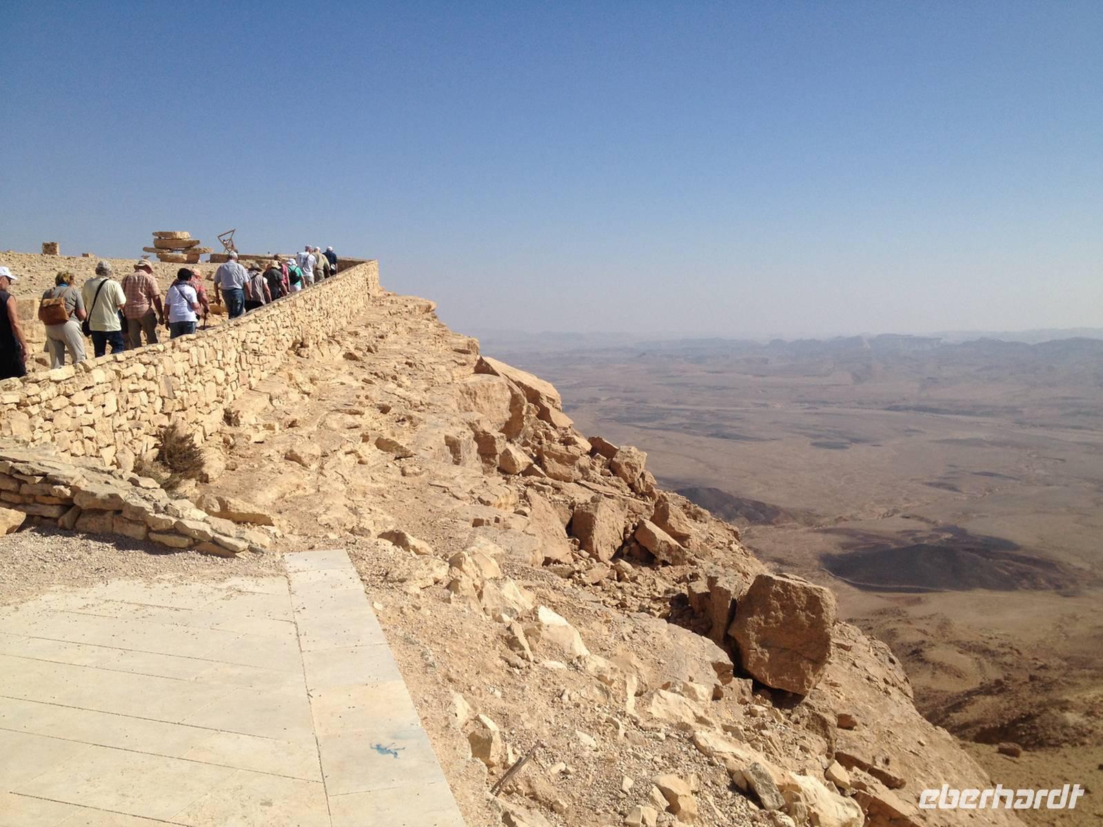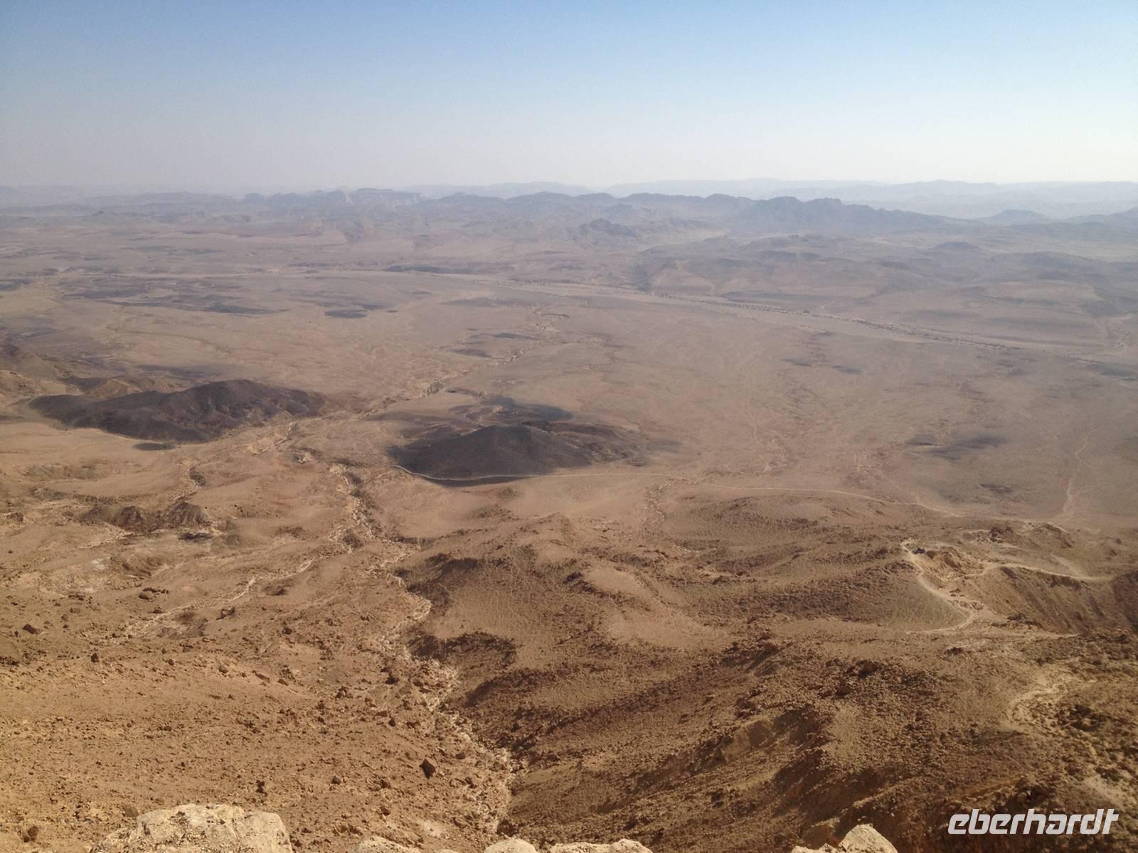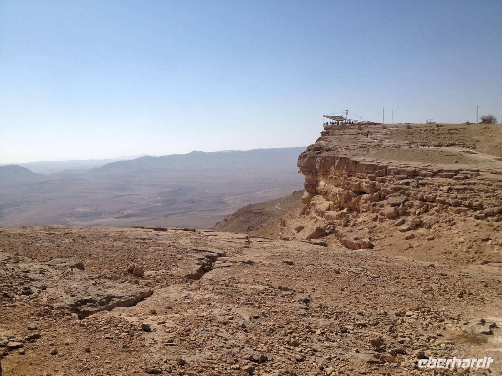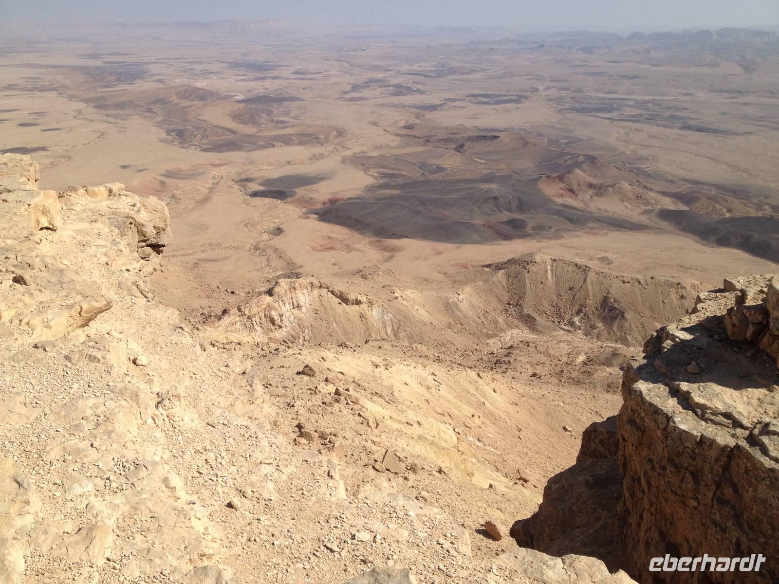In der Mitte der Wüste liegt der gewaltige Ramonkrater. Mit einem Durchmesser von bis zu 40 Kilometern und einer Tiefe von 1000 Metern zählt er zu den einzigartigen Sehenswürdigkeiten Israels. Wir schlängelten uns die Serpentinenstraße hinauf zum Kraterrand und spazierten diesen entlang bis zu einer Aussichtsplattform. Einfach gigantisch!
