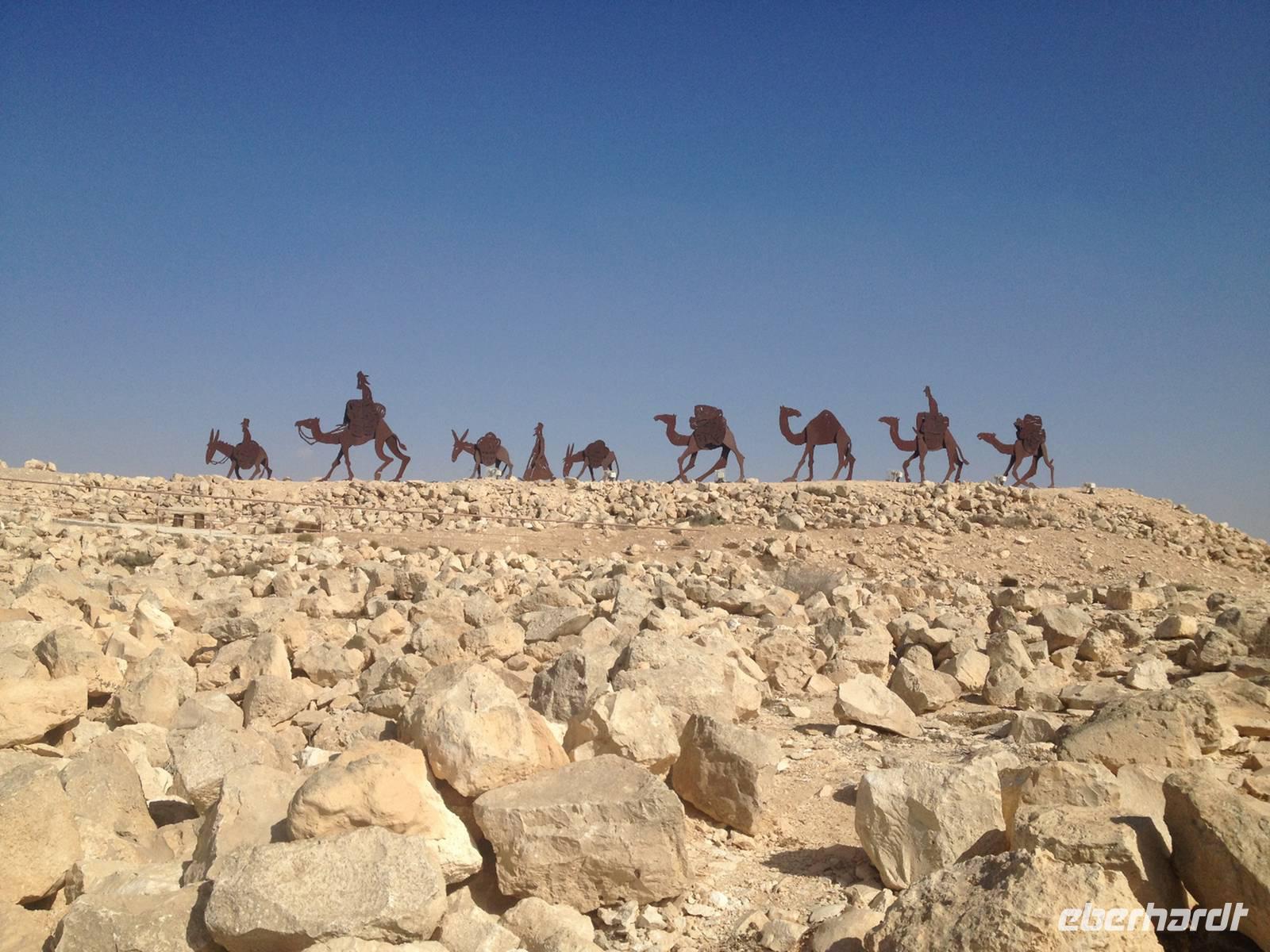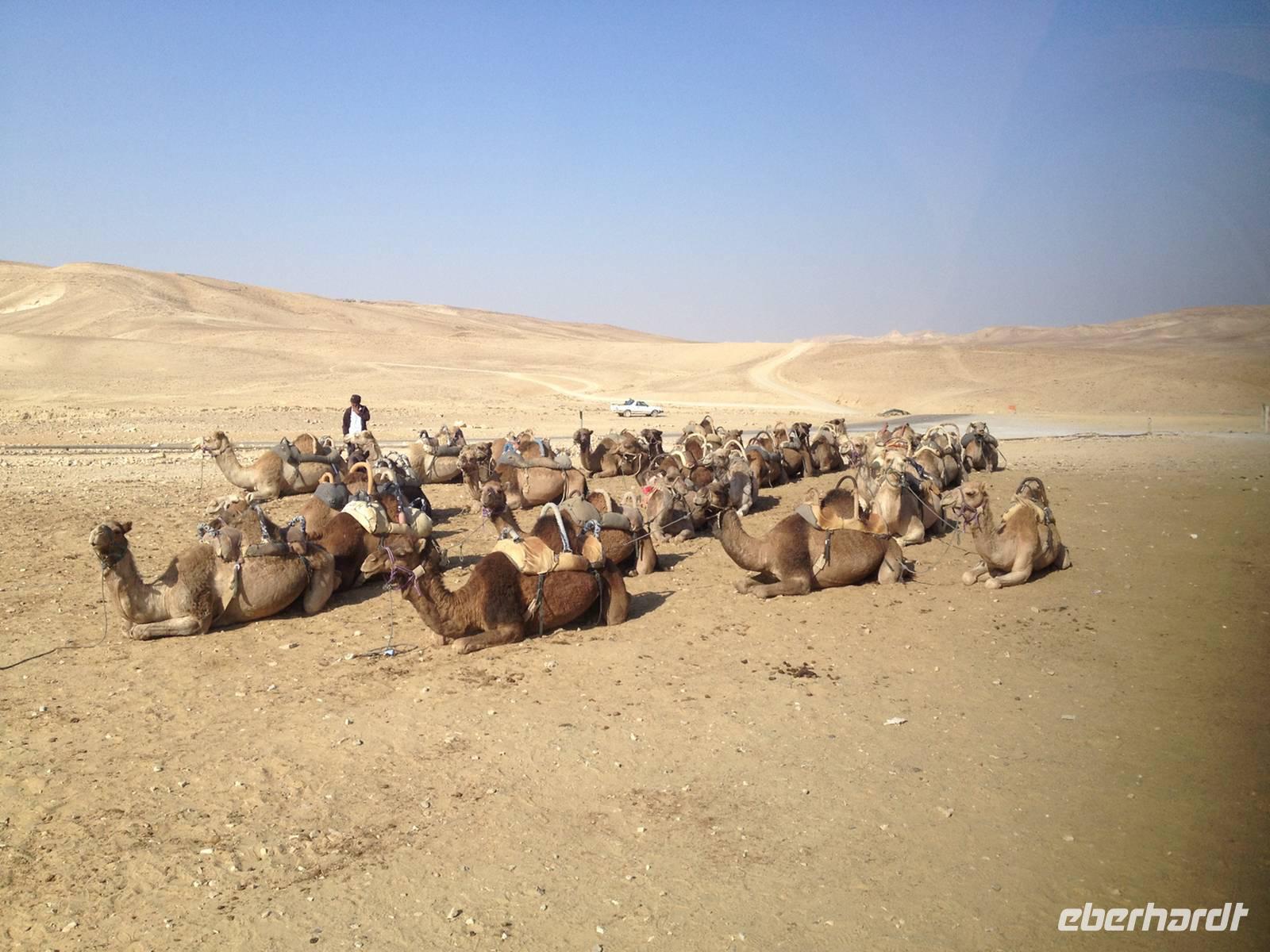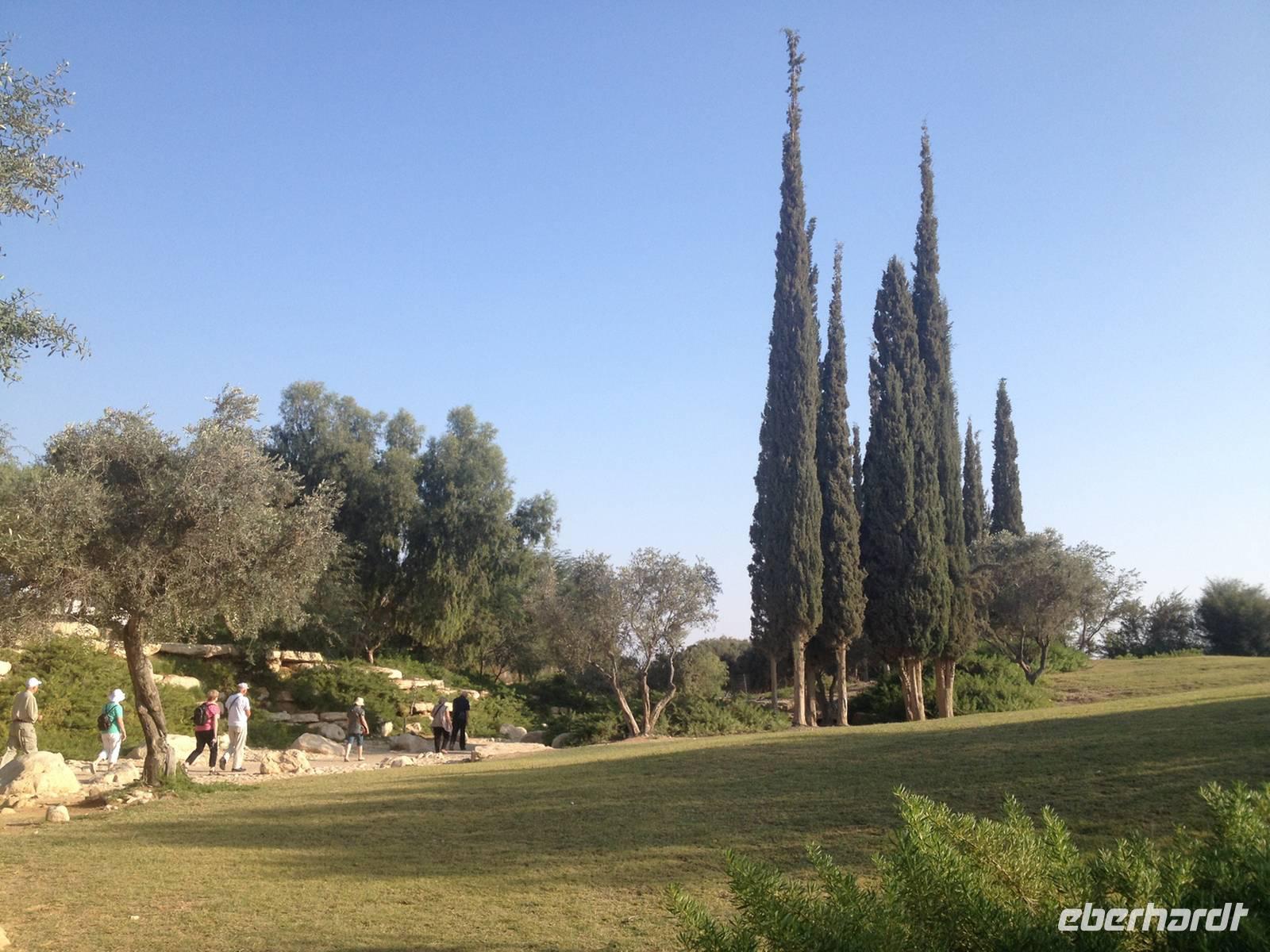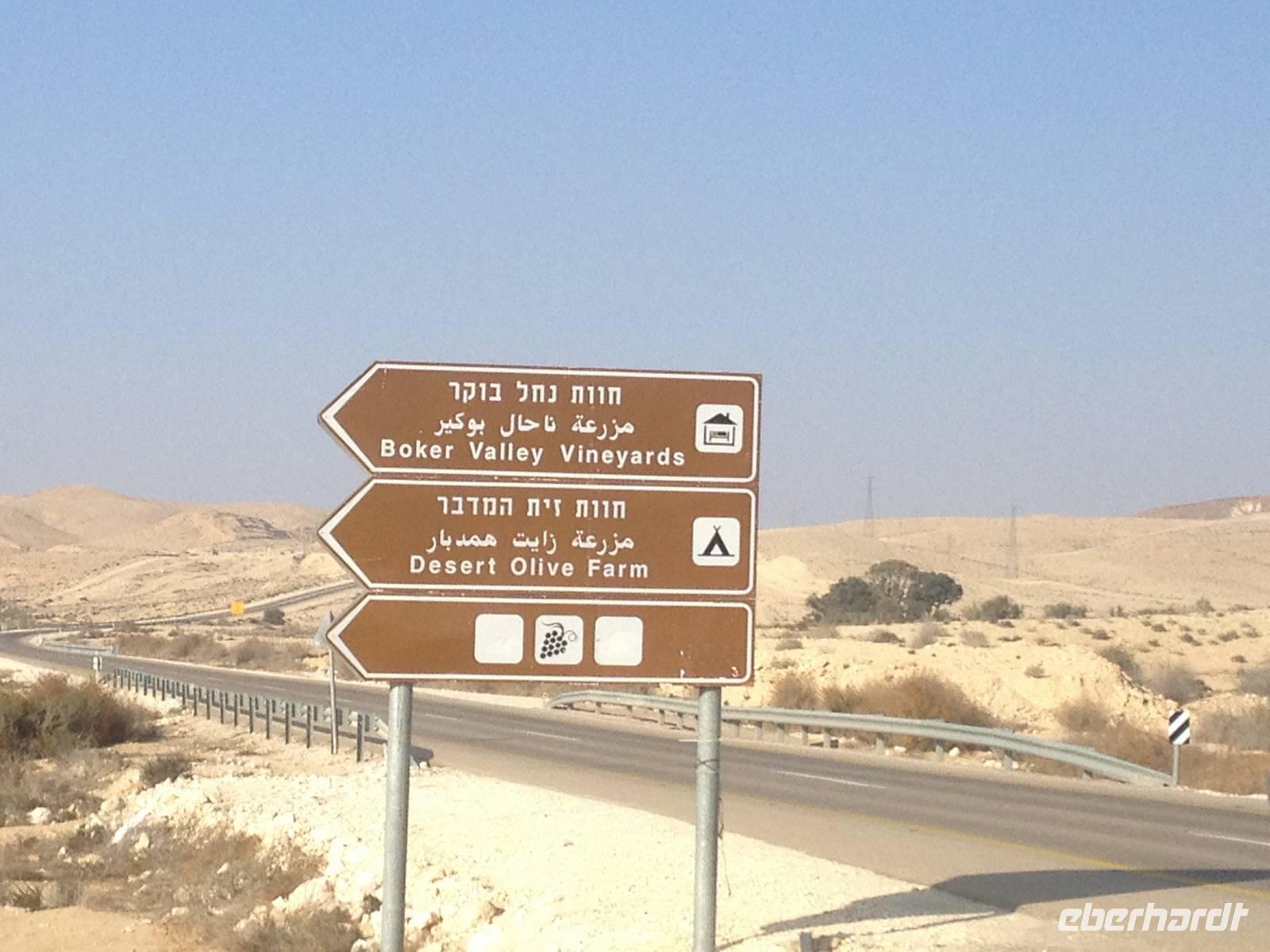 Obwohl die Negev-Wüste eigentlich zu Israels unfruchtbarsten Gebieten gehört, findet man hier viele Weinberge. Dass hier überhaupt von einer Weinbauregion gesprochen werden kann, liegt an der ungeheuren Anstrengung der ansässigen Winzer, unter ständiger Berieselung der Wüste kleine fruchtbare Oasen abzuringen, in denen auch widerstandsfähige Trauben gedeihen können. Trotz der widrigen Umstände findet hier also Weinbau statt und führt zu Ergebnissen, die zwar erstaunen, für den internationalen Markt aber nicht ausreichend sind, zumindest noch nicht. Auf der „Boker Valley Vineyards Farm" legten wir einen kleinen Stopp ein, kosteten den hier selbst angebauten Wein und erhielten viele Informationen des Winzers. Eine kleine Überraschung von Eberhardt TRAVEL, die sehr gut ankam.