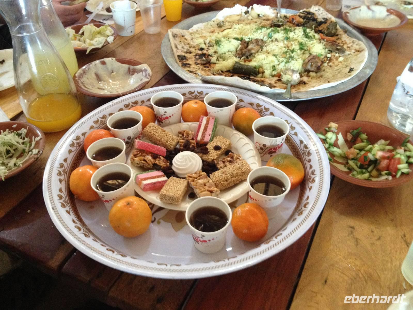 Denn nach so vielen, sehr beeindruckenden Erlebnissen hatten wir ein wenig Hunger. Said stand schon bereit und so konnten wir gleich in Richtung Beduinencamp aufbrechen. In Kfar Hanokdim, inmitten der Wüste, wurden wir zum Mittagessen bereits erwartet und mit typischen Mahlzeiten im Beduinenzelt kulinarisch verwöhnt. Pita-Brot, Salate, Lamm, Hühnchen und Reis waren sehr lecker!