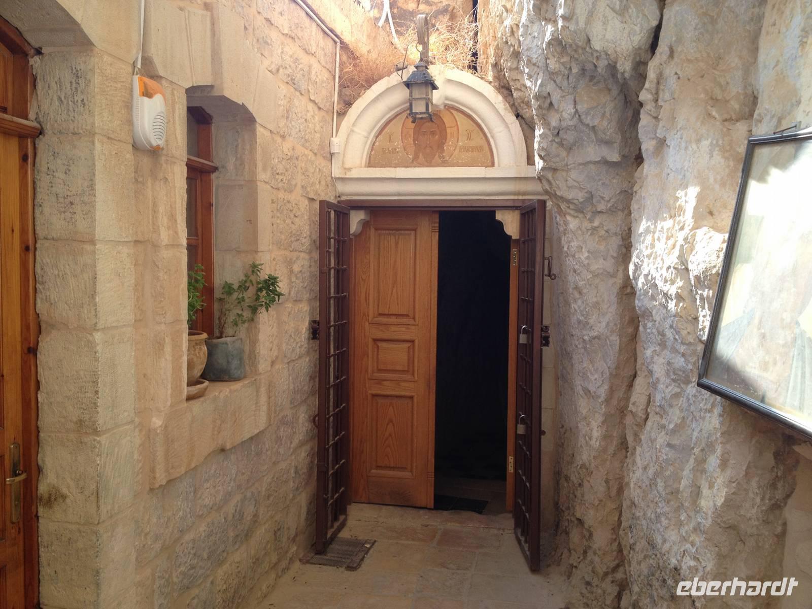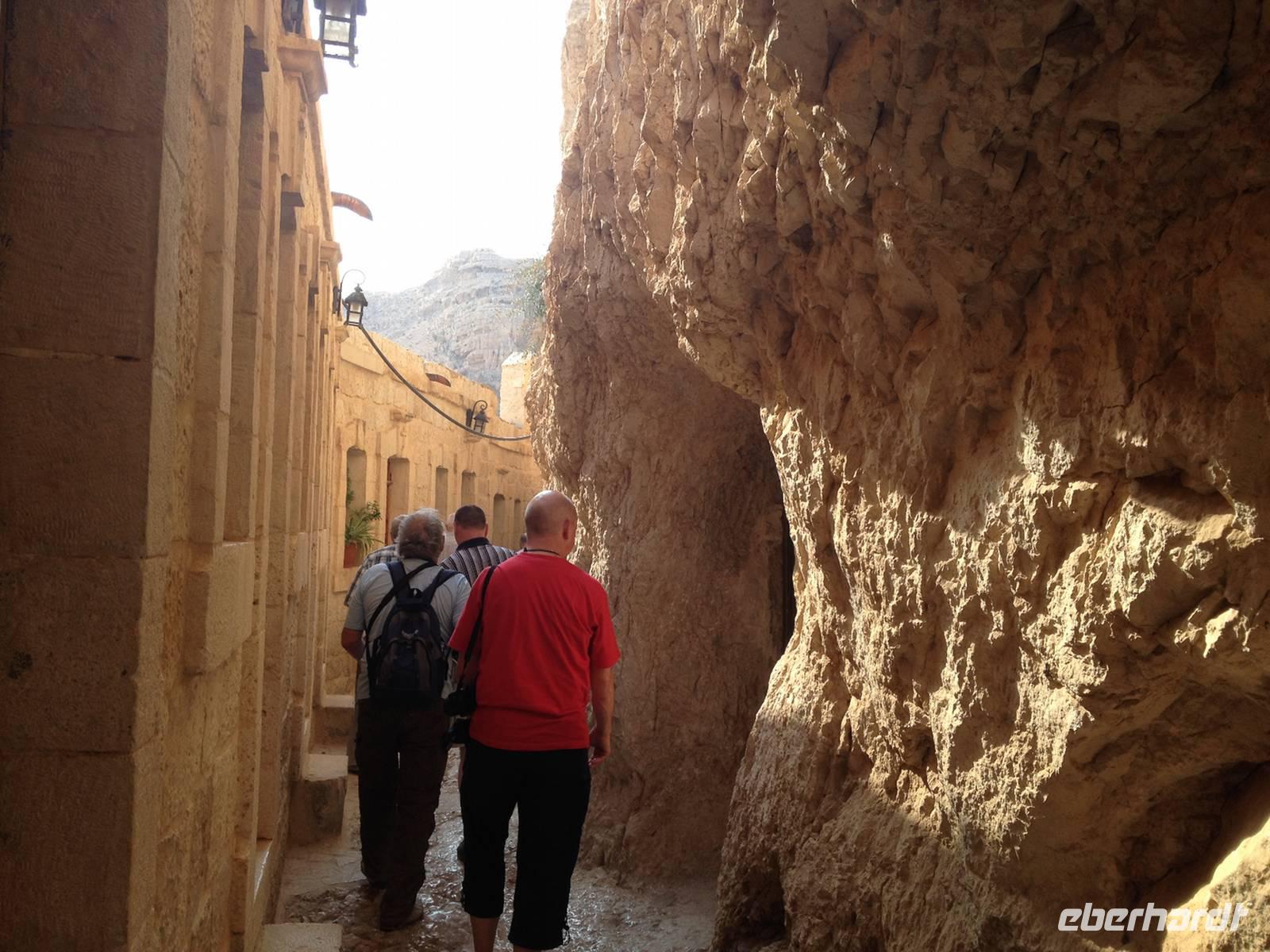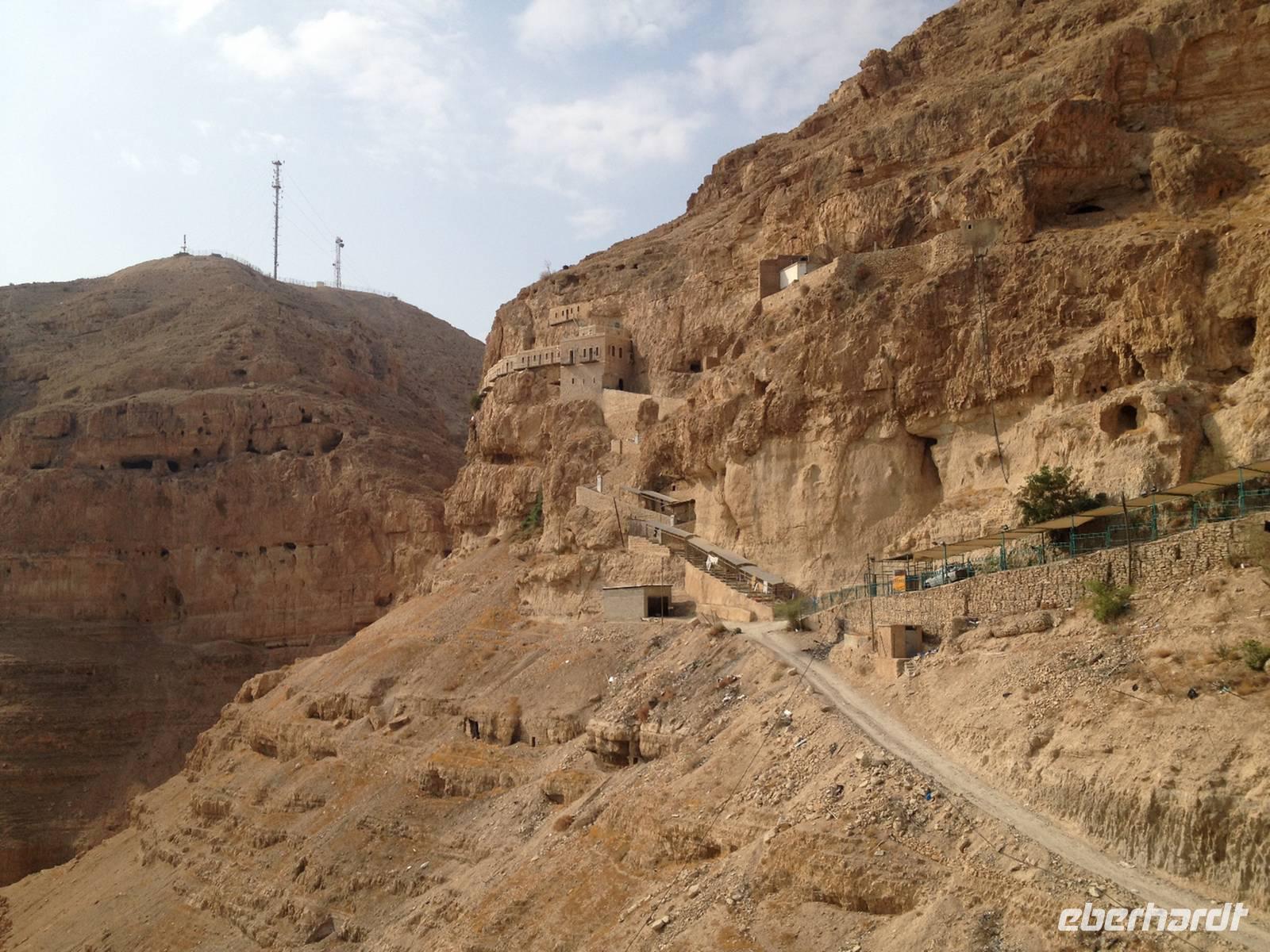 Und hier, mitten im Westjordanland hütet Mönch Gerasimus eine wichtige christliche Pilgerstätte - den Berg der Versuchung! An einer steilen Felswand wurde das Kloster Qarantal errichtet. Mit der neuen Seilbahn erleichterten wir uns den Weg hinauf auf den 348 m hohen Berg. Nachdem wir das Kloster betraten, fühlten wir uns wie in einem kleinen Dorf. Durch eine enge Gasse erreichten wir eine kleine Kapelle sowie einen Balkon, auf dem wir uns über den biblischen Zusammenhang unterhielten. An diesem Ort soll Jesus 40 Tage lang gefastet haben und vom Teufel in Versuchung geführt worden sein.Vater Gerasimus lebt seit 30 Jahren in diesem griechisch-orthodoxen Kloster. Als letzter Mönch behütet er es inmitten des muslimischen Palästina. Trotz der Bedeutung des Klosters für das Christentum verirren sich nur wenige Pilger durch die nach Palästina. Da der 80-Jährige die neue, rote Seilbahn nicht unbedingt mag, geht er deshalb den mühsamen Weg von der Stadt bis ins Kloster weiterhin zu Fuß.