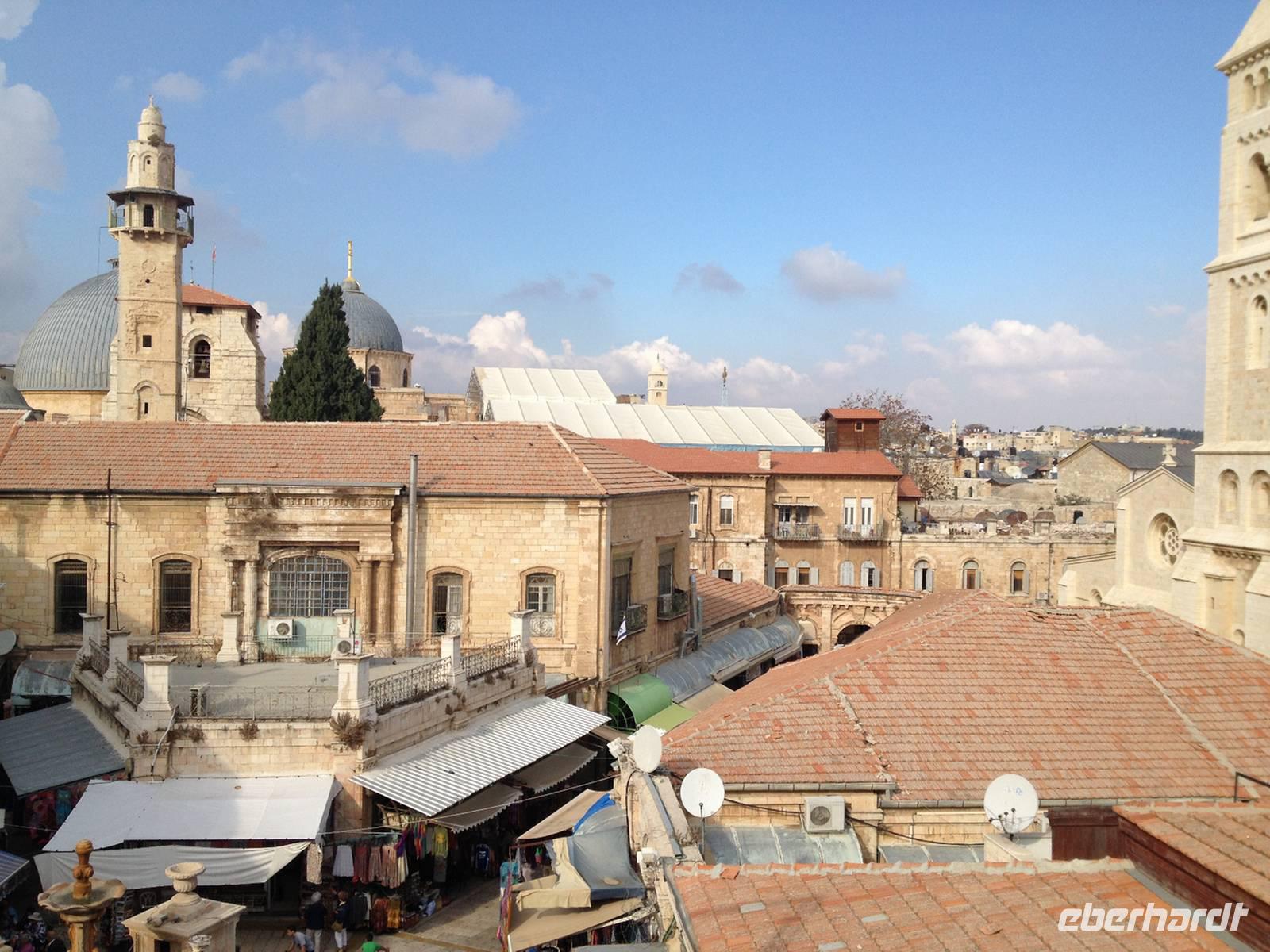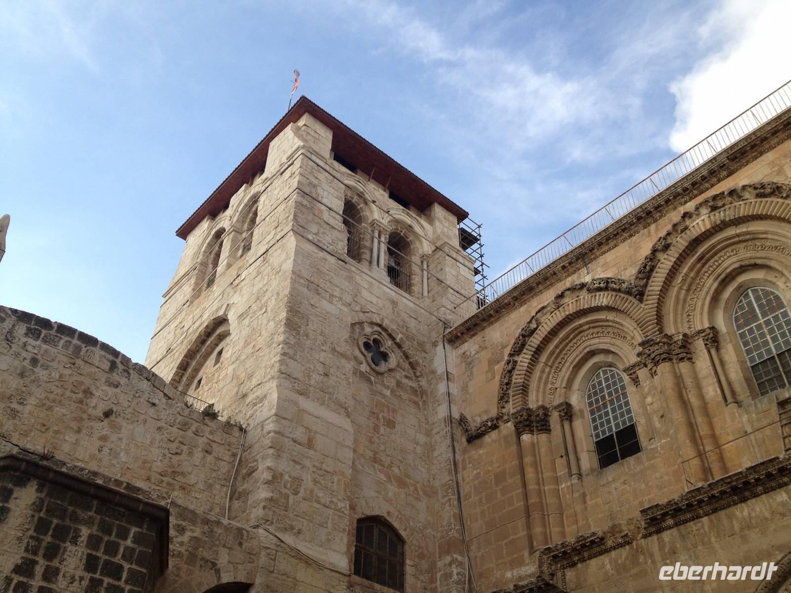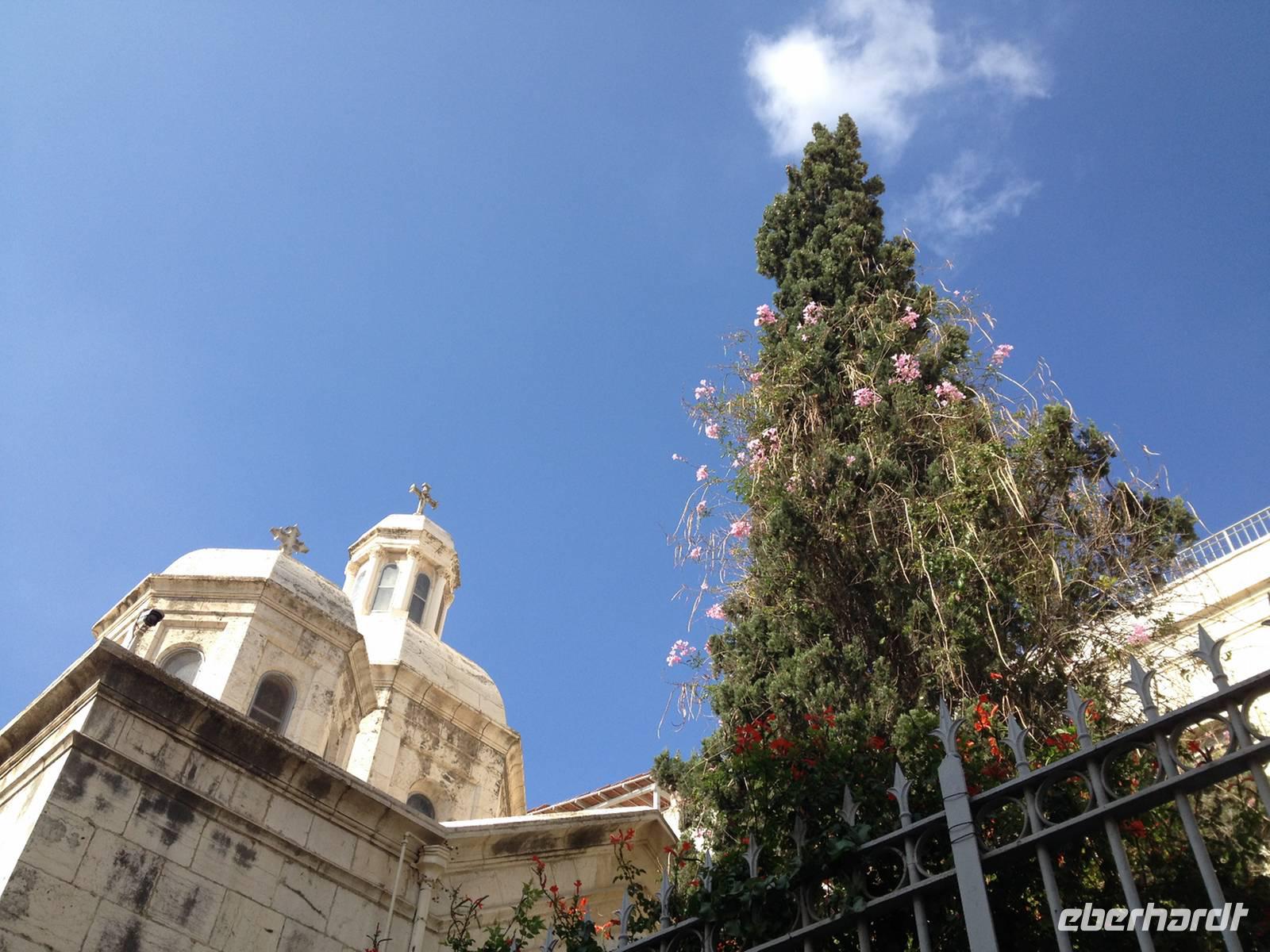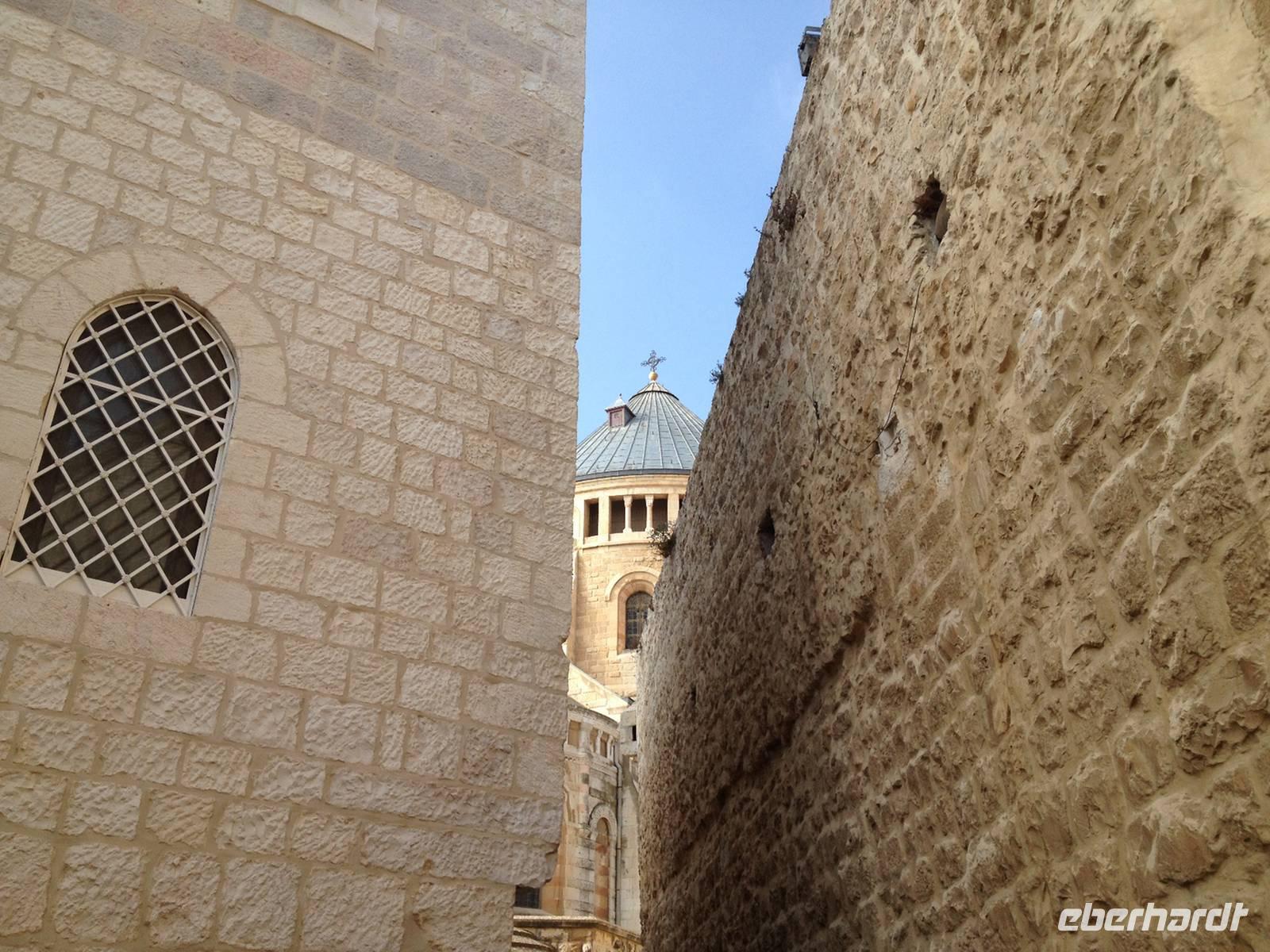 Heute ist die Grabeskirche in der Hand sechs christlicher Konfessionen und dementsprechend konfliktreich geht es hier zu. Von David erfuhren wir schließlich noch, was die Holzleiter über dem Eingang zur Grabeskirche zu bedeuten hat.