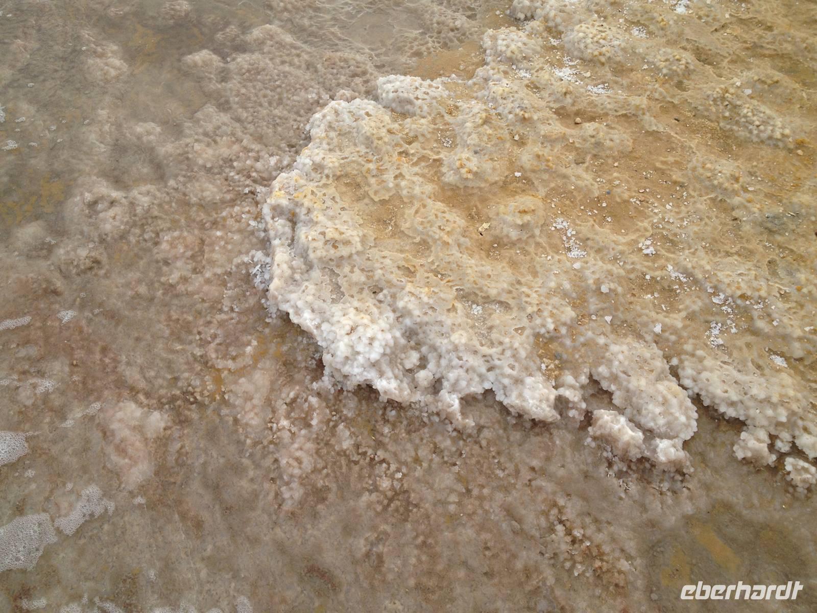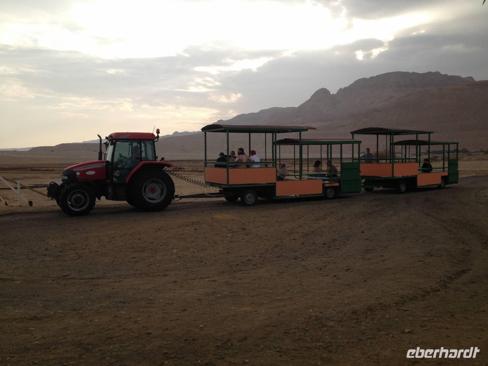 Von hier aus waren wir dann in wenigen Minuten im Ein Gedi Spa, ein beliebter Ort, um ein Bad im Toten Meer zu erleben. Da sich das Tote Meer durch die hohe Verdunstung und den wenigen Zulauf aus dem See Genezareth und Jordan immer mehr zurückzieht, befindet sich der Zugang zum Meer nun fast 1 km vom Spa-Bereich entfernt. Mit einem Shuttle-Traktor wurden wir jedoch zum Strand gebracht und konnten nun im mineralhaltigen und sehr gesunden Wasser schweben! Ja, es funktioniert wirklich! Ein seltsames Gefühl und ein tolles Erlebnis zugleich. Der heilende Schlamm, der sich sehr angenehm auf der Haut anfühlt, war auch sehr begehrt!