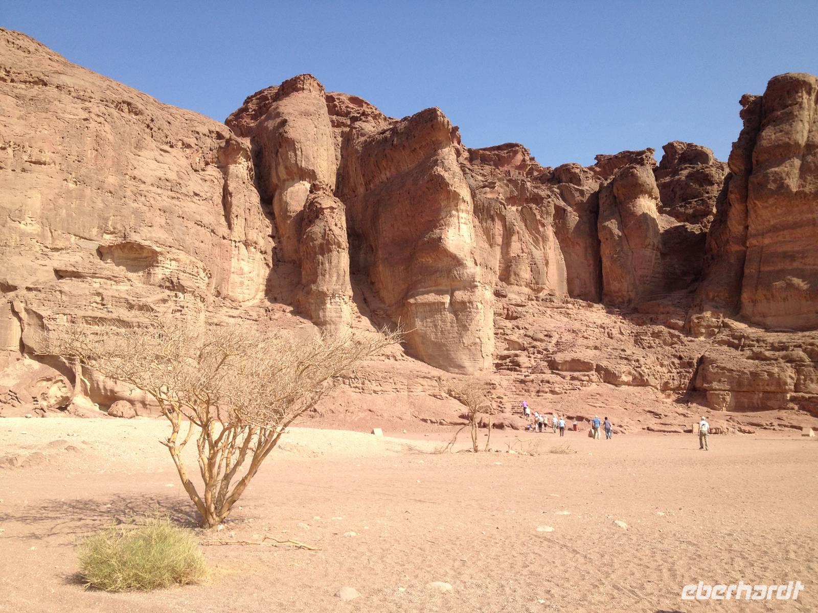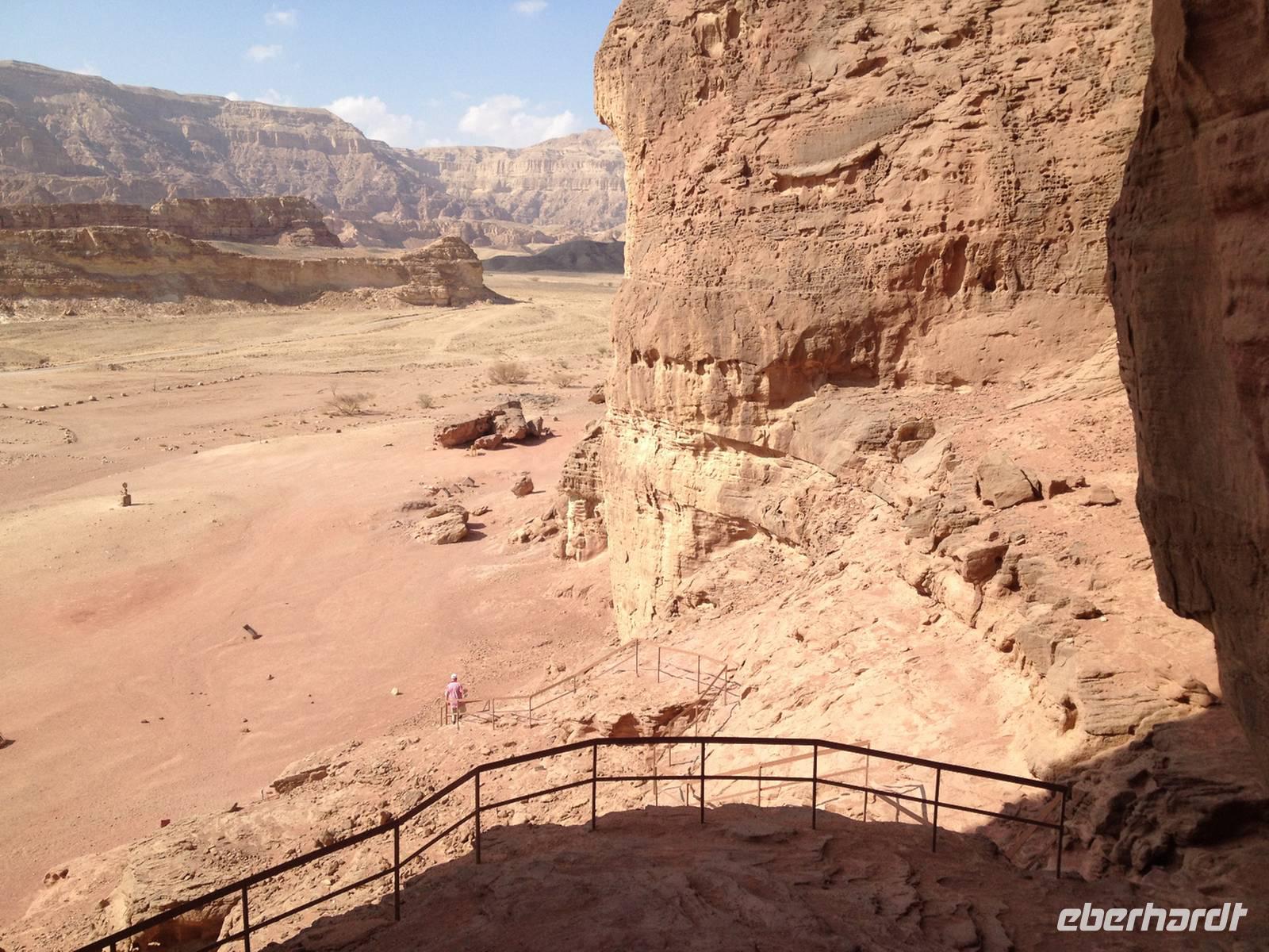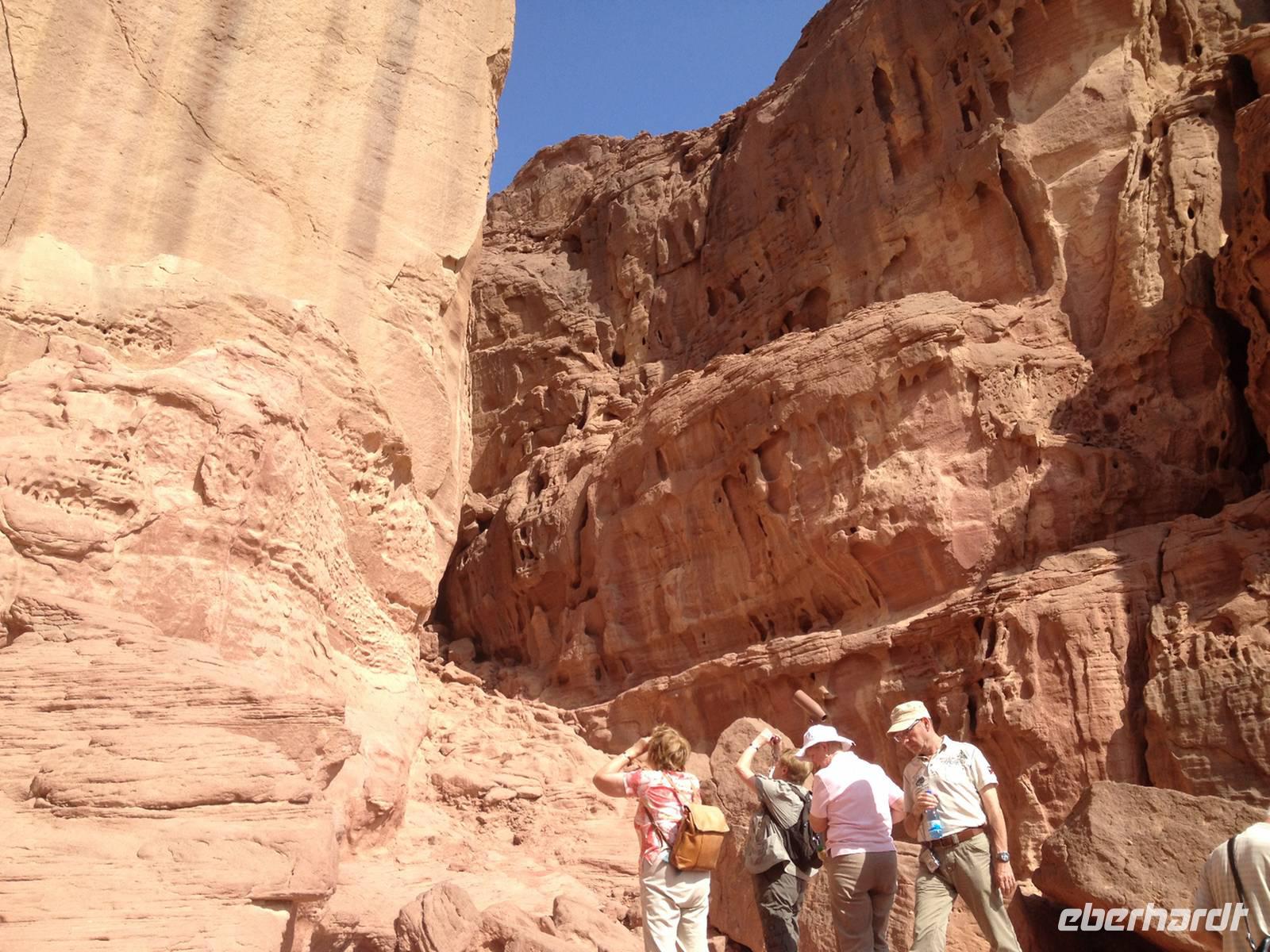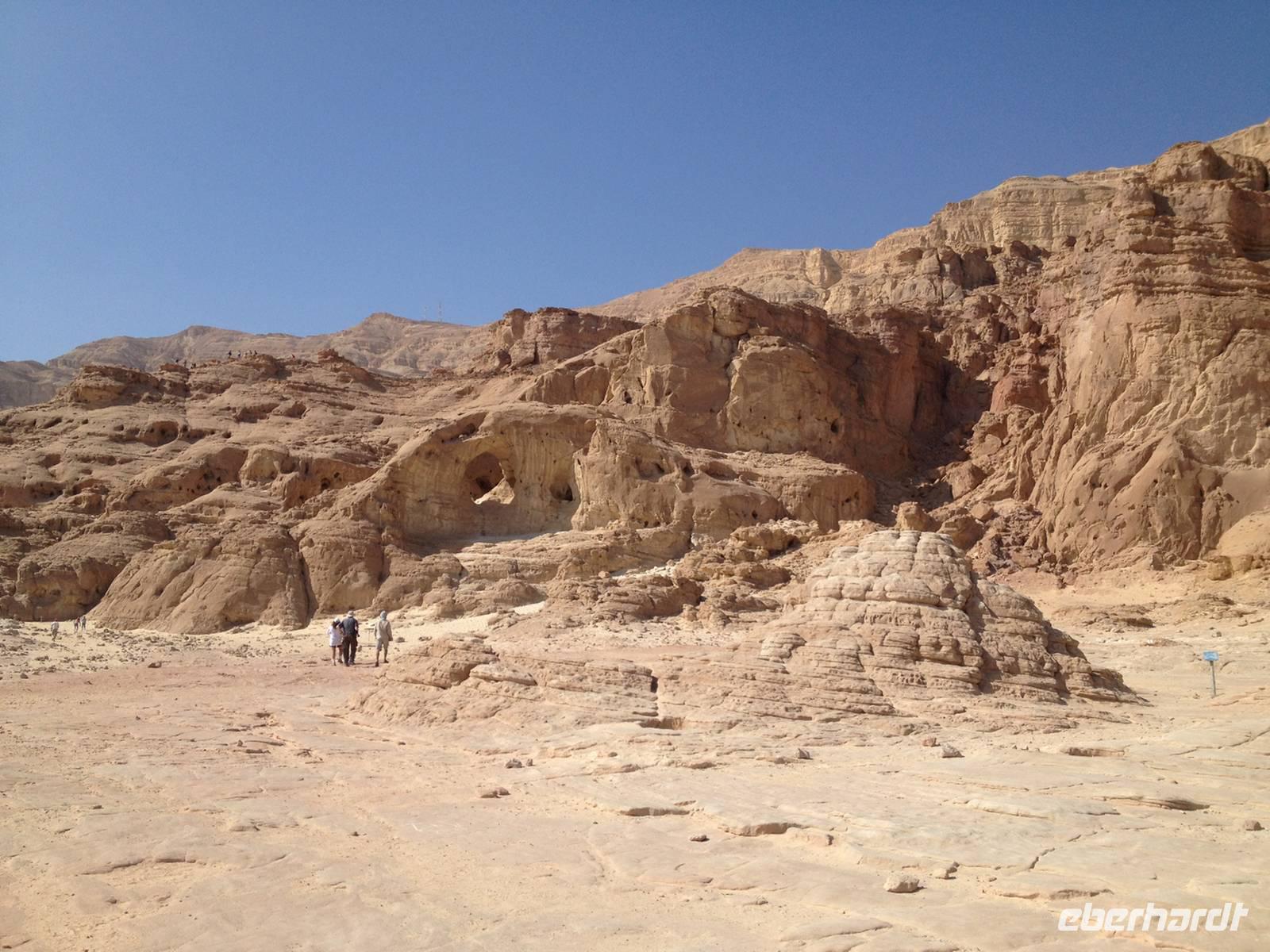 Eine kurze Wanderung führte uns anschließend direkt durch Salomons Säulen, um das in den Stein gemeißelte Bild der ägyptischen Göttin Hathor anzuschauen, sowie zu ihrem antiken Schrein am Fuß der Klippen auf der anderen Seite.