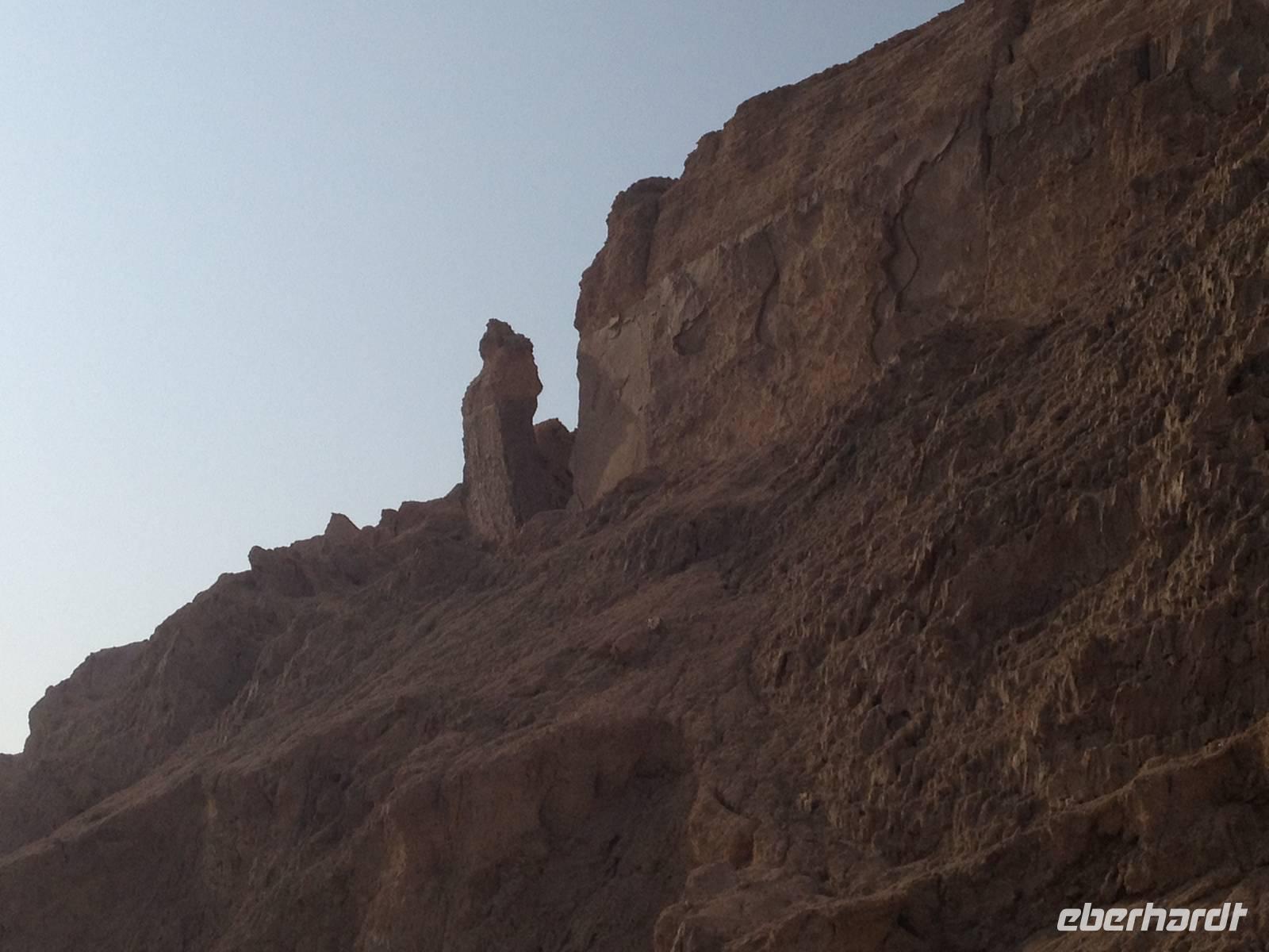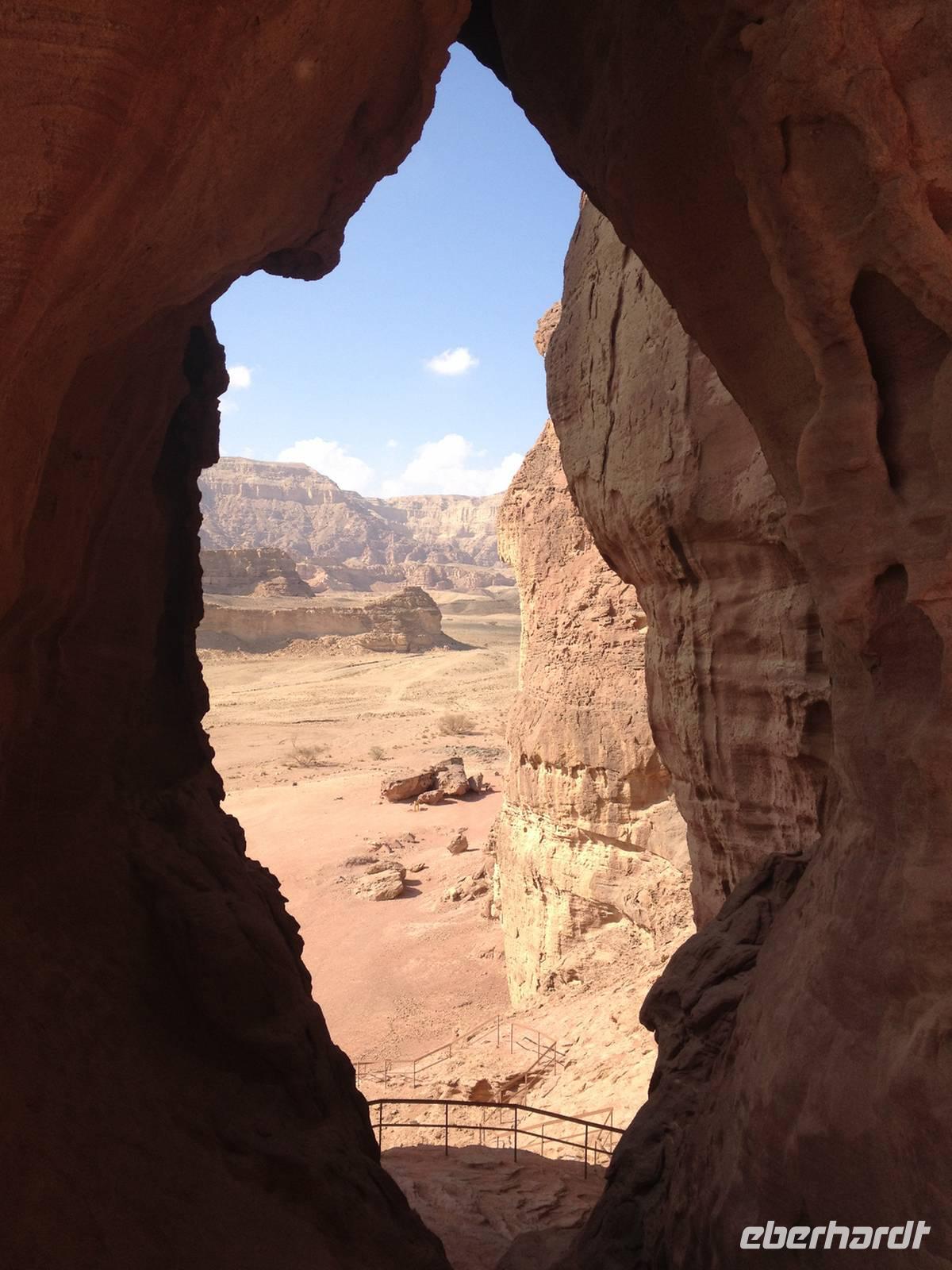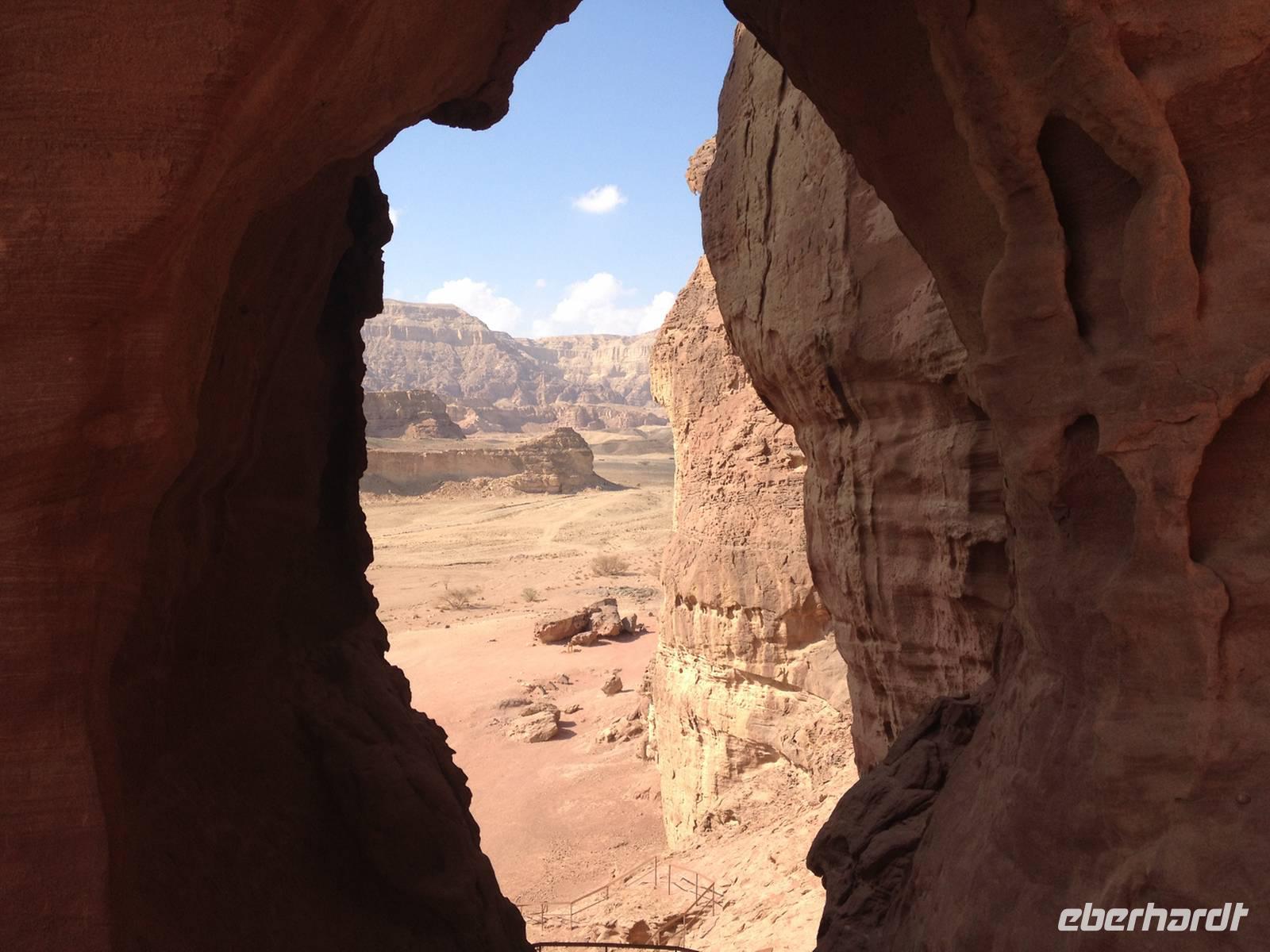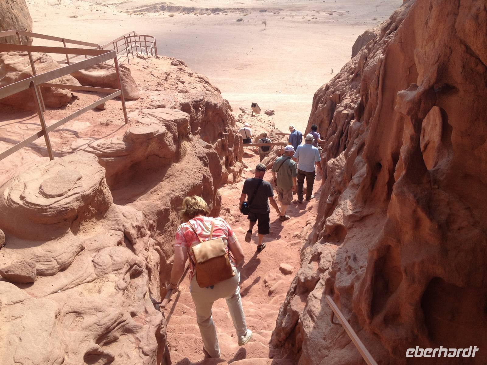 Eine kurze Wanderung führte uns anschließend direkt durch Salomons Säulen, um das in den Stein gemeißelte Bild der ägyptischen Göttin Hathor anzuschauen, sowie zu ihrem antiken Schrein am Fuß der Klippen auf der anderen Seite.