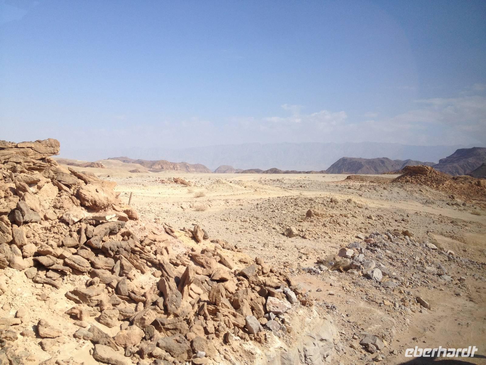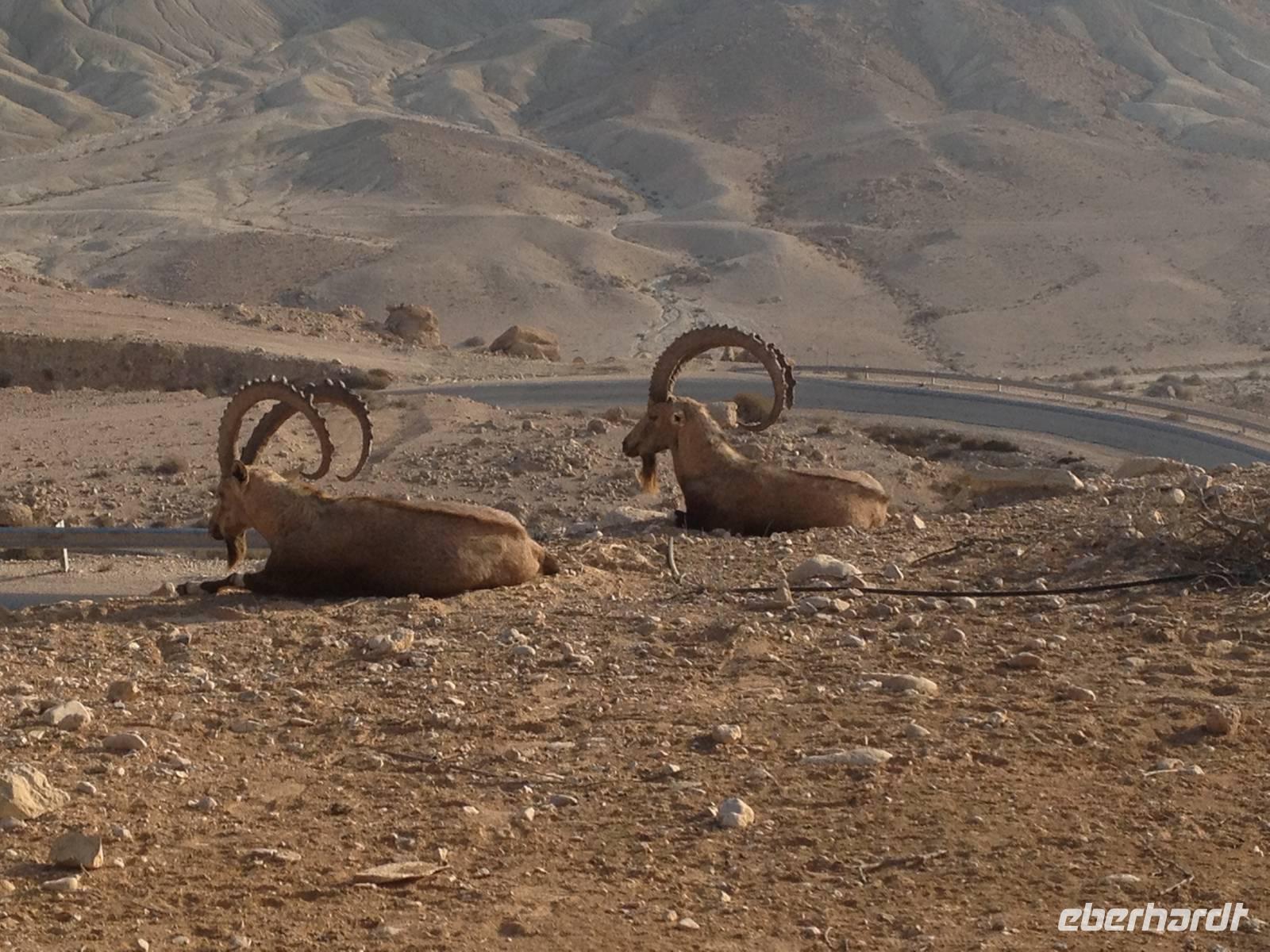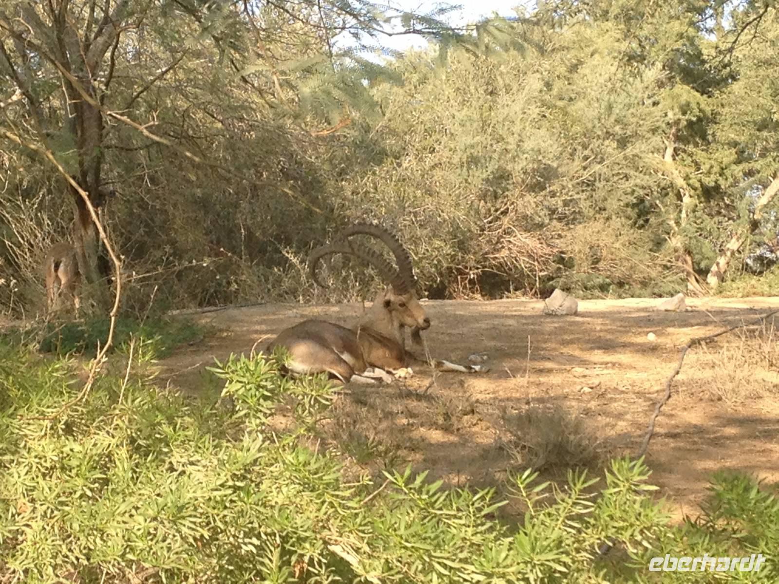 Zunächst führten uns Said und David an die israelisch-ägyptische Grenze zur Halbinsel Sinai, wobei wir die die Beziehungen beider Länder diskutierten. Wenige Kilometer nördlich von Eilat sahen wir Chai Bar Jotvata, ein ca. 12 Quadratkilometer großes Zucht- und Ansiedlungszentrum in der Arava-Wüste. In diesem Park werden vor allem bedrohte Huftiere gehalten, die einst in den Wüstenregionen Israels heimisch waren. So werden Arabische(weiße) Oryxantilopen, Afrikanische Strauße und Halbesel unter fast natürlichen Bedingungen gehalten, um sie an ein Leben in Freiheit zu gewöhnen.