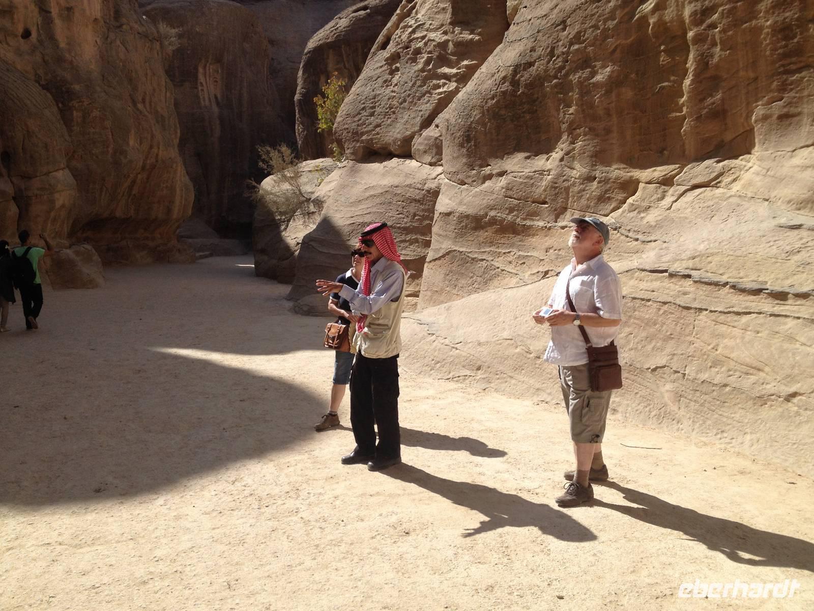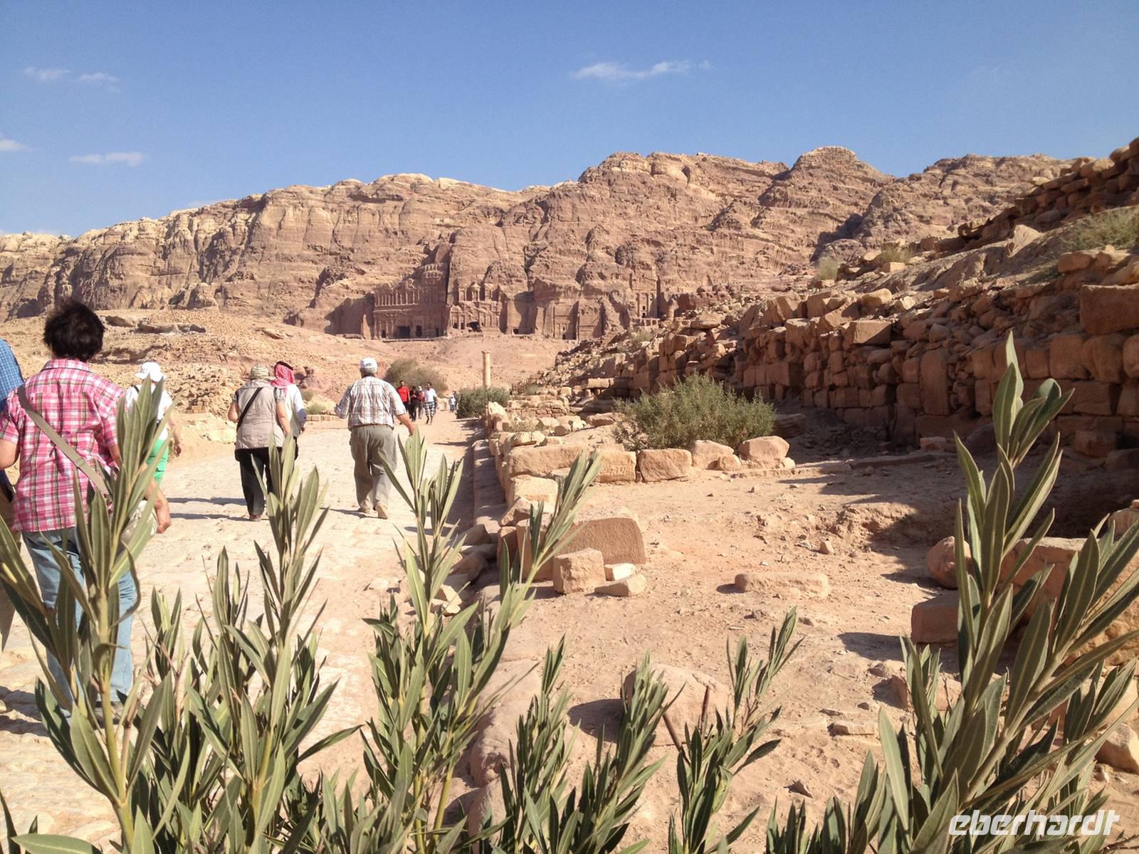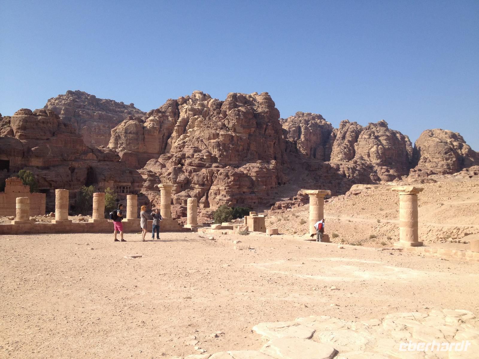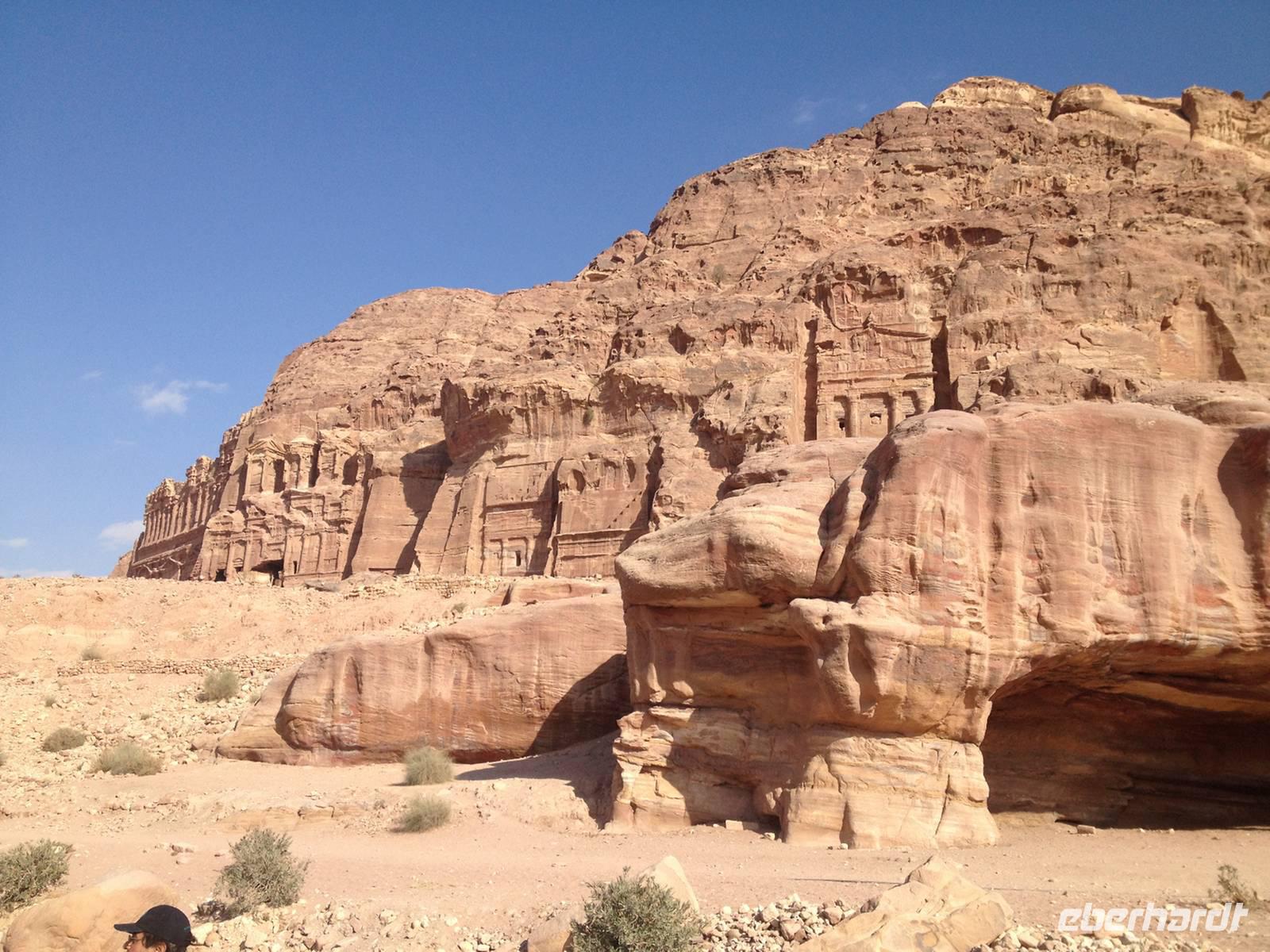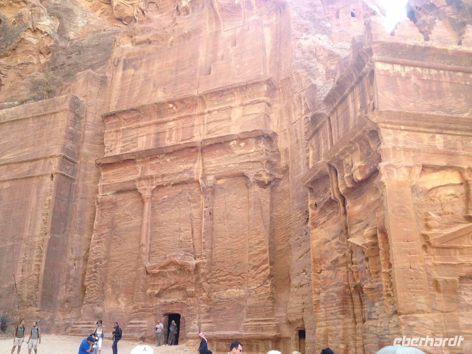 Wir stiegen nun etwas bergan und hatten einen grandiosen Blick auf die gegenüberliegenden Königsgräber. Vor allem das Urnengrab ist hier das eindrucksvollste Bauwerk. Die Sonne drückte ganz schön und wir erreichten nach einiger Zeit und vielen Erklärungen durch Mahmoud das Herz der damaligen Stadt. Um die Kolonnadenstraße befand sich ein geschäftiger Marktplatz, umsäumt von Läden und Wohnhäusern. Am Temenos-Tor haben wir den südlichsten Punkt unserer Runde erreicht. Die Kräfte ließen nun langsam nach und die Hitze machte uns etwas zu schaffen. Mit vielen einmaligen Augenblicken bummelten wir langsam zurück zum Schatzhaus und dann durch den Siq hinauf zum Bus. Gemeinsam mit Mahmoud reisten wir zurück nach Süden in Richtung Aqaba und zur Grenze, die wir nach der Verabschiedung von Mahmoud erneut zu Fuß passierten. Said wartete schon auf uns und pünktlich zum Abendessen waren wir zurück im Hotel.
