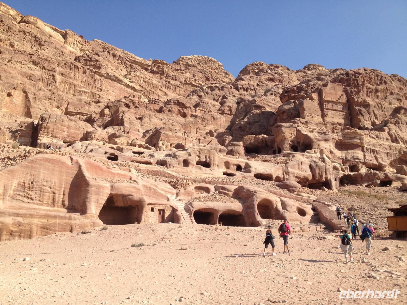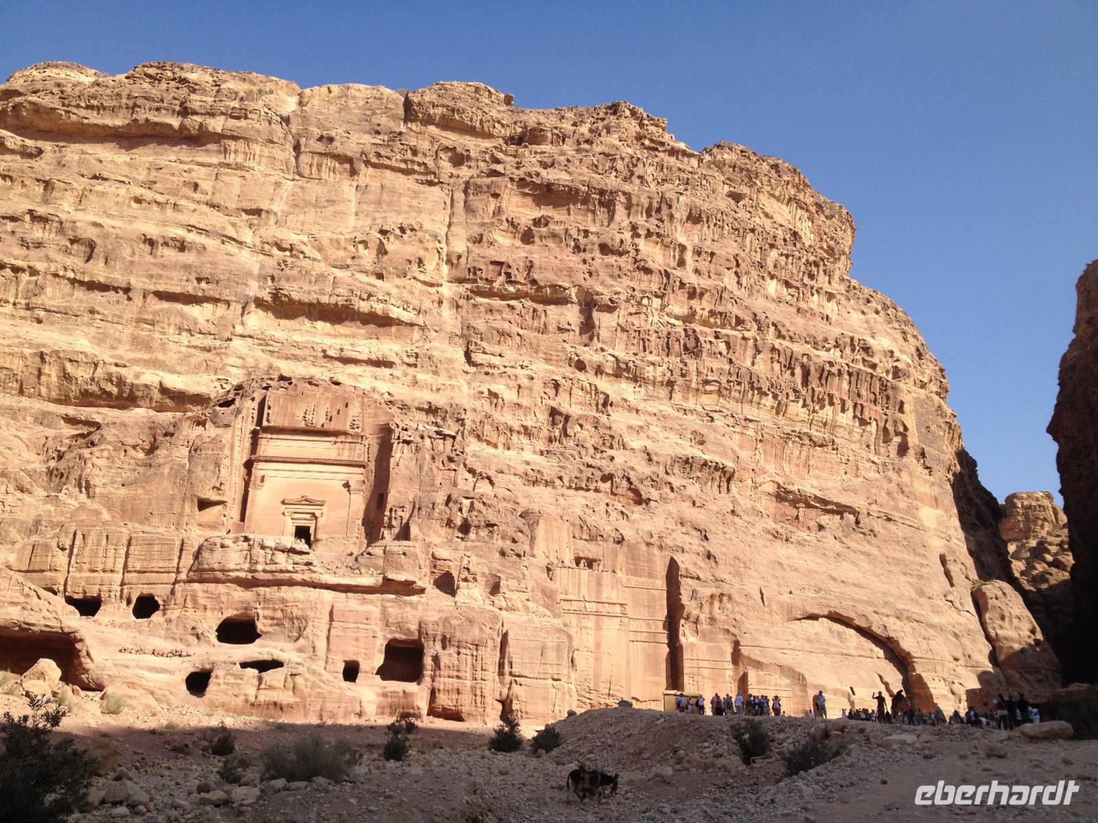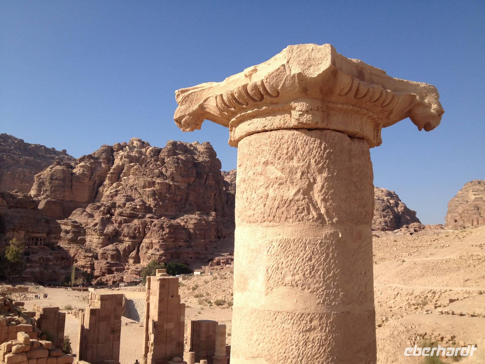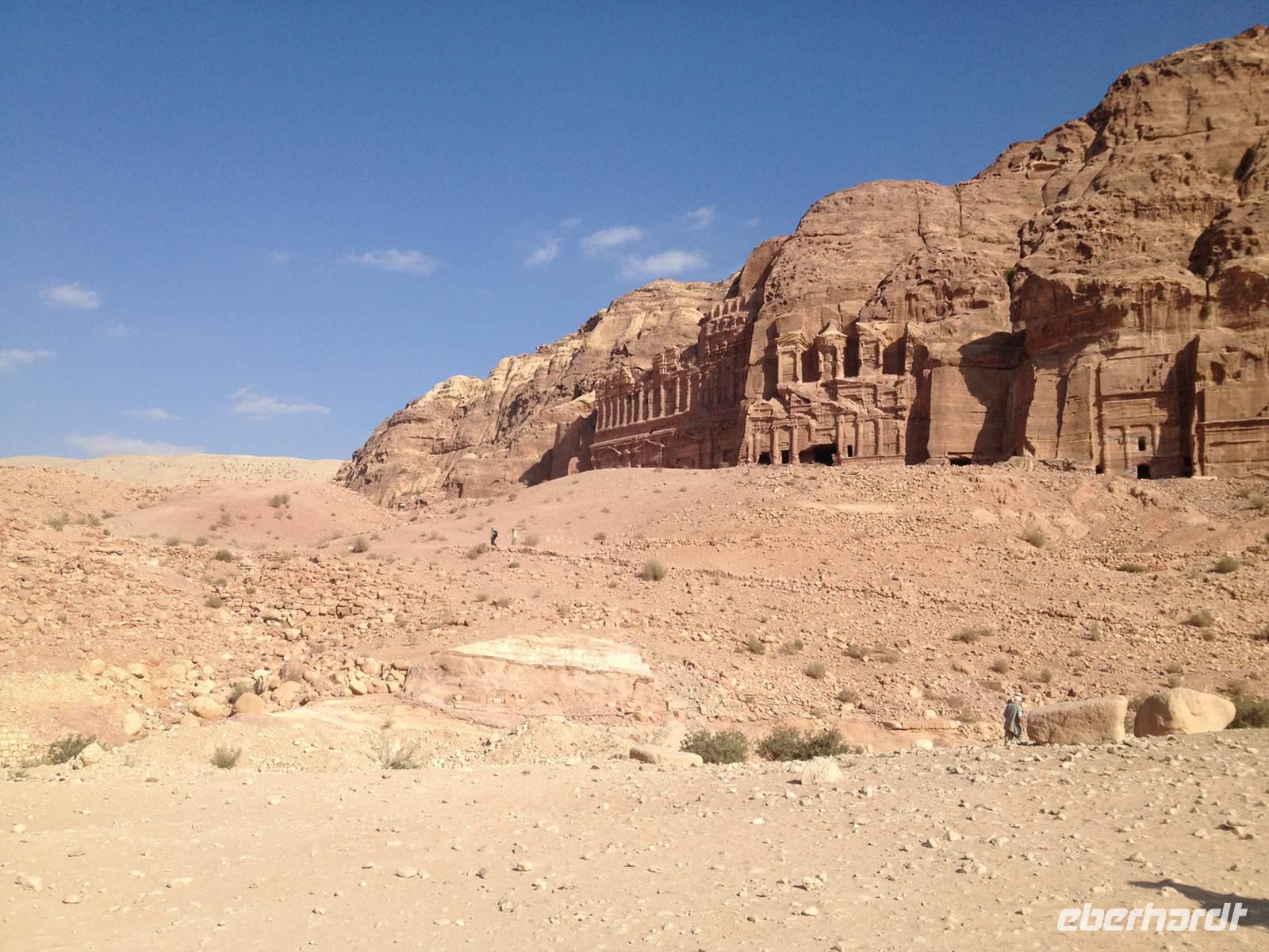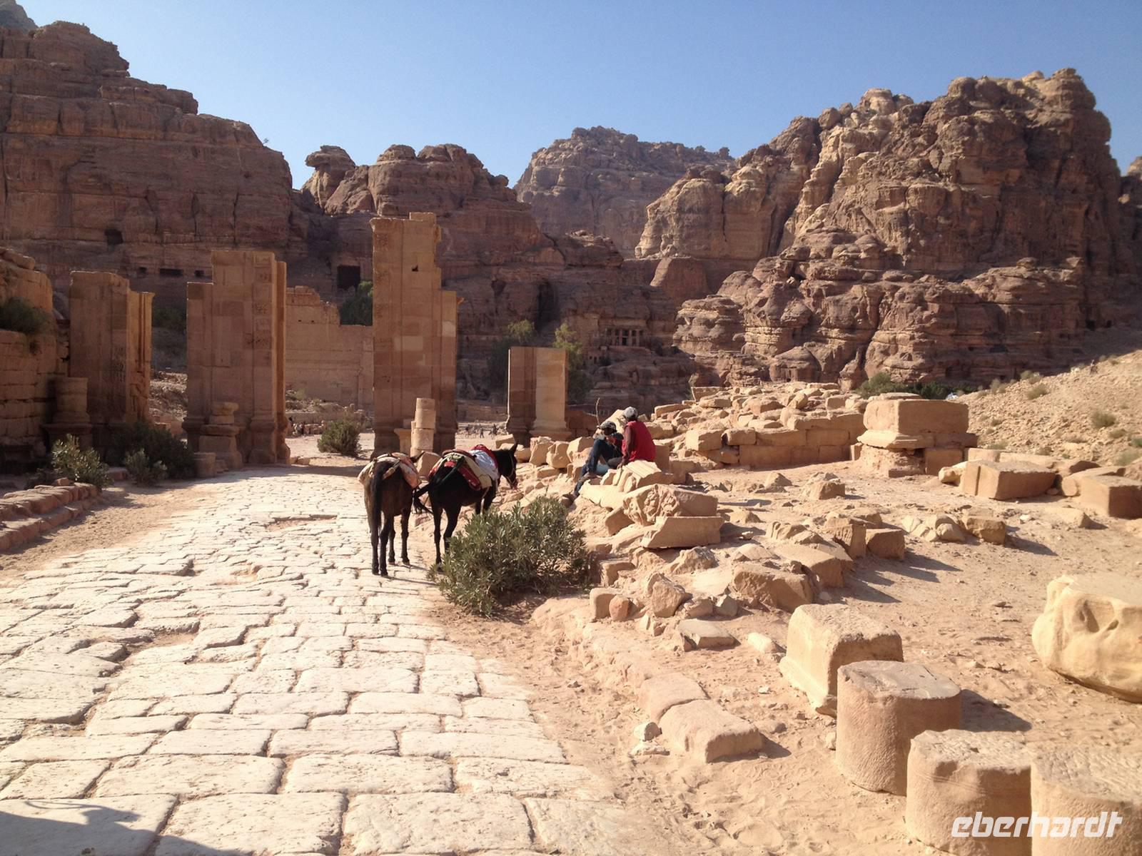 Wir stiegen nun etwas bergan und hatten einen grandiosen Blick auf die gegenüberliegenden Königsgräber. Vor allem das Urnengrab ist hier das eindrucksvollste Bauwerk. Die Sonne drückte ganz schön und wir erreichten nach einiger Zeit und vielen Erklärungen durch Mahmoud das Herz der damaligen Stadt. Um die Kolonnadenstraße befand sich ein geschäftiger Marktplatz, umsäumt von Läden und Wohnhäusern. Am Temenos-Tor haben wir den südlichsten Punkt unserer Runde erreicht. Die Kräfte ließen nun langsam nach und die Hitze machte uns etwas zu schaffen. Mit vielen einmaligen Augenblicken bummelten wir langsam zurück zum Schatzhaus und dann durch den Siq hinauf zum Bus. Gemeinsam mit Mahmoud reisten wir zurück nach Süden in Richtung Aqaba und zur Grenze, die wir nach der Verabschiedung von Mahmoud erneut zu Fuß passierten. Said wartete schon auf uns und pünktlich zum Abendessen waren wir zurück im Hotel.