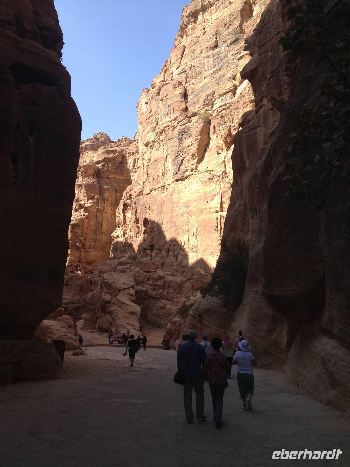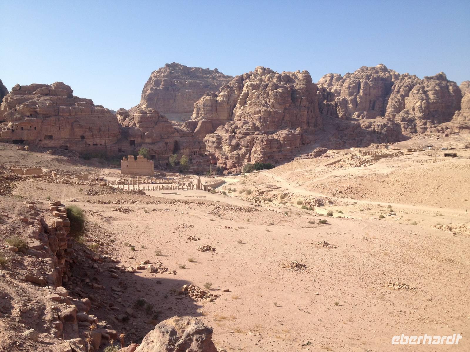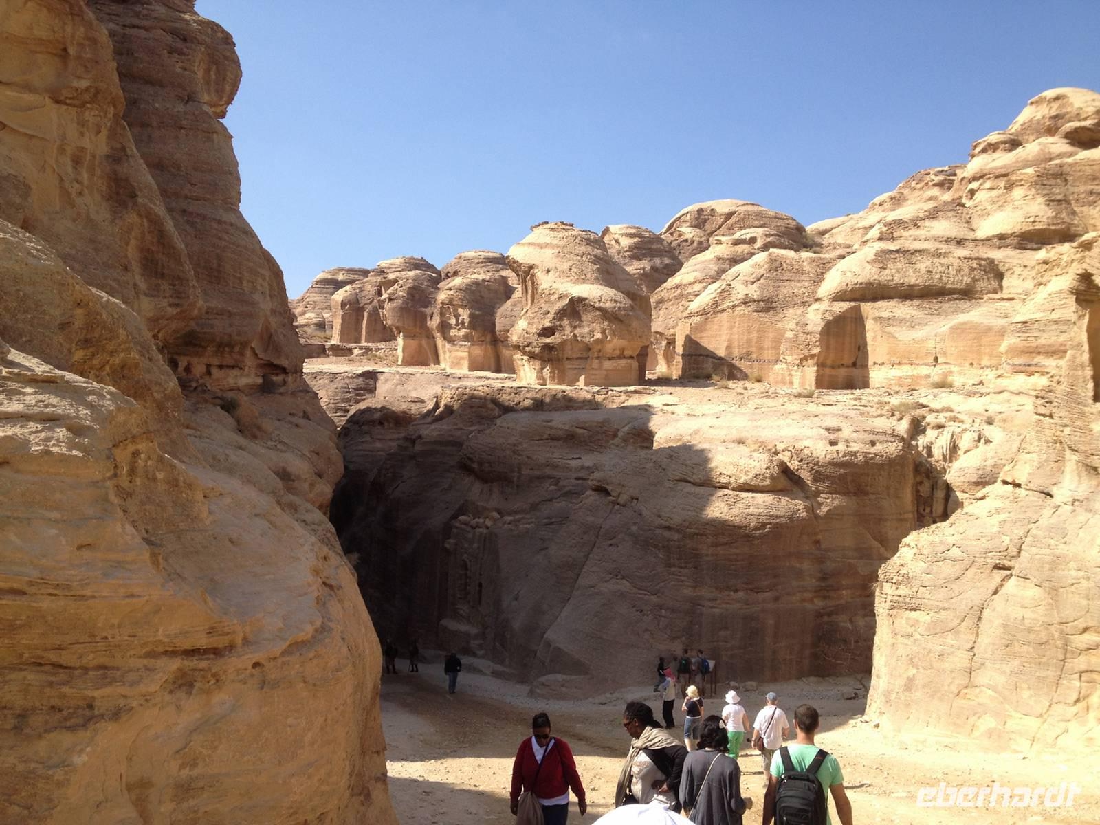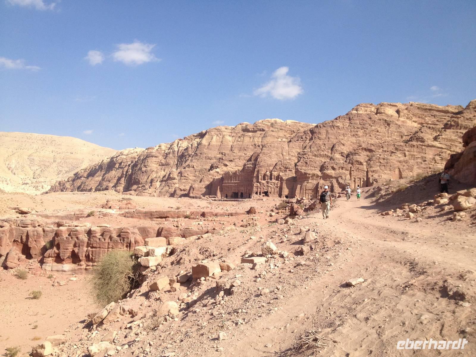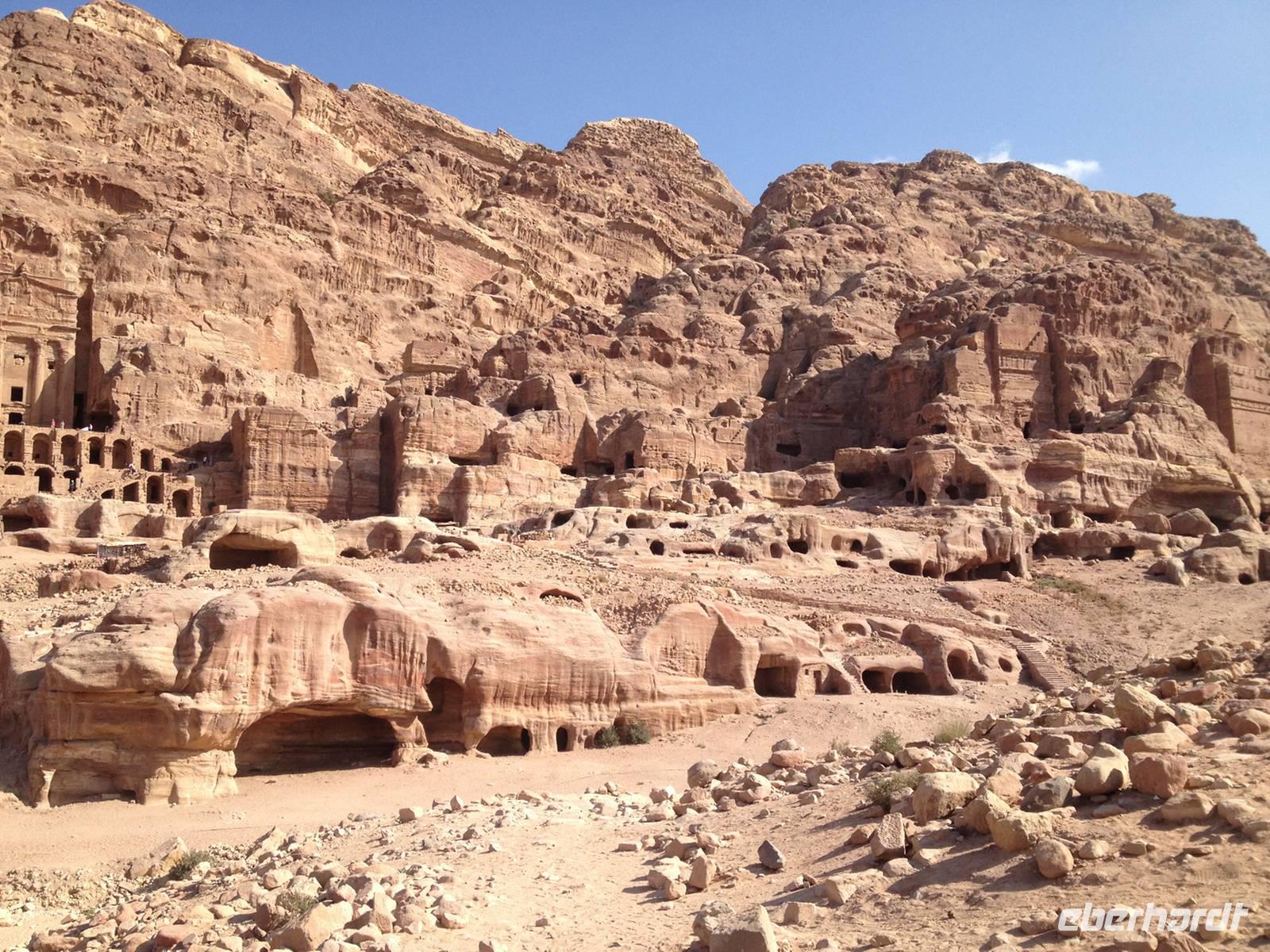 Wir stiegen nun etwas bergan und hatten einen grandiosen Blick auf die gegenüberliegenden Königsgräber. Vor allem das Urnengrab ist hier das eindrucksvollste Bauwerk. Die Sonne drückte ganz schön und wir erreichten nach einiger Zeit und vielen Erklärungen durch Mahmoud das Herz der damaligen Stadt. Um die Kolonnadenstraße befand sich ein geschäftiger Marktplatz, umsäumt von Läden und Wohnhäusern. Am Temenos-Tor haben wir den südlichsten Punkt unserer Runde erreicht. Die Kräfte ließen nun langsam nach und die Hitze machte uns etwas zu schaffen. Mit vielen einmaligen Augenblicken bummelten wir langsam zurück zum Schatzhaus und dann durch den Siq hinauf zum Bus. Gemeinsam mit Mahmoud reisten wir zurück nach Süden in Richtung Aqaba und zur Grenze, die wir nach der Verabschiedung von Mahmoud erneut zu Fuß passierten. Said wartete schon auf uns und pünktlich zum Abendessen waren wir zurück im Hotel.