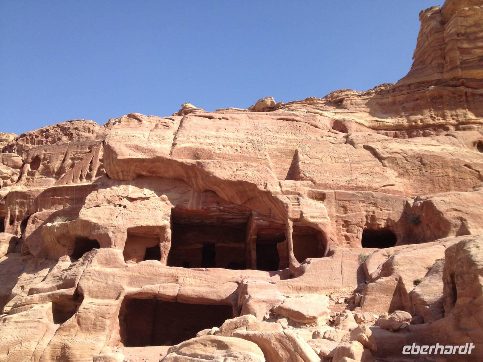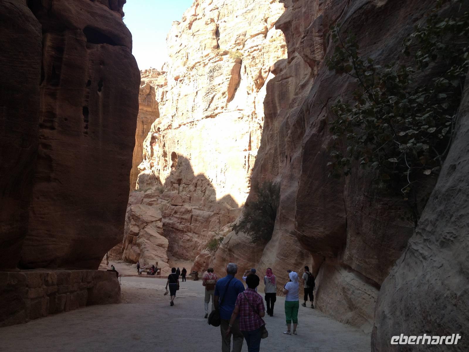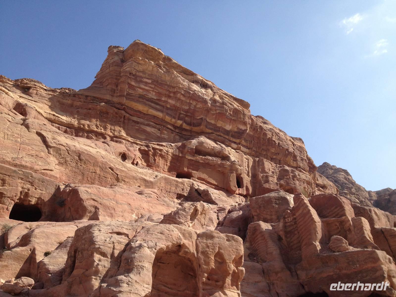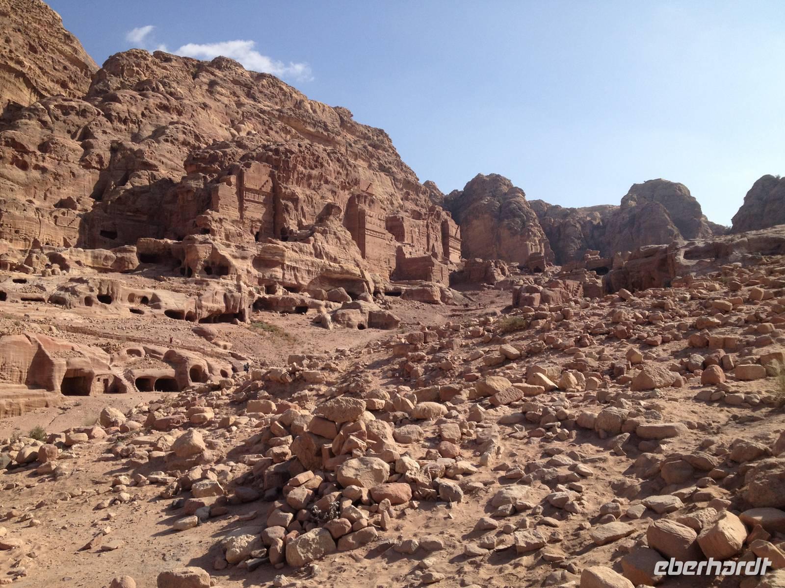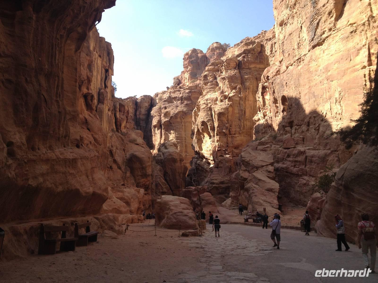 Wir stiegen nun etwas bergan und hatten einen grandiosen Blick auf die gegenüberliegenden Königsgräber. Vor allem das Urnengrab ist hier das eindrucksvollste Bauwerk. Die Sonne drückte ganz schön und wir erreichten nach einiger Zeit und vielen Erklärungen durch Mahmoud das Herz der damaligen Stadt. Um die Kolonnadenstraße befand sich ein geschäftiger Marktplatz, umsäumt von Läden und Wohnhäusern. Am Temenos-Tor haben wir den südlichsten Punkt unserer Runde erreicht. Die Kräfte ließen nun langsam nach und die Hitze machte uns etwas zu schaffen. Mit vielen einmaligen Augenblicken bummelten wir langsam zurück zum Schatzhaus und dann durch den Siq hinauf zum Bus. Gemeinsam mit Mahmoud reisten wir zurück nach Süden in Richtung Aqaba und zur Grenze, die wir nach der Verabschiedung von Mahmoud erneut zu Fuß passierten. Said wartete schon auf uns und pünktlich zum Abendessen waren wir zurück im Hotel.