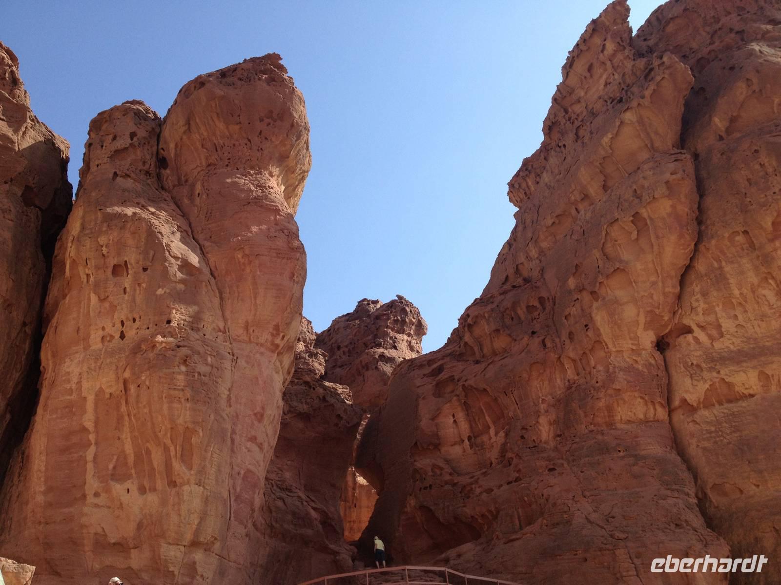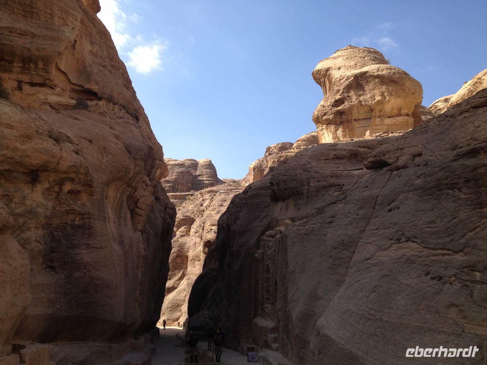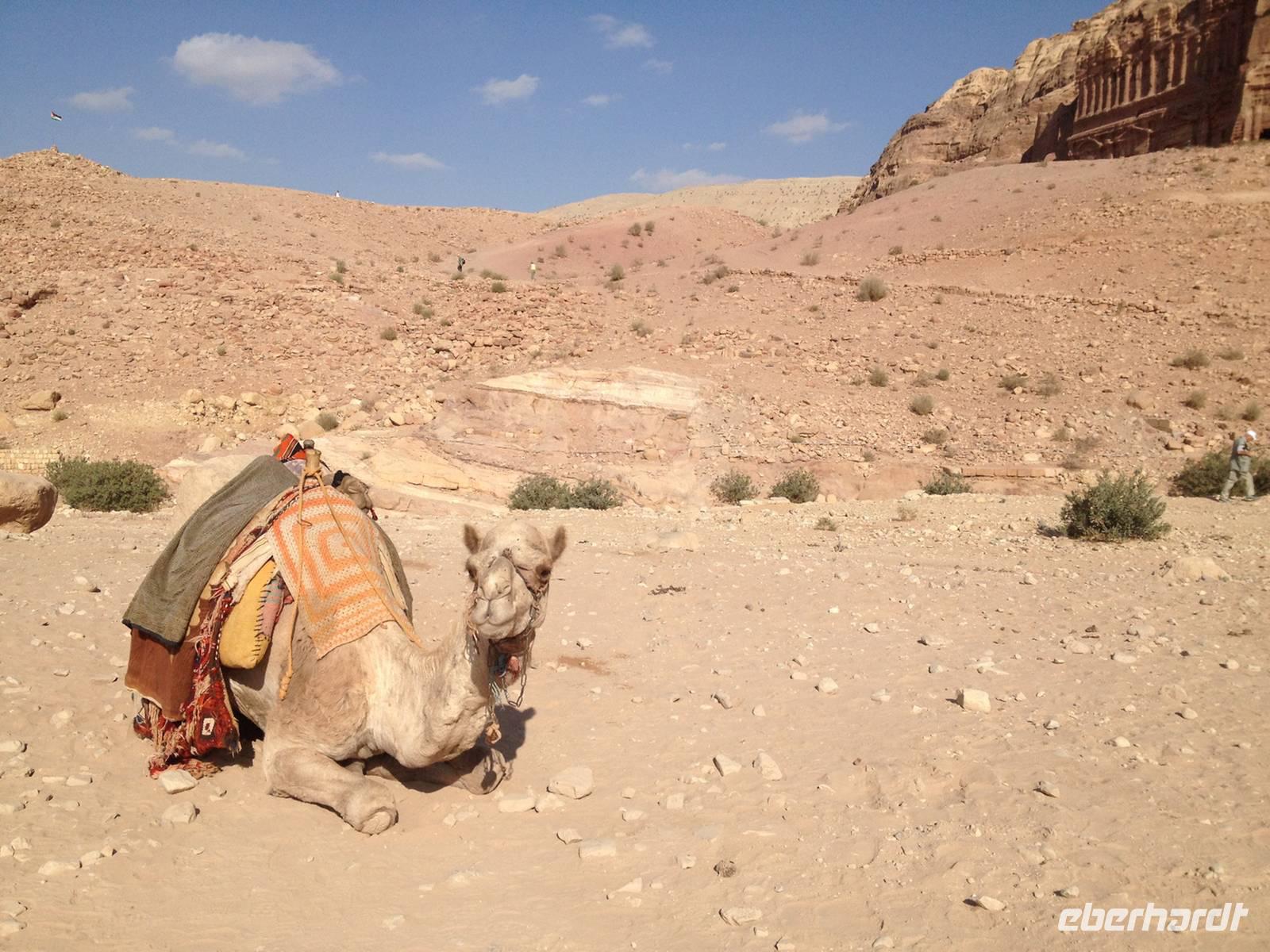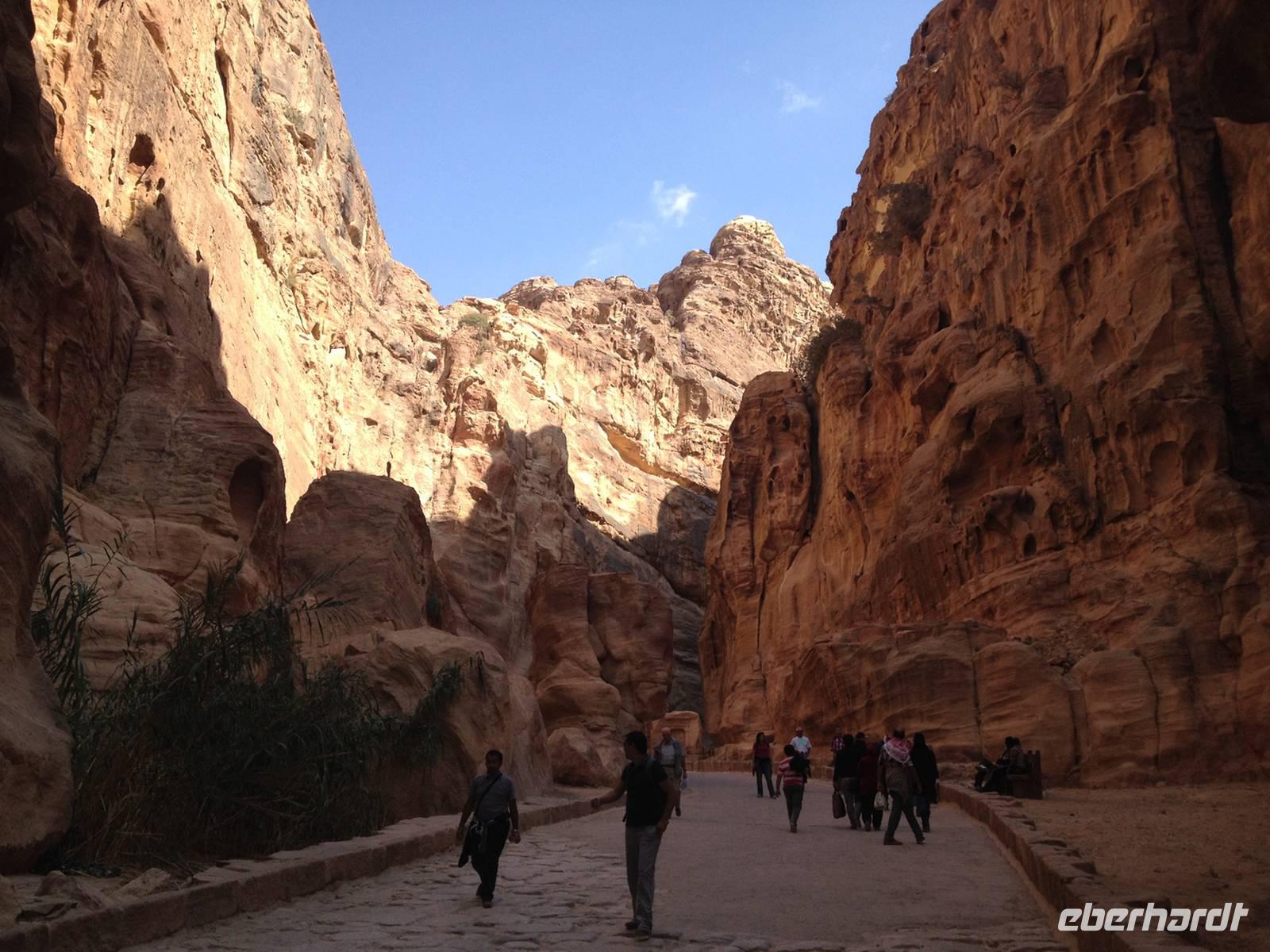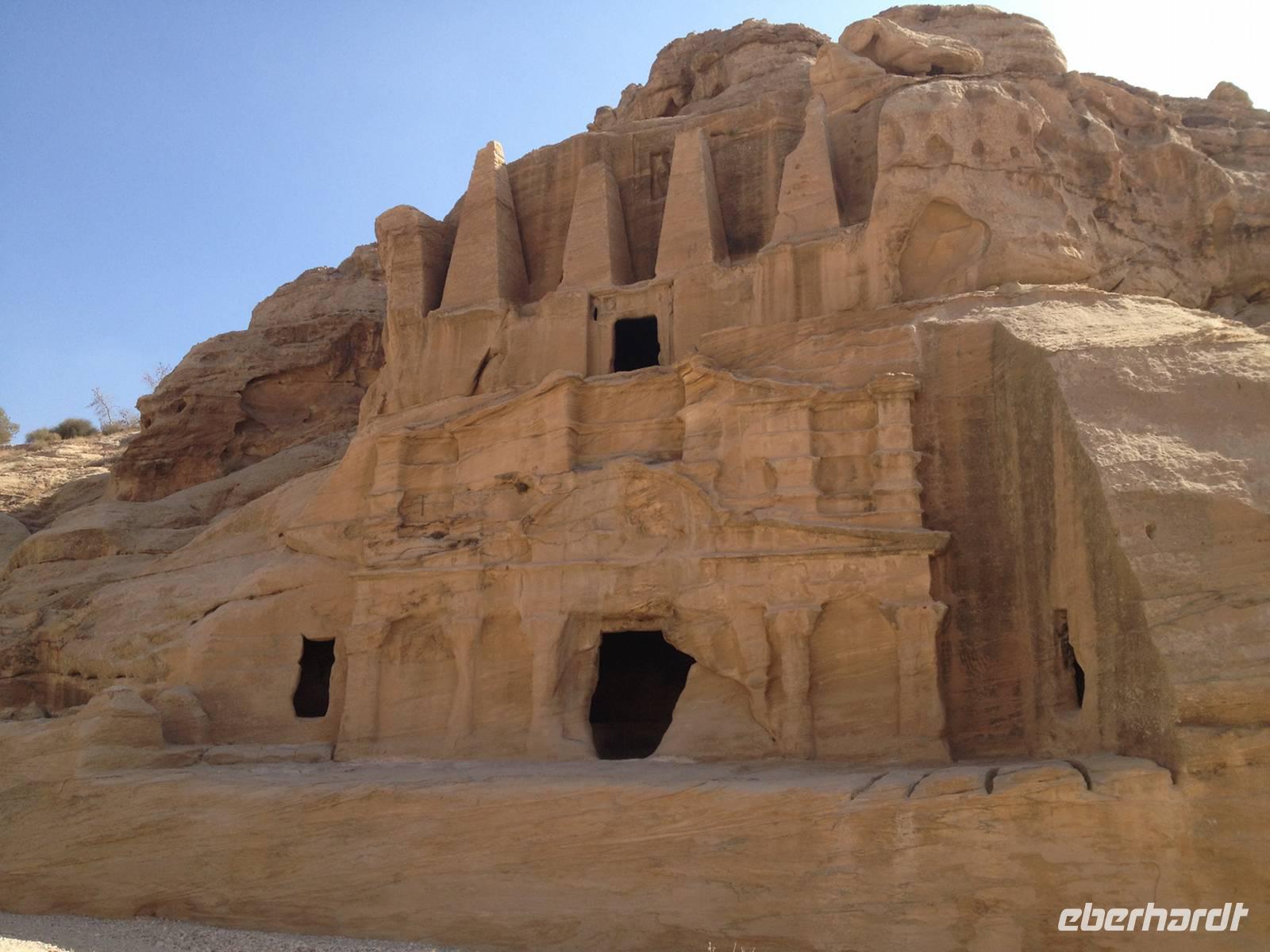 Wir stiegen nun etwas bergan und hatten einen grandiosen Blick auf die gegenüberliegenden Königsgräber. Vor allem das Urnengrab ist hier das eindrucksvollste Bauwerk. Die Sonne drückte ganz schön und wir erreichten nach einiger Zeit und vielen Erklärungen durch Mahmoud das Herz der damaligen Stadt. Um die Kolonnadenstraße befand sich ein geschäftiger Marktplatz, umsäumt von Läden und Wohnhäusern. Am Temenos-Tor haben wir den südlichsten Punkt unserer Runde erreicht. Die Kräfte ließen nun langsam nach und die Hitze machte uns etwas zu schaffen. Mit vielen einmaligen Augenblicken bummelten wir langsam zurück zum Schatzhaus und dann durch den Siq hinauf zum Bus. Gemeinsam mit Mahmoud reisten wir zurück nach Süden in Richtung Aqaba und zur Grenze, die wir nach der Verabschiedung von Mahmoud erneut zu Fuß passierten. Said wartete schon auf uns und pünktlich zum Abendessen waren wir zurück im Hotel.