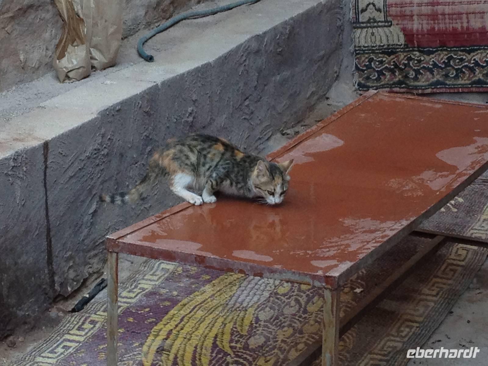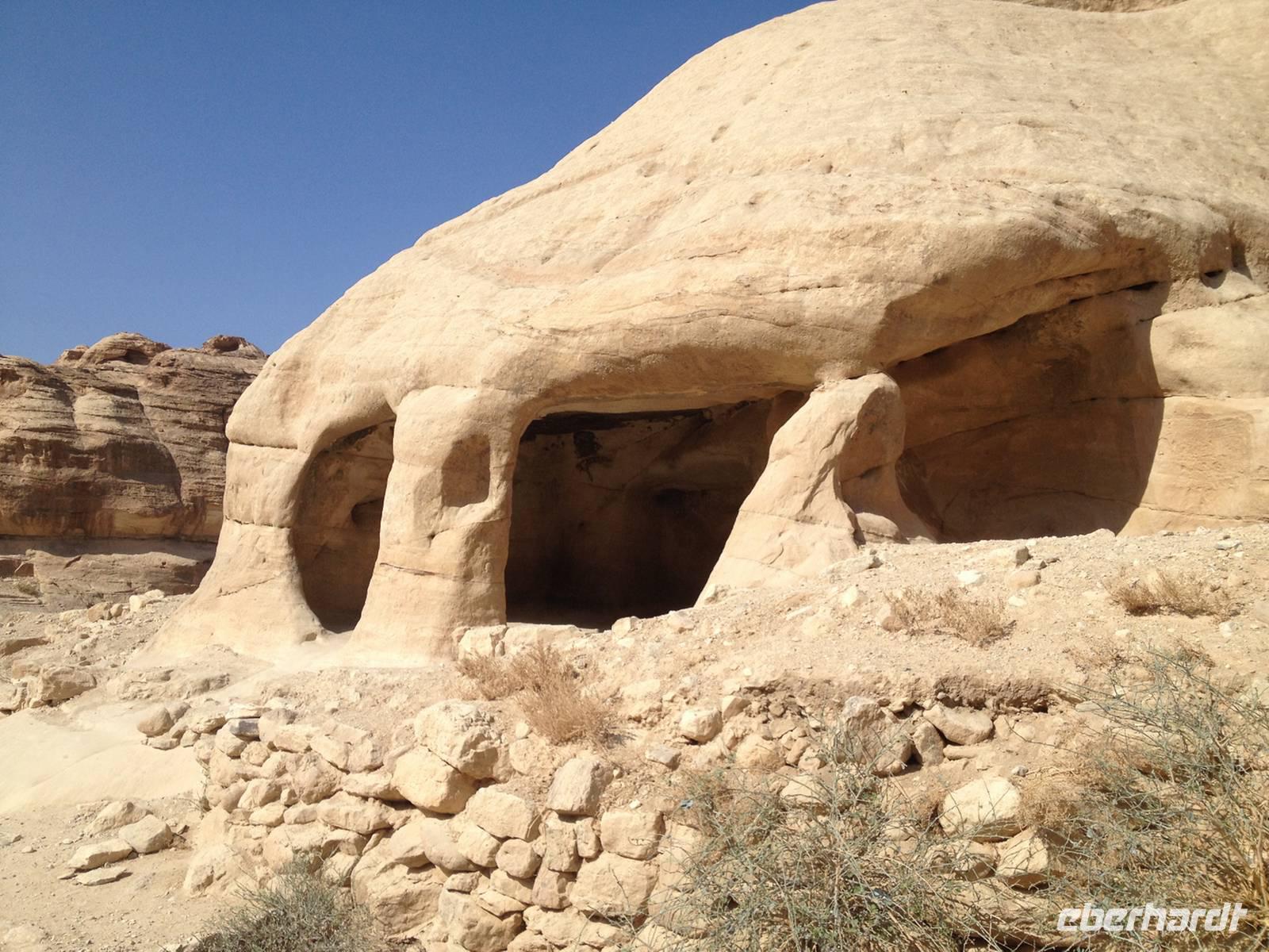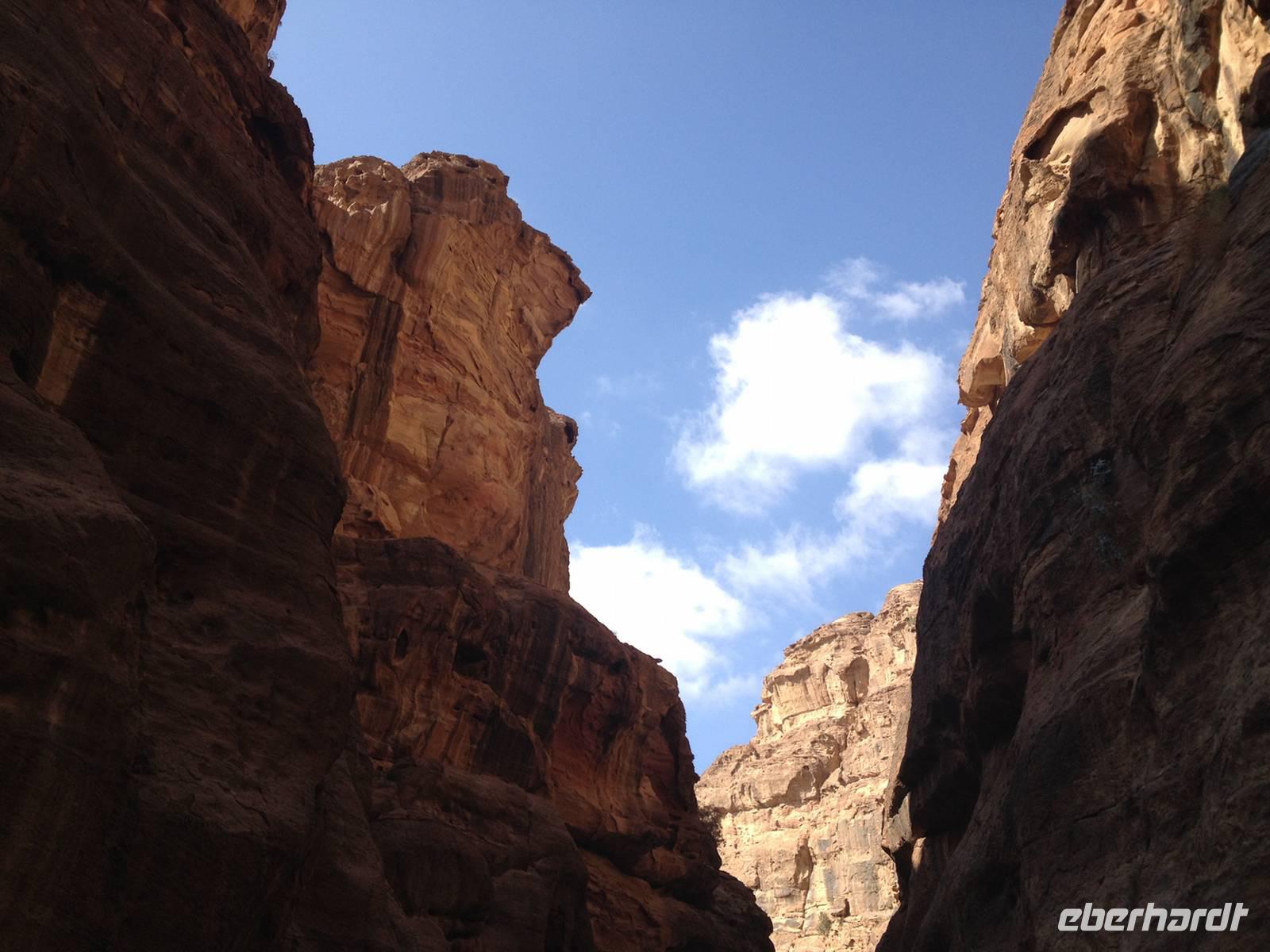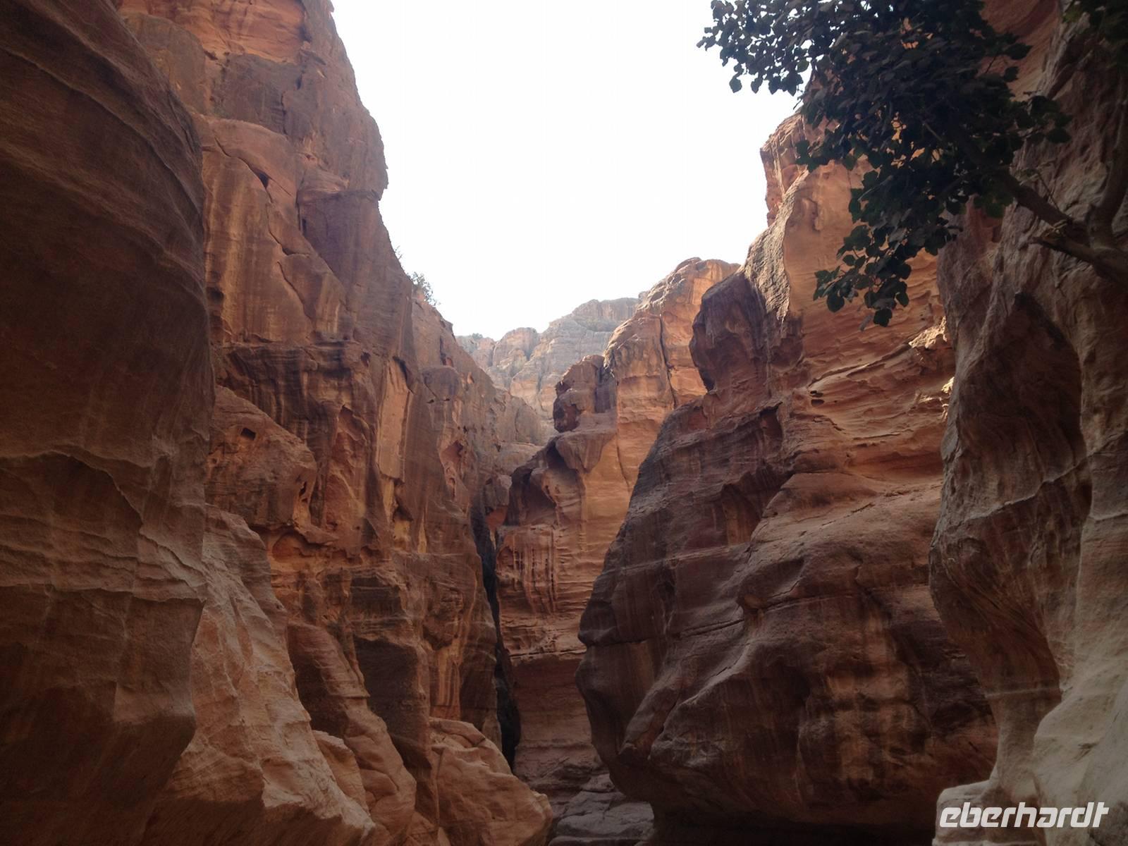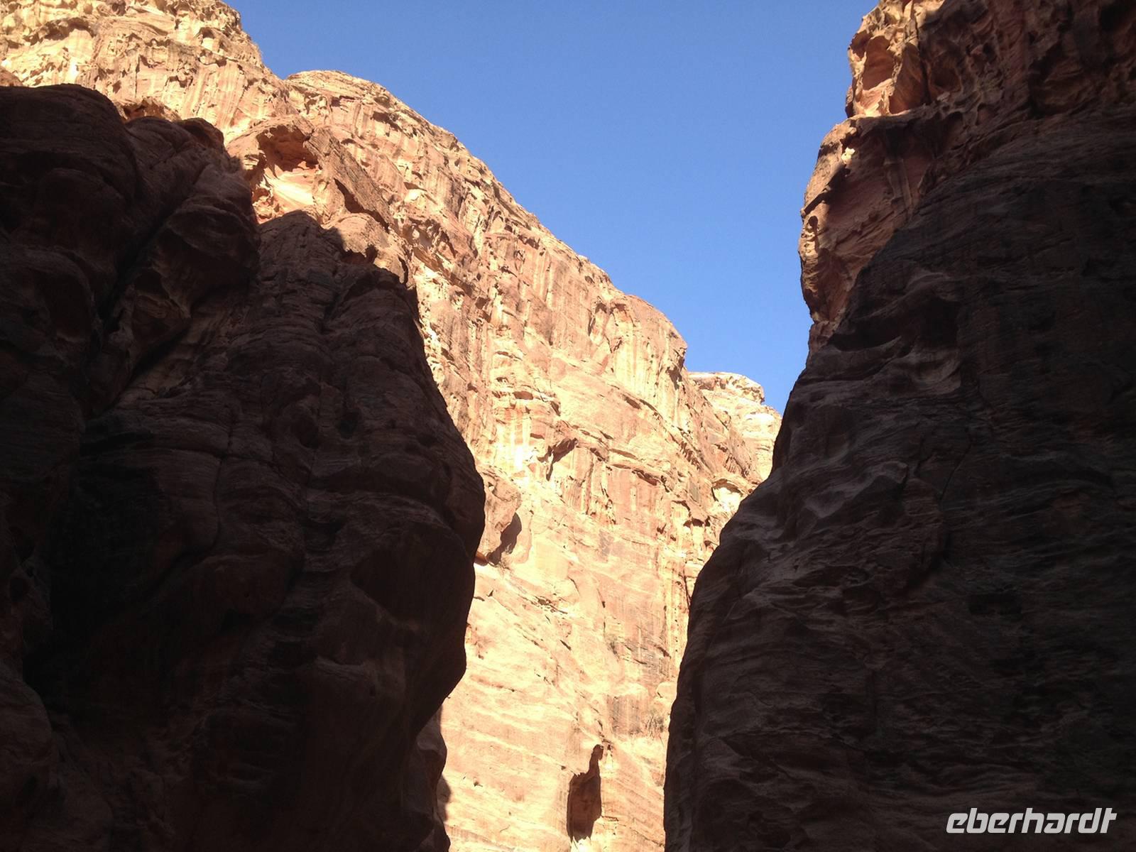 Wir stiegen nun etwas bergan und hatten einen grandiosen Blick auf die gegenüberliegenden Königsgräber. Vor allem das Urnengrab ist hier das eindrucksvollste Bauwerk. Die Sonne drückte ganz schön und wir erreichten nach einiger Zeit und vielen Erklärungen durch Mahmoud das Herz der damaligen Stadt. Um die Kolonnadenstraße befand sich ein geschäftiger Marktplatz, umsäumt von Läden und Wohnhäusern. Am Temenos-Tor haben wir den südlichsten Punkt unserer Runde erreicht. Die Kräfte ließen nun langsam nach und die Hitze machte uns etwas zu schaffen. Mit vielen einmaligen Augenblicken bummelten wir langsam zurück zum Schatzhaus und dann durch den Siq hinauf zum Bus. Gemeinsam mit Mahmoud reisten wir zurück nach Süden in Richtung Aqaba und zur Grenze, die wir nach der Verabschiedung von Mahmoud erneut zu Fuß passierten. Said wartete schon auf uns und pünktlich zum Abendessen waren wir zurück im Hotel.