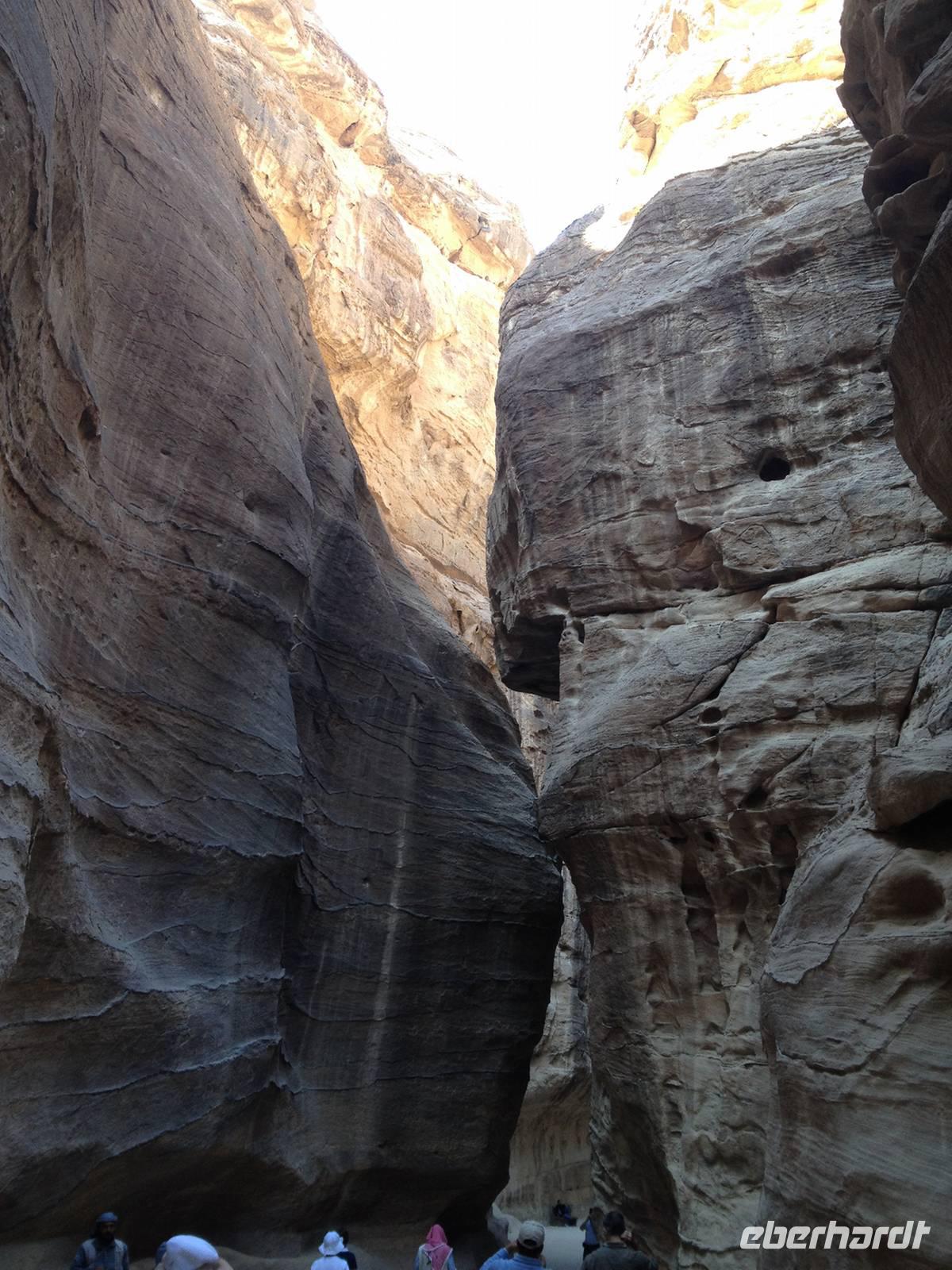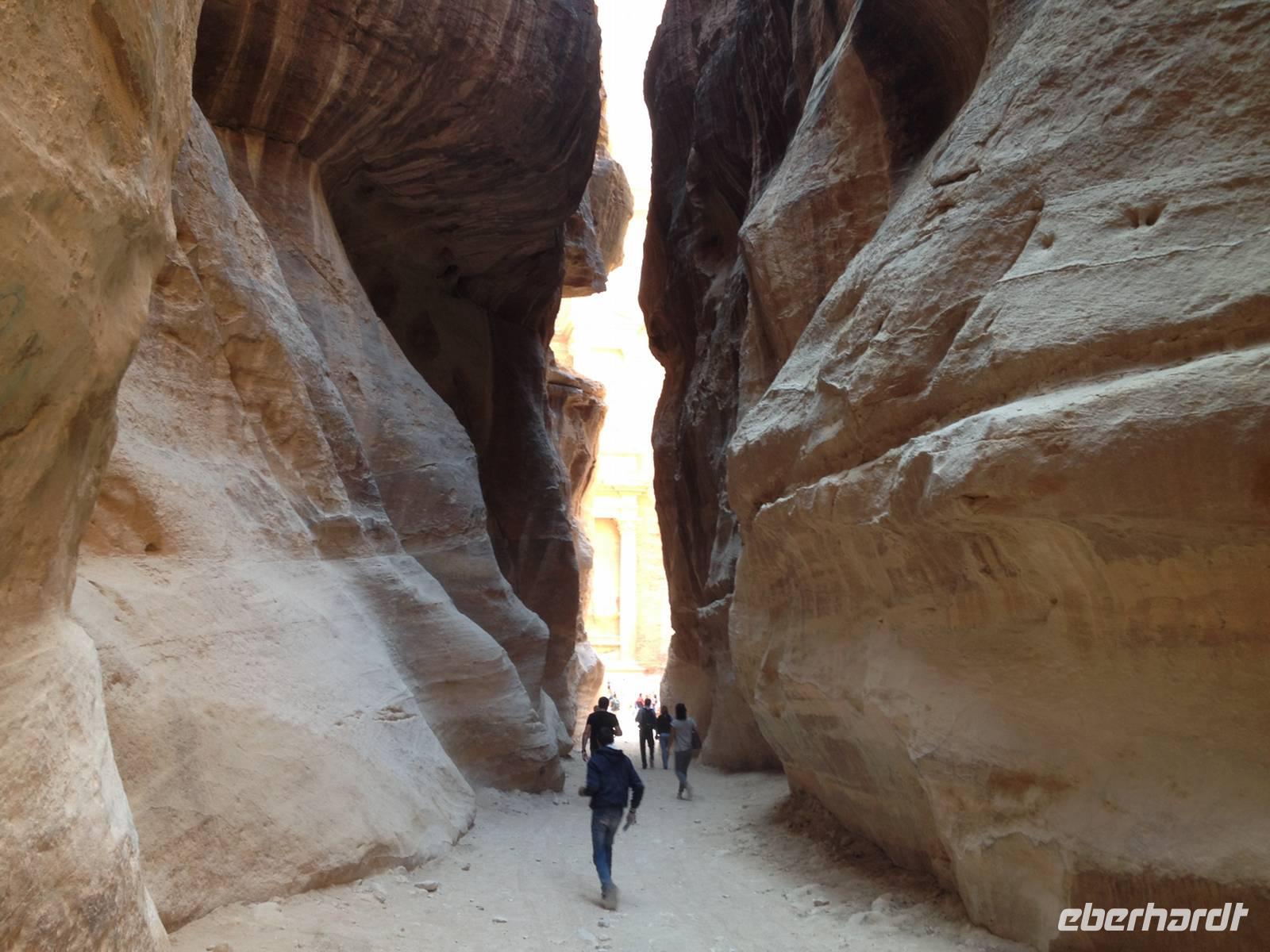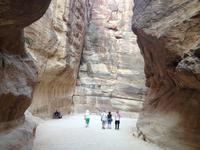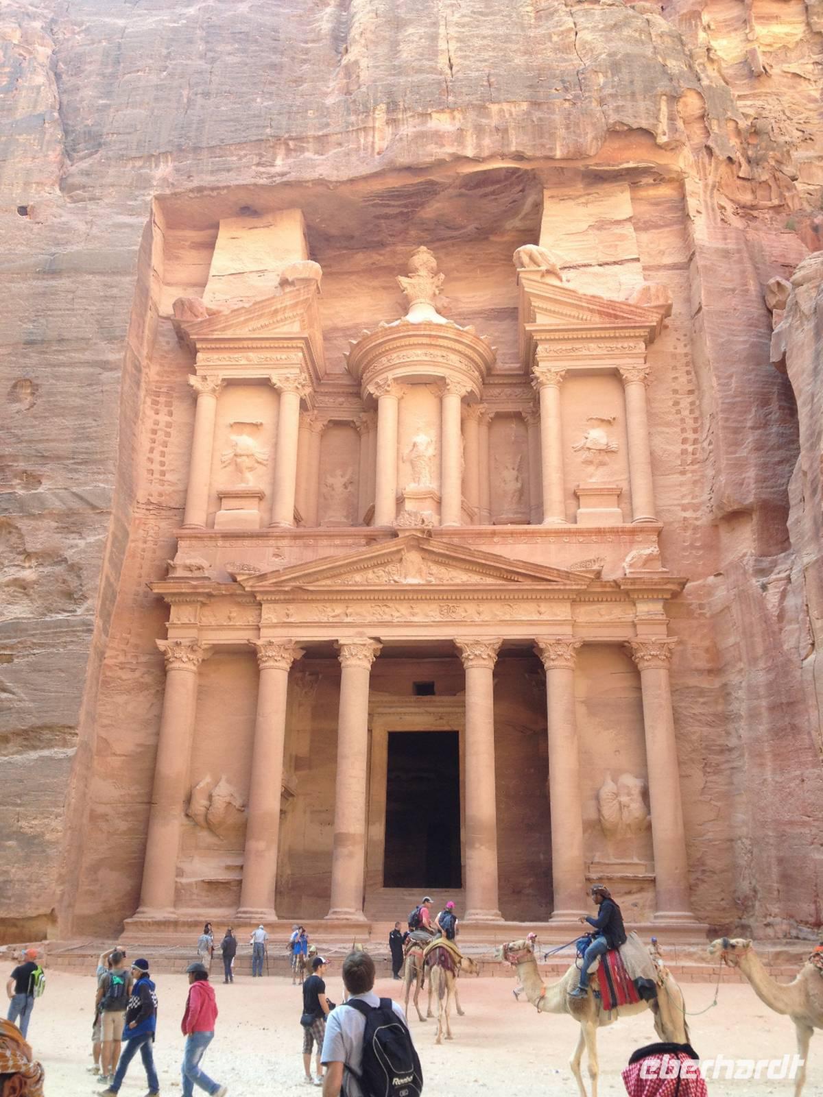 Ein weiterer Höhepunkt unserer Reise war zweifellos der Besuch der Felsenstadt Petra - einst UNESCO-Weltkulturerbe, nun eines der neuen sieben Weltwunder! Mit dem Bus fuhren wir zunächst wenige Minuten bis zur israelisch-jordanischen Grenze, die wir nach einigen Formalitäten und Zahlung einer Grenzgebühr zu Fuß passierten. Nach unzähligen Passkontrollen begrüßte uns Mahmoud, unser jordanischer Reiseleiter herzlich! Die Fahrt in Richtung Norden war sehr kurzweilig, da wir schon sehr viel über das Haschemitische Königreich Jordanien erfuhren. In Petra angekommen, besorgte Mahmoud unsere Eintrittskarten. Nun begannen wir unseren Spaziergang zunächst zum Siq. Er ist der Hauptzugang zur „rosaroten Stadt" seit der Antike. Schon allein der Gang durch diese 1,2 Kilometer lange Schlucht war ein Erlebnis. Tiefe und enge Schluchten von atemberaubender Schönheit, eingefasst von bis zu 80 Meter hohen Felswänden, begeisterten uns schon jetzt. Schon beim Durchschreiten des Siqs bekamen wir alle typischen Merkmale Petras zu sehen. Bizarre Felsformationen aus vielfarbigem Gestein, Terrassen, Dämme und in Fels gemeißelte Wasserkanäle. Als wir dachten, dass wir schon genug Staunenswertes gesehen haben, erreichten wir am Ende des Siqs das Schatzhaus. Das stolzeste und wohl schönste Denkmal von ganz Petra ist nun in voller Pracht zu sehen - Zeit für ein Gruppenfoto.