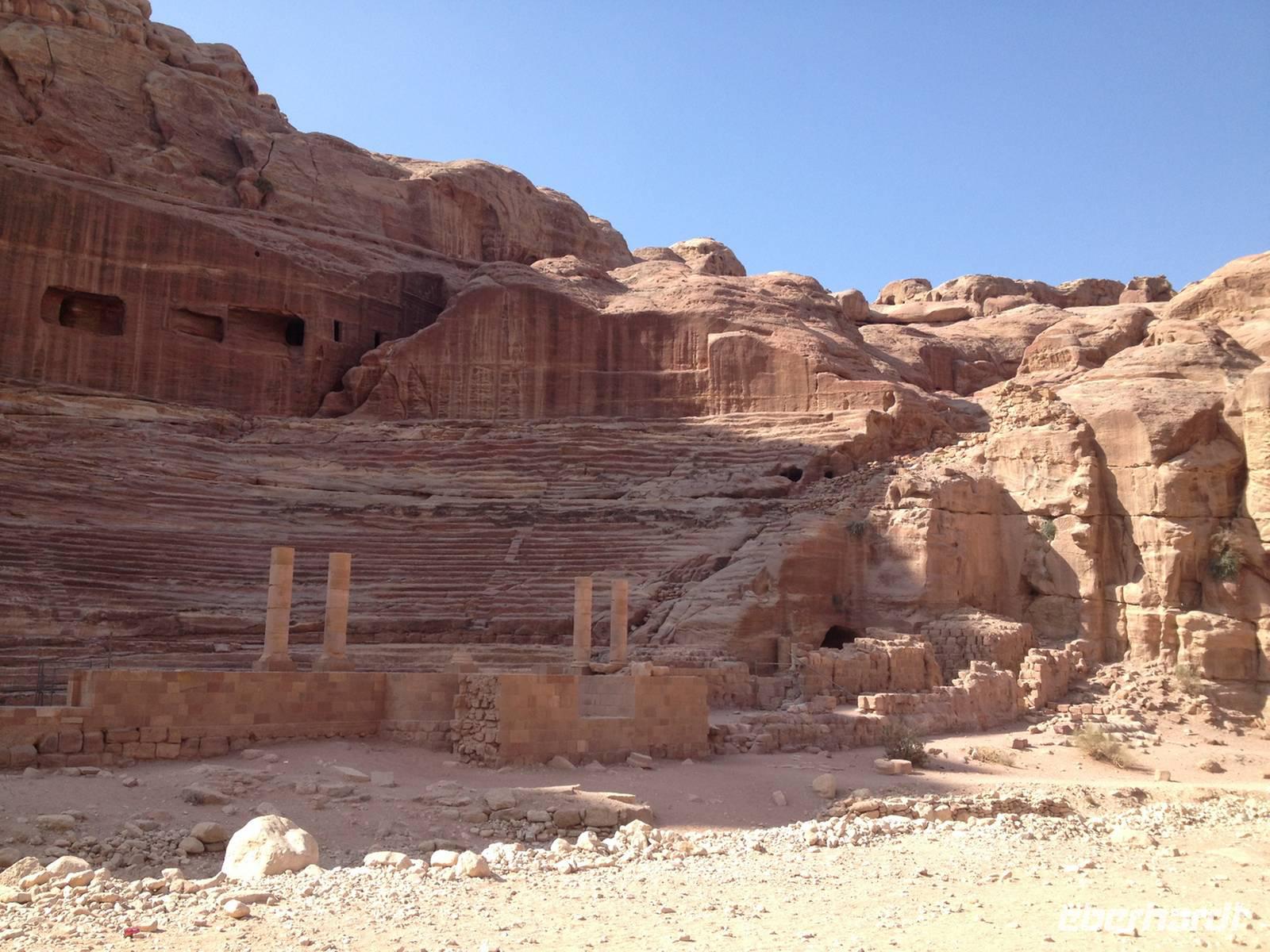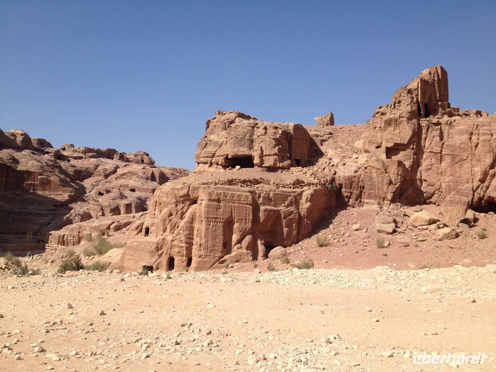 Wir begannen unseren Rundgang hier am Schatzhaus, sahen immer wieder phantastische Felsformationen und Farbspiele. Auf dem Weg zum Theater wird unser Weg (die sogenannte Fassadenstraße) von den nabatäischen Felsengräbern flankiert. Das Theater wurde von den Nabatäern errichtet und später von den Römern erweitert und weiter verwendet. Nun legten wir eine Pause ein und genossen frisch gepressten Orangen- und Granatapfelsaft.
