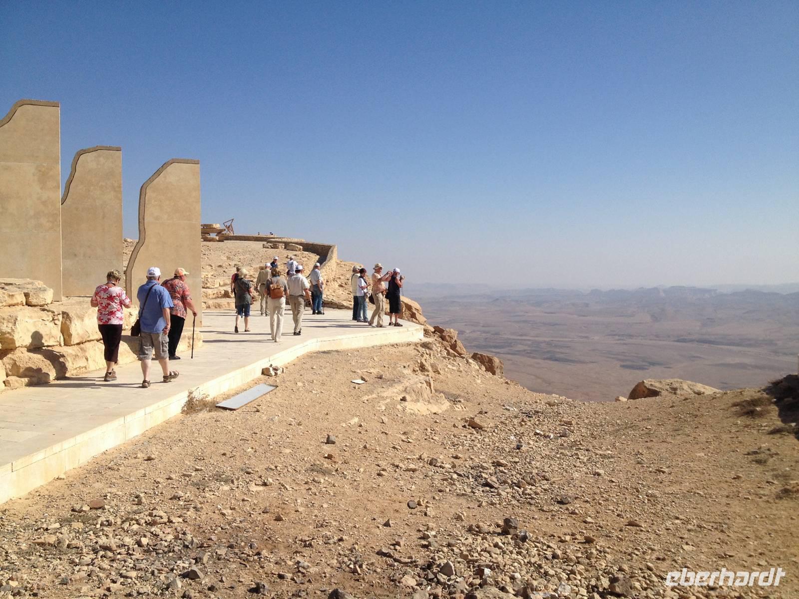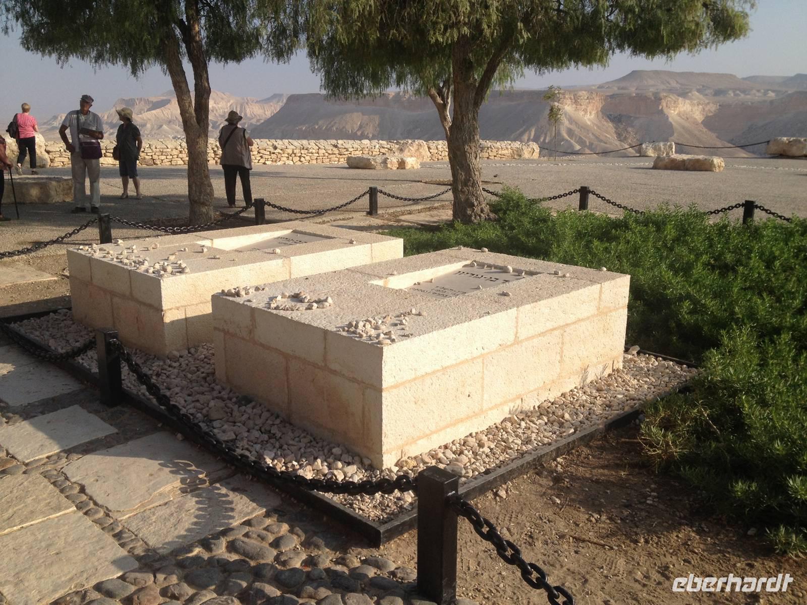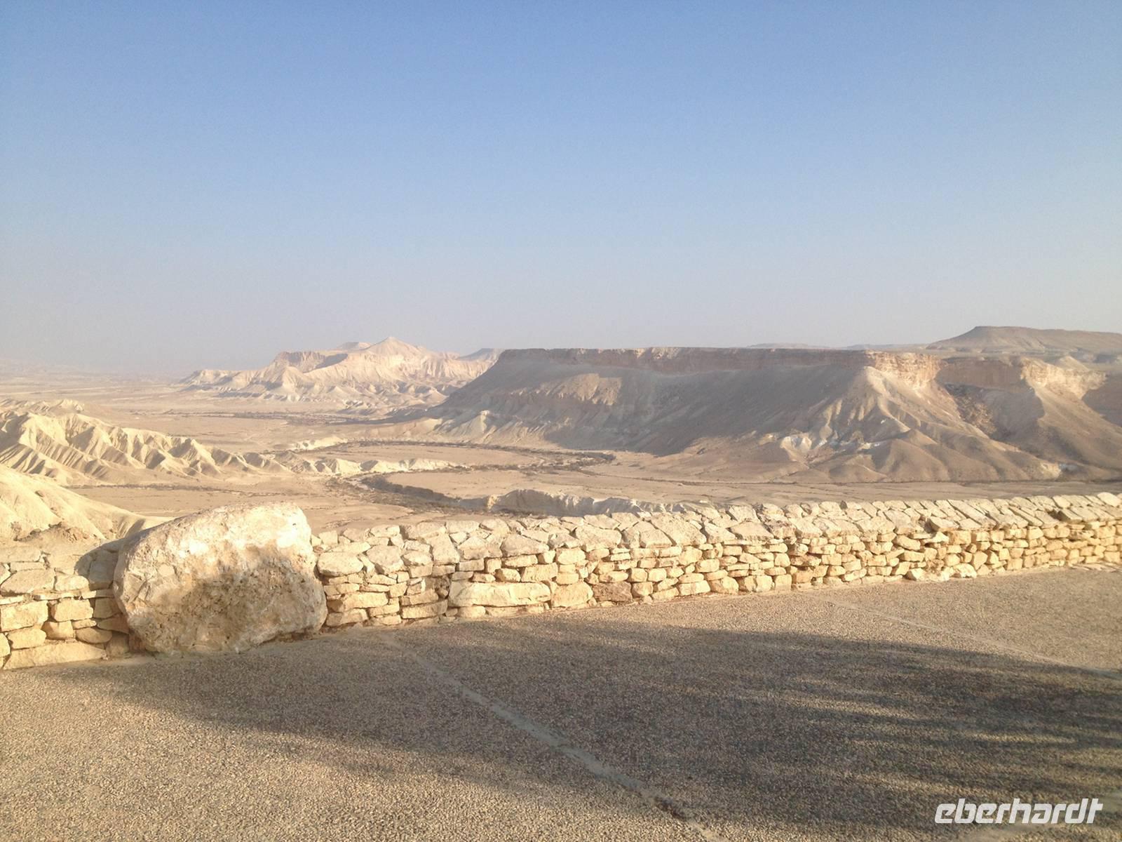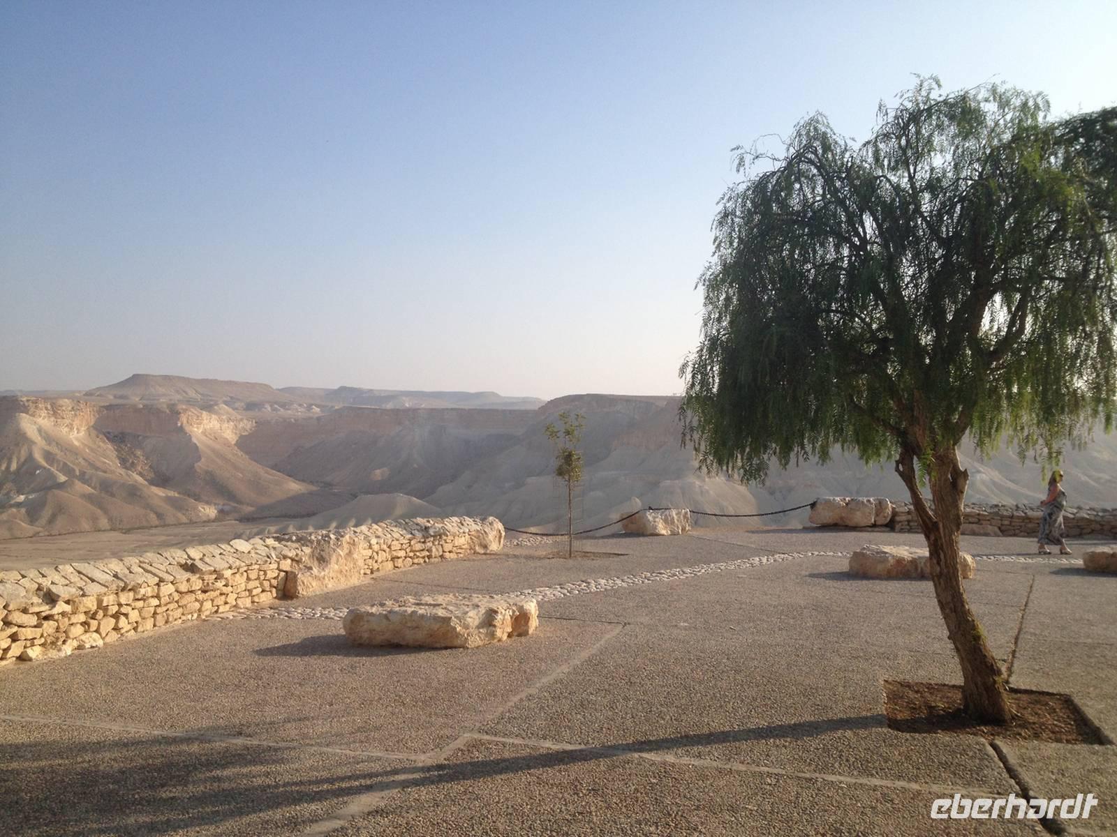 Unser nächster Stopp war der Kibbutz Sde Boqer, der durch den damaligen Premierminister David Ben Gurion berühmt wurde. Er erklärte 1948 Israels Unabhängigkeit und bezog hier 1953 ein Haus, um bei der Begrünung der Wüste mitzuarbeiten. Unmittelbar neben dem Kibbutz befindet sich der Campus der Negev-Universität, die sich mit der ökologischen Erschließung der Wüste beschäftigt. Am Gartengrab von Ben Gurion, der 1973 starb und neben seine Frau beigesetzt wurde, machten wir einen kleinen Exkurs in die Staatsgründung Israels, immer mit Blick auf das atemberaubende Wadi Zin, das schon Moses mit seinem Volk durchquerte.