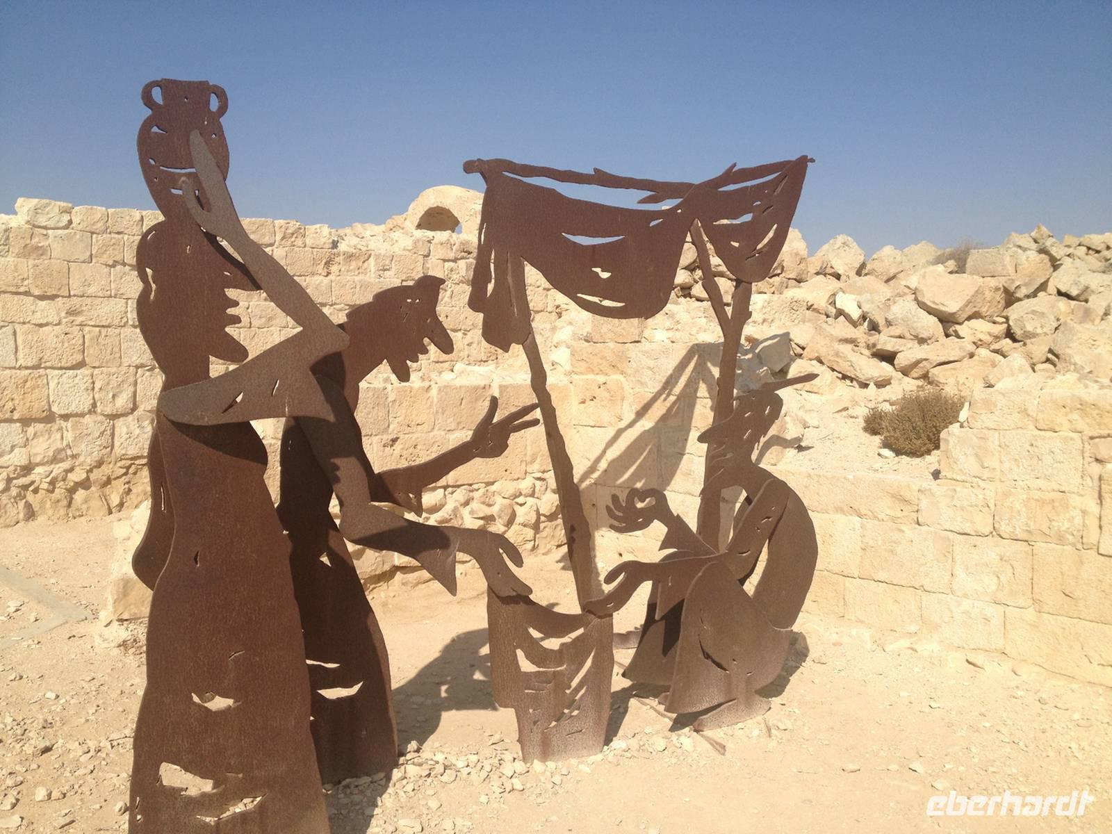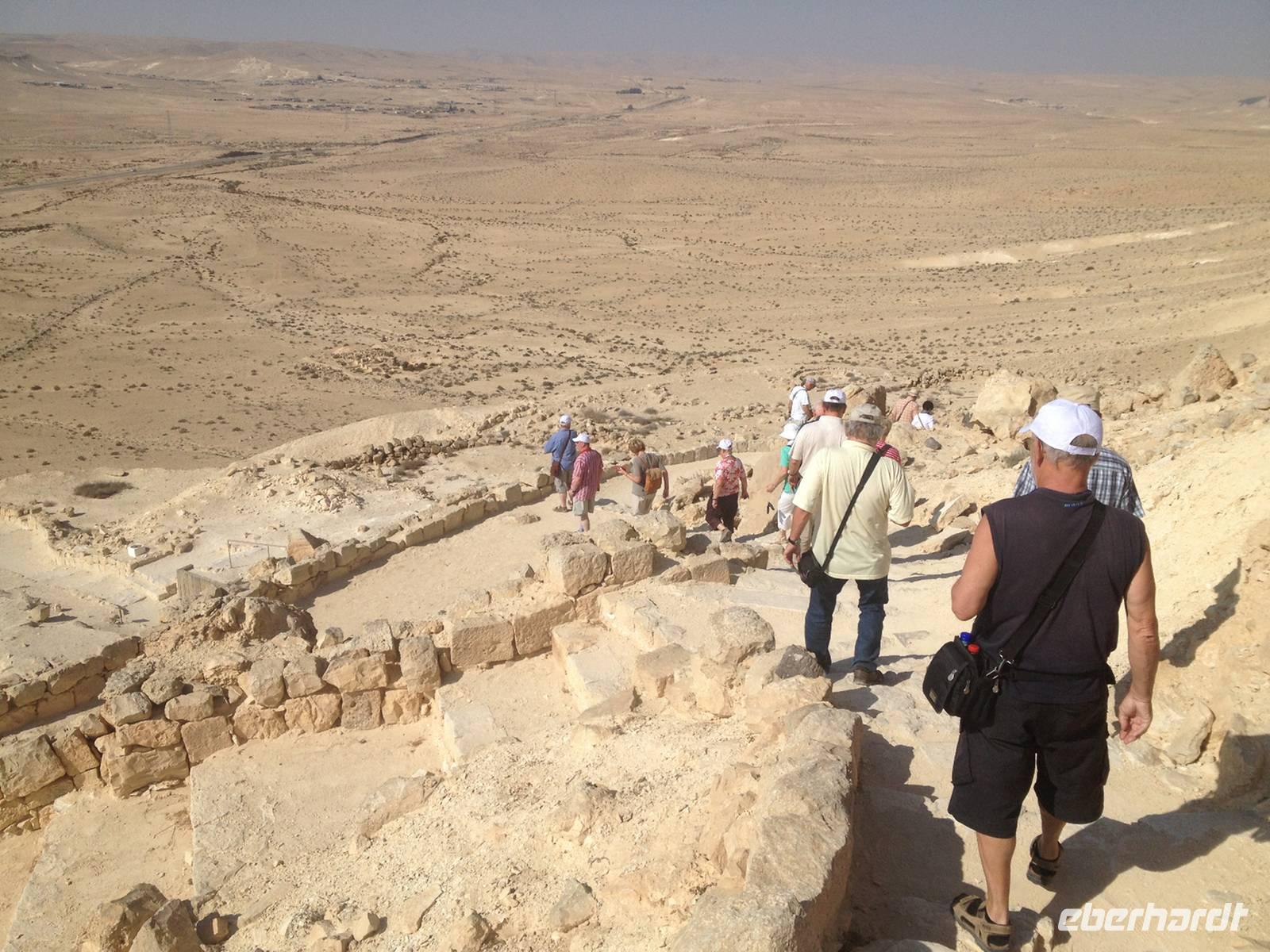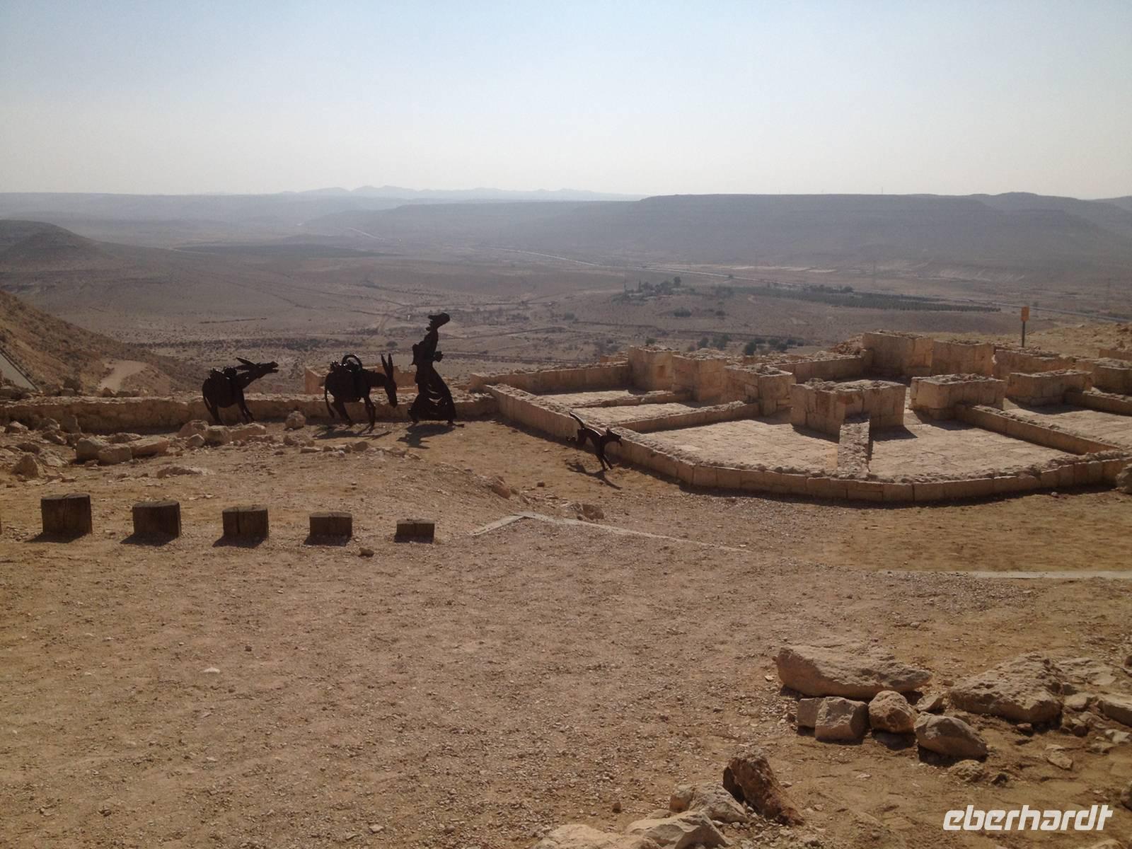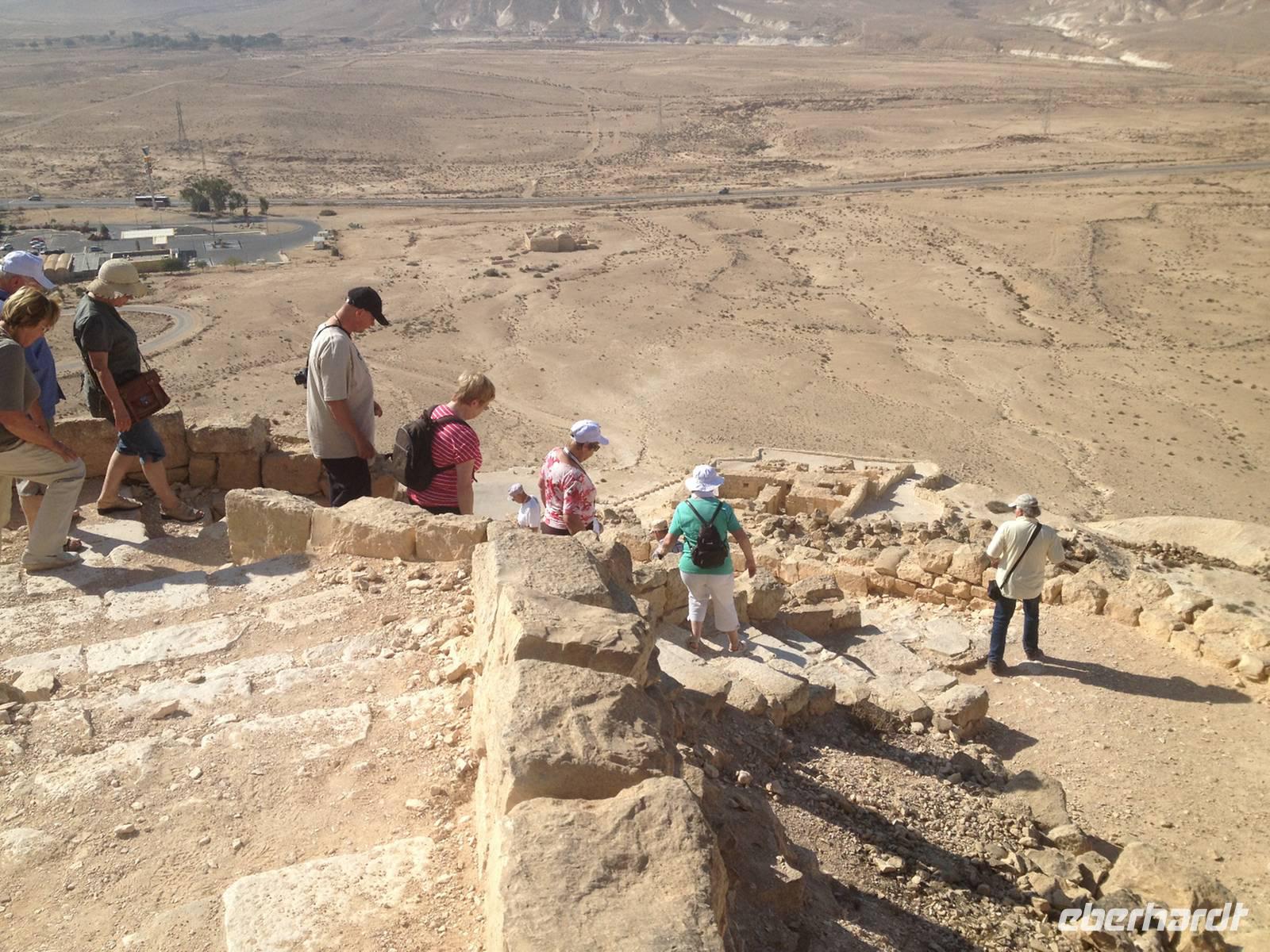 Dann, mitten in der Negev erhebt sich die zerstörte Stadt Awdat (Avdat) über dem Wasserbett der Wildnis von Zin. Einst wanderten die Israeliten hier entlang, später gründeten die nabatäischen Söhne der Wüste (Stichwort Felsenstadt Petra), deren Kamele mit Gewürzen für das Mittelmeer bepackt waren, die Stadt und wurde zur Zwischenstation für ihre Karawanen. Unter der römischen Vorherrschaft entwickelte sich Awdat von der Karawane zur Stadt, und als die Byzantiner das Christentum in den Negev brachten, wurden die nabatäischen Schreine zu Kirchen und Awdat blühte auf wie nie zuvor. Nach dem unterhaltsamen Einführungsfilm überzeugten wir uns selbst davon und machten einen schönen Rundgang durch die gut erhaltene und mit Liebe zum Detail restaurierten Ausgrabungsstätte.