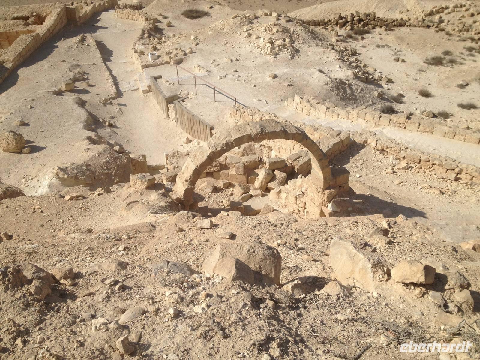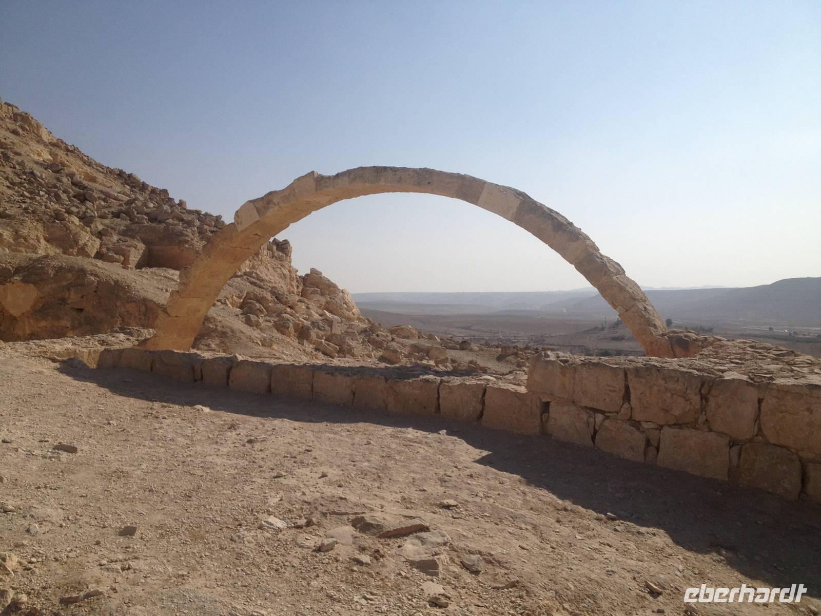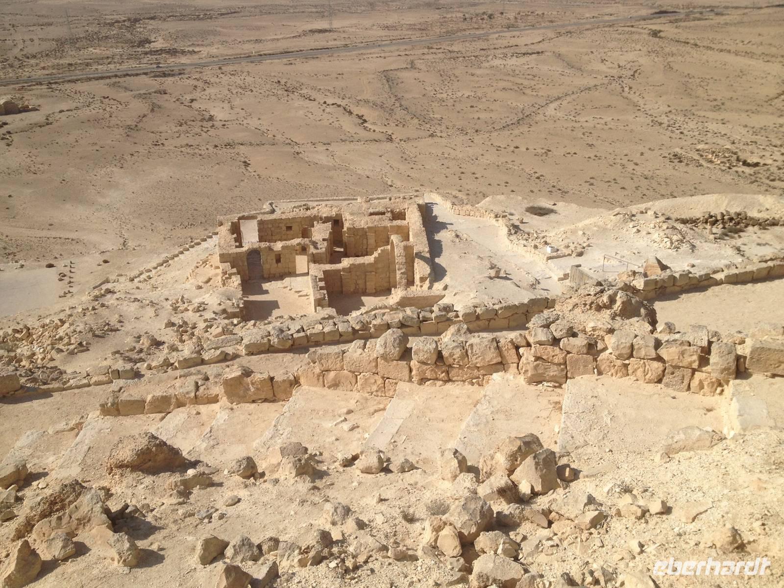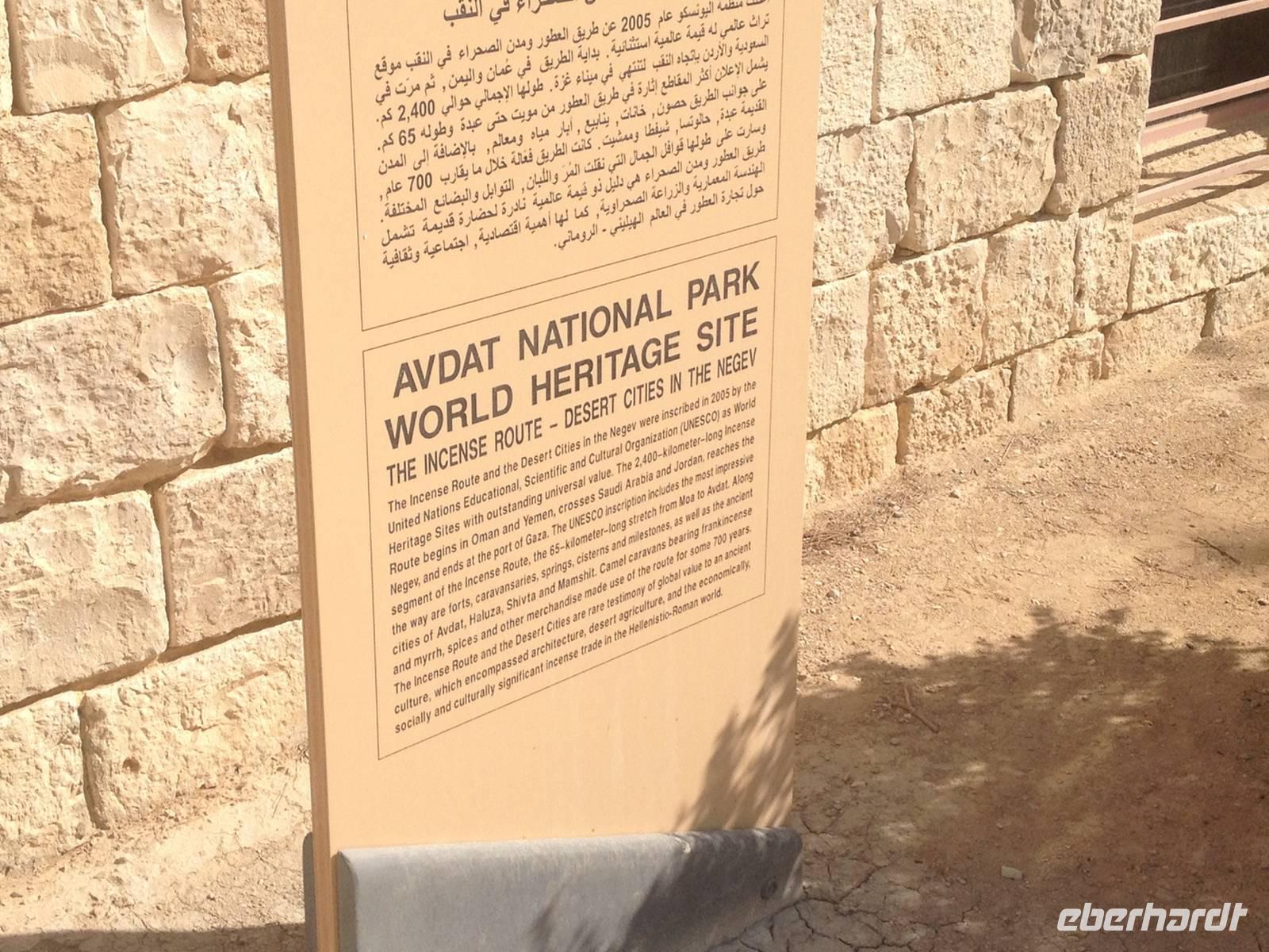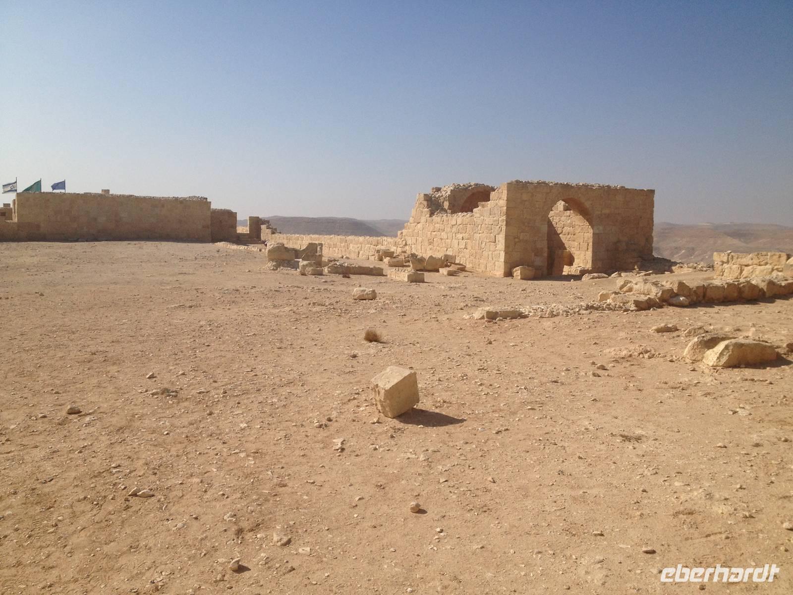 Dann, mitten in der Negev erhebt sich die zerstörte Stadt Awdat (Avdat) über dem Wasserbett der Wildnis von Zin. Einst wanderten die Israeliten hier entlang, später gründeten die nabatäischen Söhne der Wüste (Stichwort Felsenstadt Petra), deren Kamele mit Gewürzen für das Mittelmeer bepackt waren, die Stadt und wurde zur Zwischenstation für ihre Karawanen. Unter der römischen Vorherrschaft entwickelte sich Awdat von der Karawane zur Stadt, und als die Byzantiner das Christentum in den Negev brachten, wurden die nabatäischen Schreine zu Kirchen und Awdat blühte auf wie nie zuvor. Nach dem unterhaltsamen Einführungsfilm überzeugten wir uns selbst davon und machten einen schönen Rundgang durch die gut erhaltene und mit Liebe zum Detail restaurierten Ausgrabungsstätte.