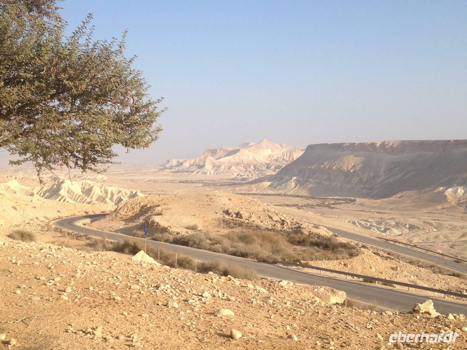 Der weitere Weg führte uns nun in Richtung Negev-Wüste, eine kontrastreiche Landschaft im Süden Israels. In diesem riesigen (12.000 km²), v-förmigen Gebiet im Süden des Landes leben zehn Prozent der Bevölkerung. Begeistert von den einzigartigen Naturschauspielen bekamen wir von David einen Einblick in die israelische Musik, die eine abwechslungsreiche Mischung aus internationalen Musikstilen und der Musik der jüdischen Bevölkerung aus der ganzen Welt ist. Wir passierten auch den Kibbutz Ne'ot Semadar, der für seine hohe Qualität ökologischer Produkte bekannt ist. Im Zentrum der Oase steht das Kulturzentrum, auffällig durch seinen hohen Turm, der zur Luftkühlung im Inneren dient.