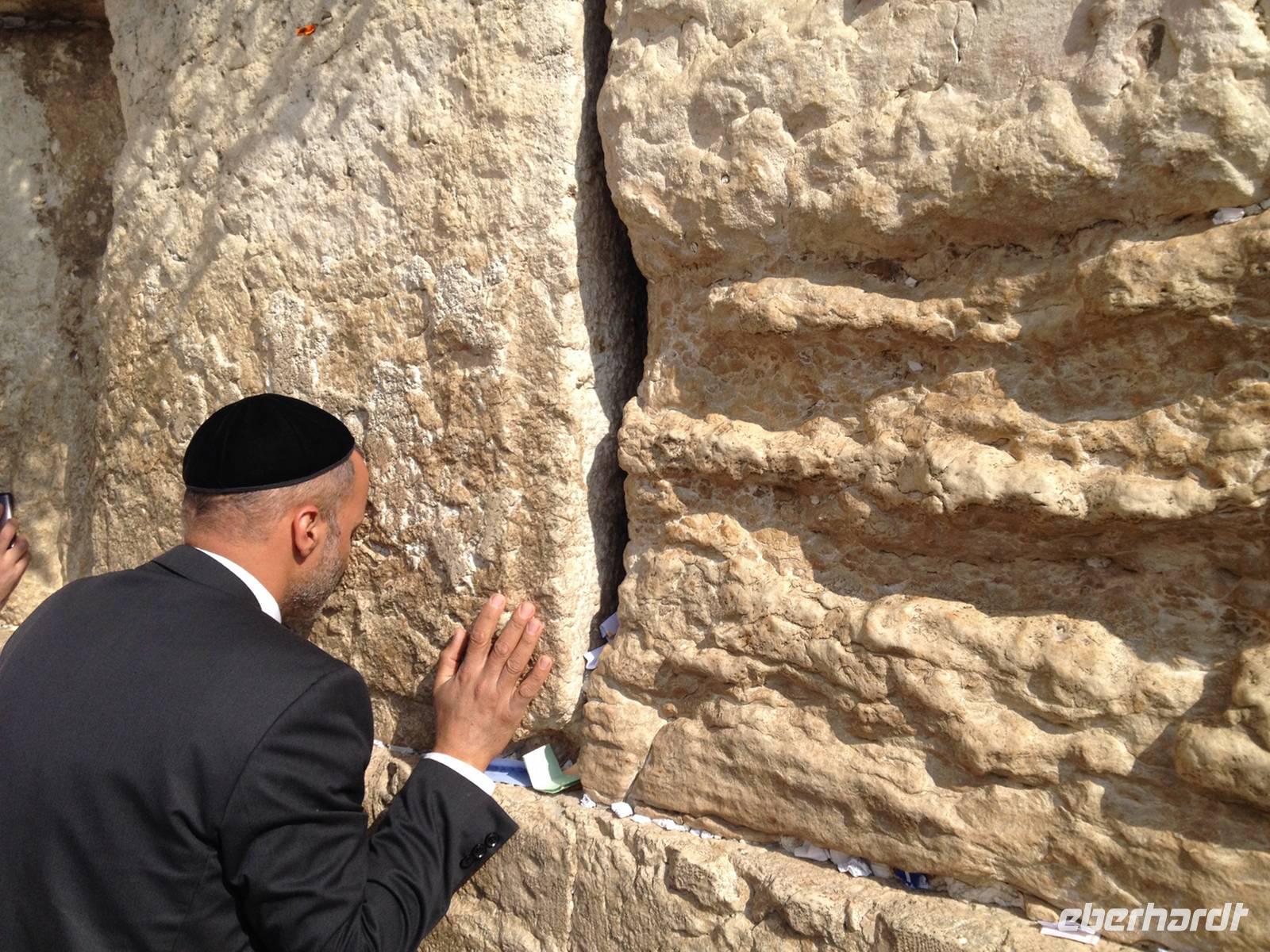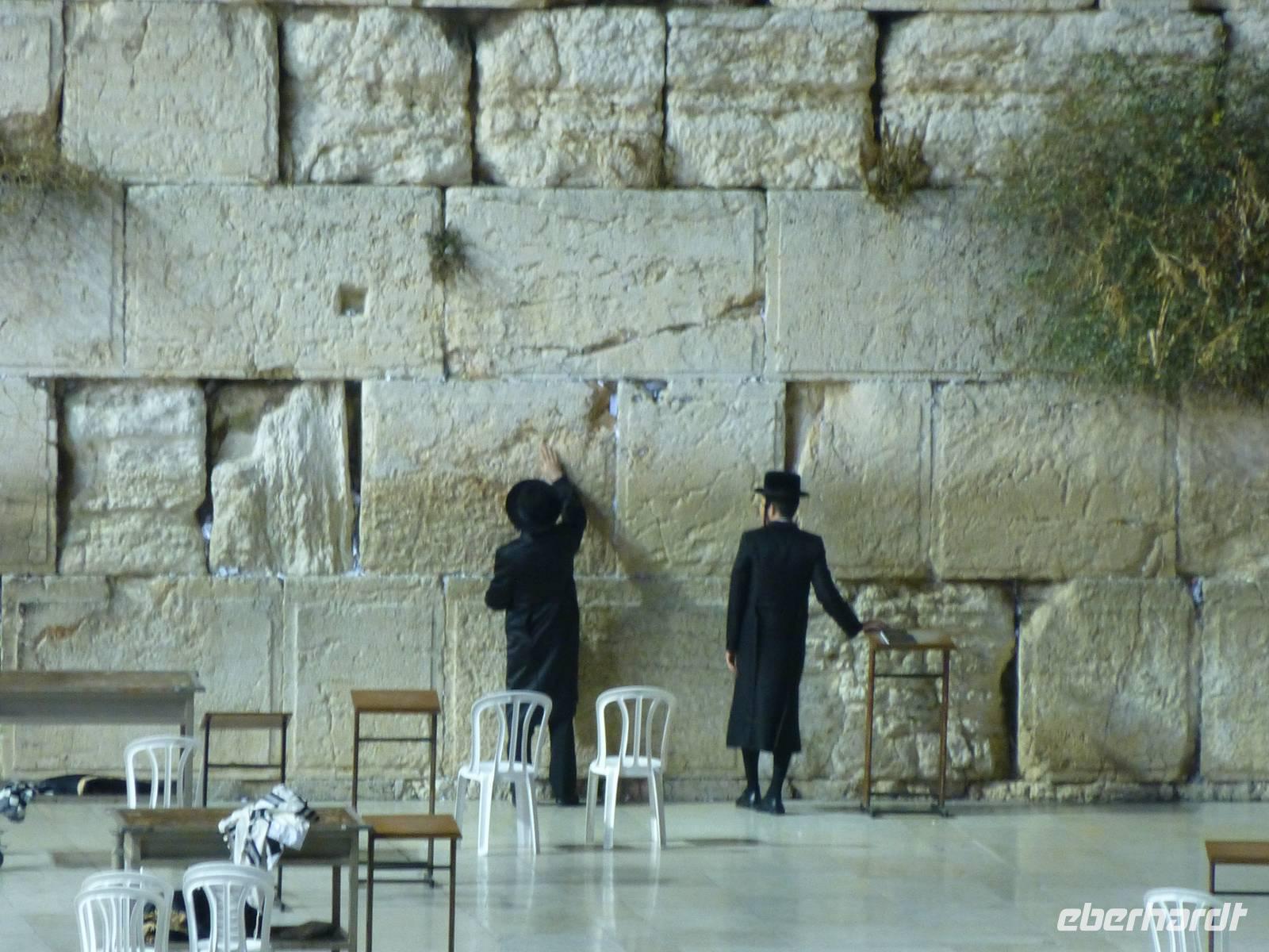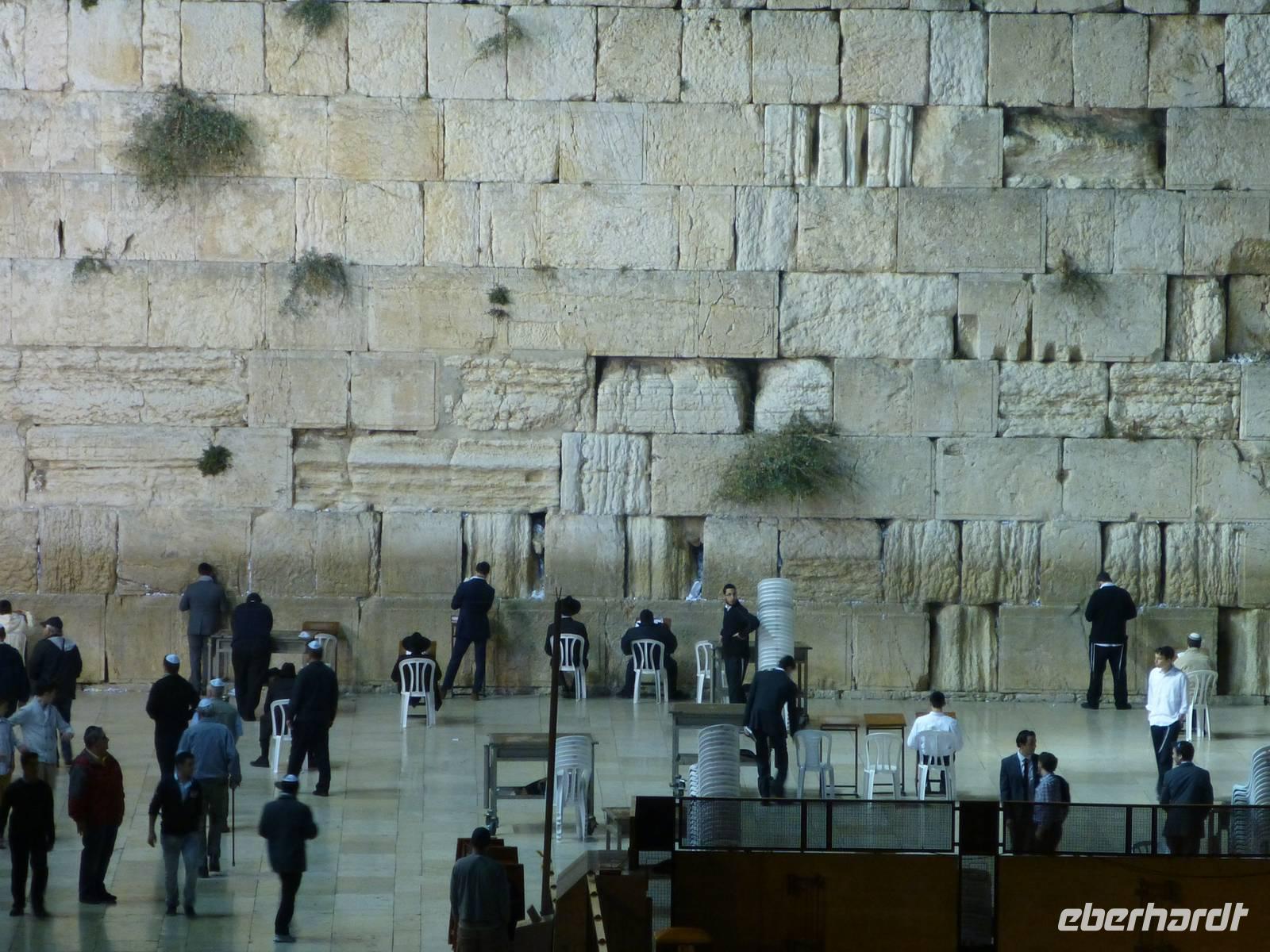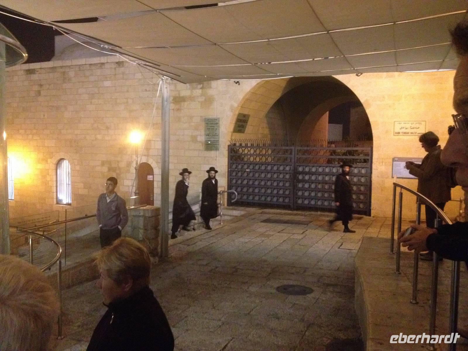 Vorbei am Cardo, die Relikte der römisch-byzantinischen Prachtstraße, erreichten wir einen ruhigen Aussichtspunkt oberhalb der Klagemauer. Hier machten wir einen kleinen Ausflug ins Judentum und David erklärte uns die Entstehung dieser Glaubensrichtung. Nur wenige Schritte waren es von hier bis zum Platz der Klagemauer, die für die Juden kein Platz für Klage ist, sondern ein Ort für Gebete. Der Platz davor ist nach Geschlechtern durch einen Zaun getrennt; der Zugang für Männer ist links, der für die Frauen rechts. Diese Trennung richtet sich nach den Regeln des orthodoxen Judentums, wonach Frauen und Männer in der Synagoge nach Geschlechtern getrennt sind.