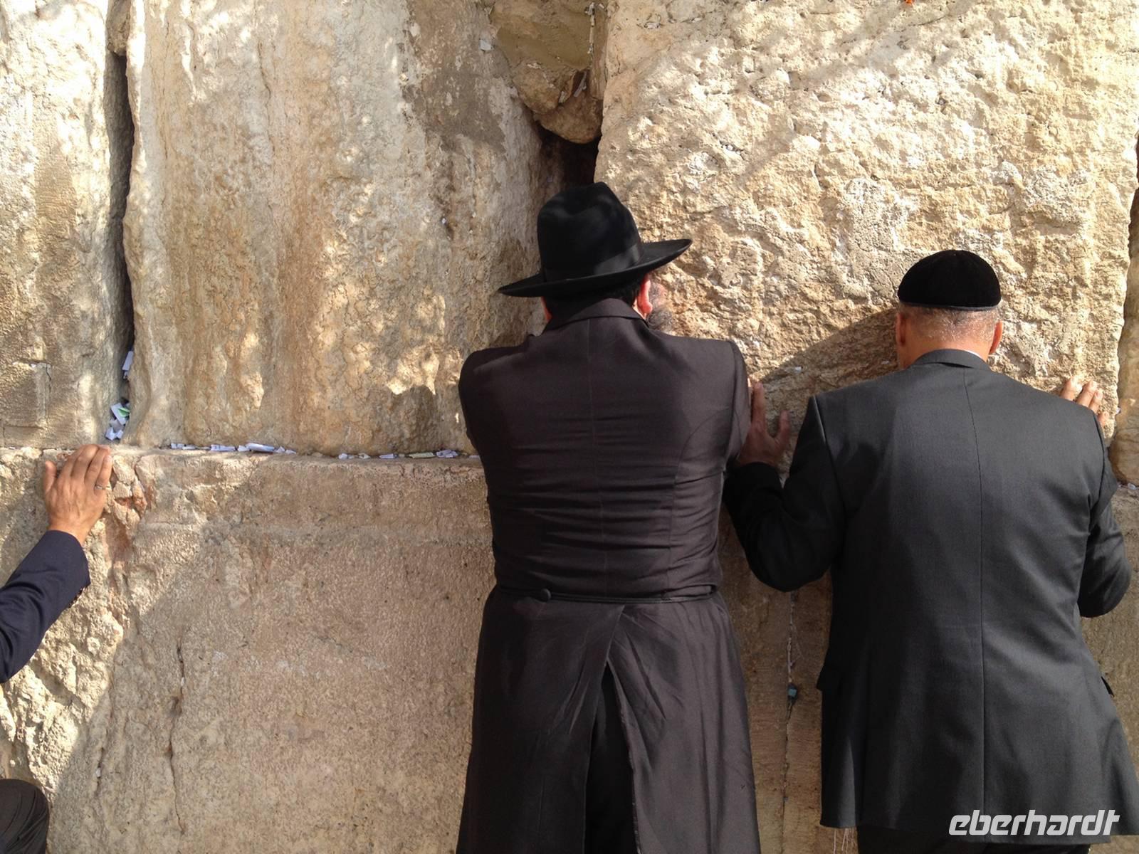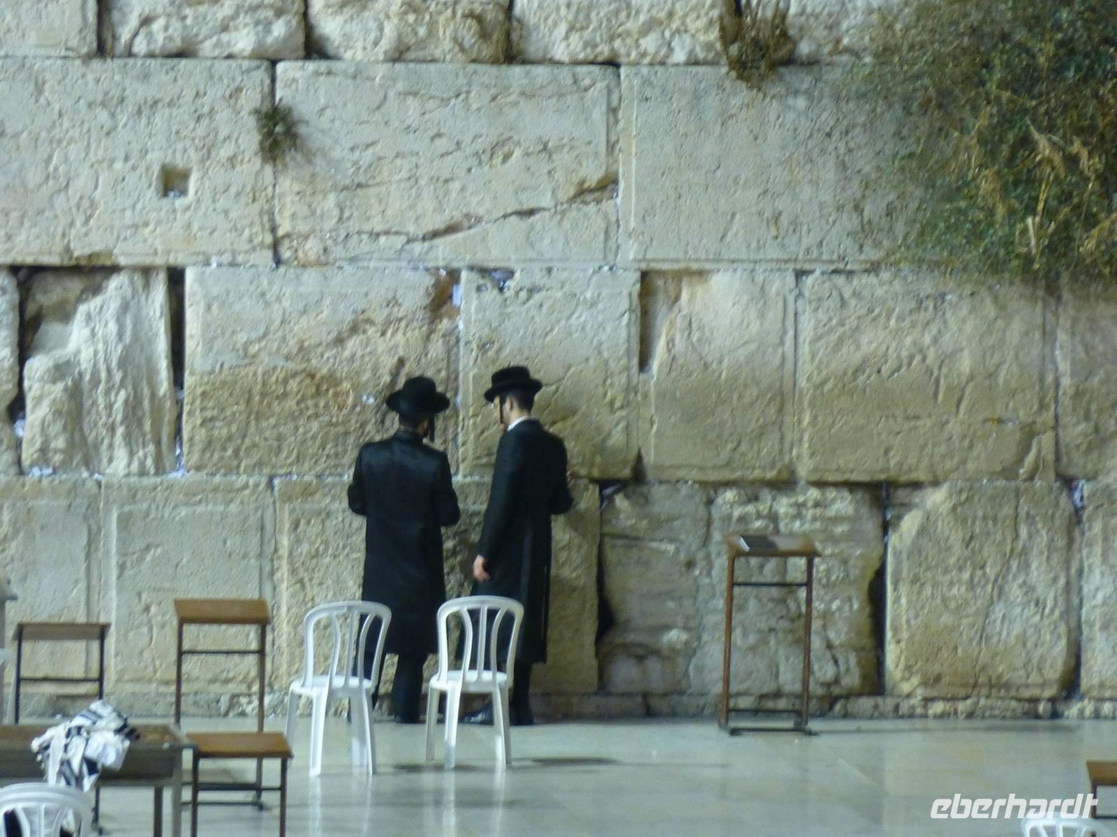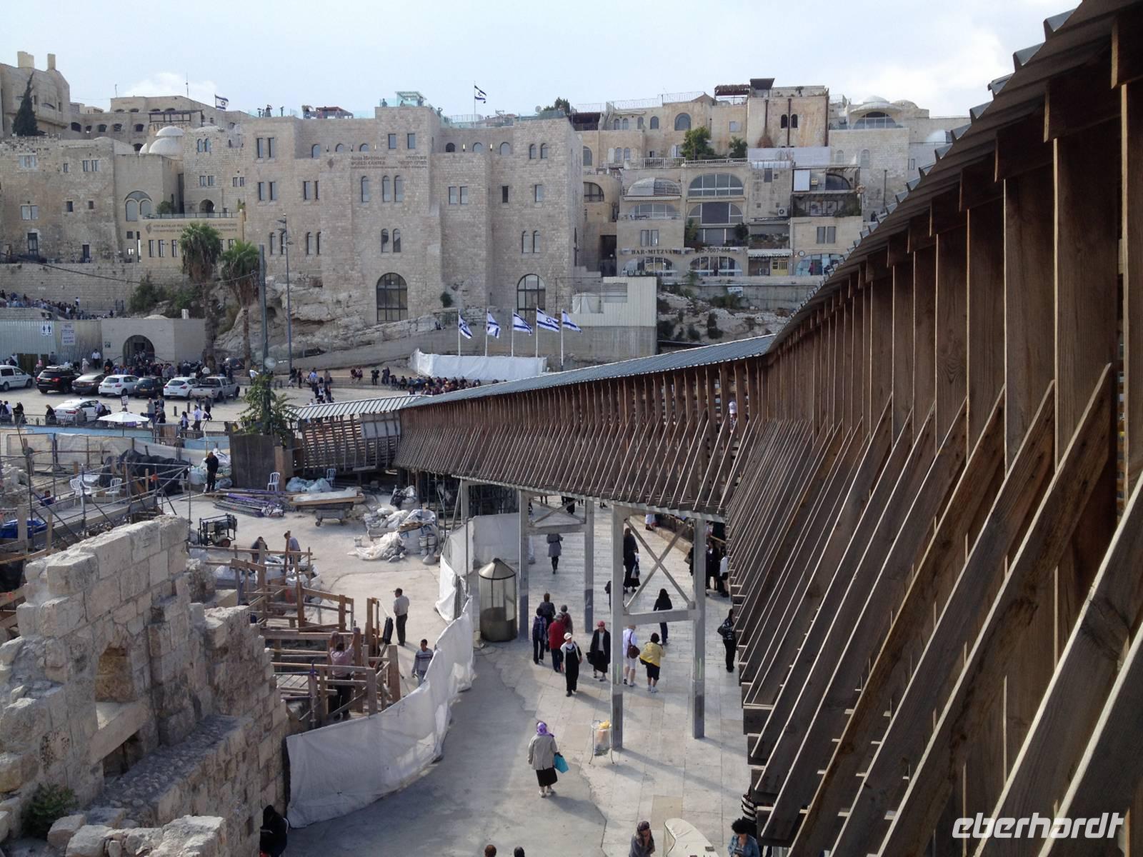 Vorbei am Cardo, die Relikte der römisch-byzantinischen Prachtstraße, erreichten wir einen ruhigen Aussichtspunkt oberhalb der Klagemauer. Hier machten wir einen kleinen Ausflug ins Judentum und David erklärte uns die Entstehung dieser Glaubensrichtung. Nur wenige Schritte waren es von hier bis zum Platz der Klagemauer, die für die Juden kein Platz für Klage ist, sondern ein Ort für Gebete. Der Platz davor ist nach Geschlechtern durch einen Zaun getrennt; der Zugang für Männer ist links, der für die Frauen rechts. Diese Trennung richtet sich nach den Regeln des orthodoxen Judentums, wonach Frauen und Männer in der Synagoge nach Geschlechtern getrennt sind.