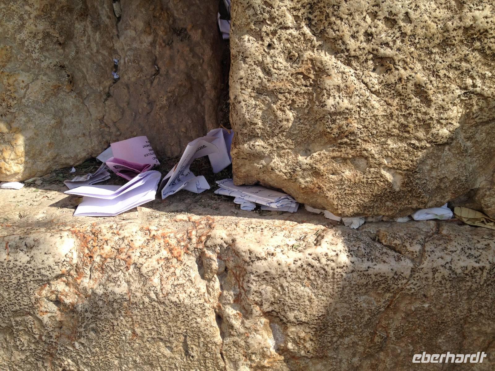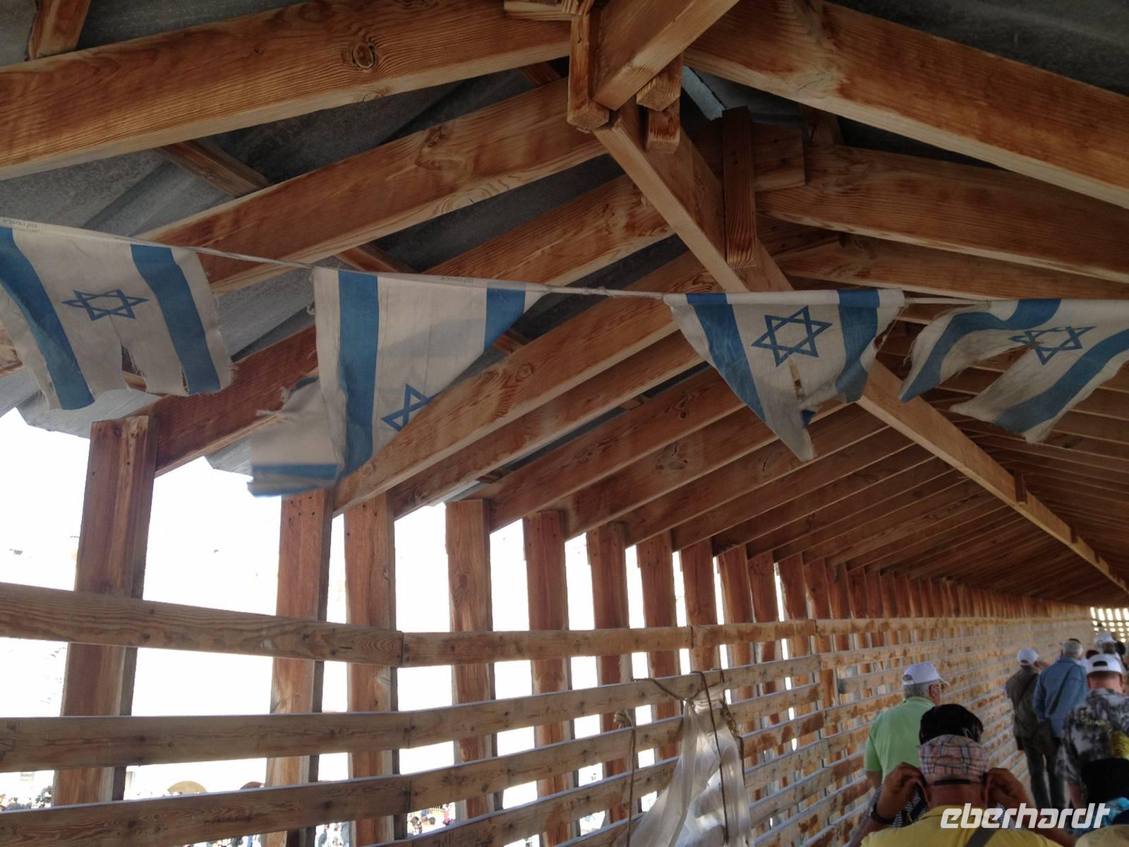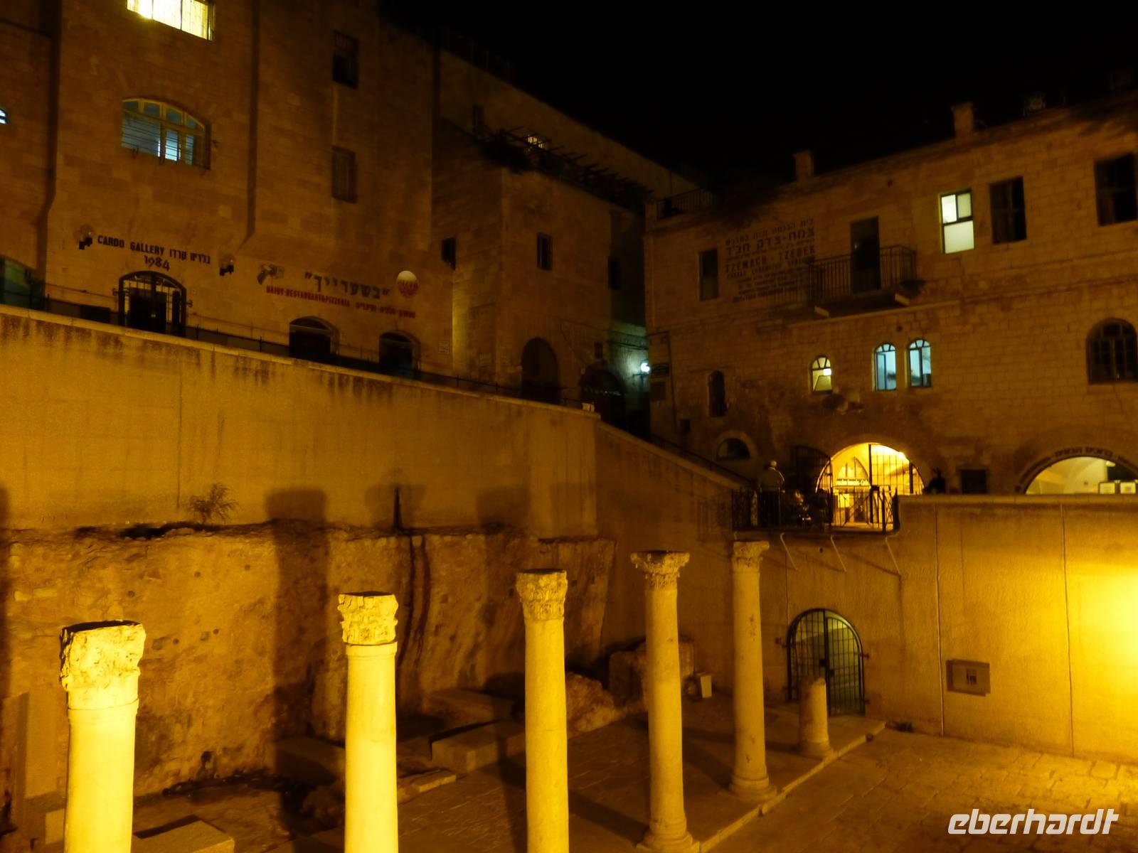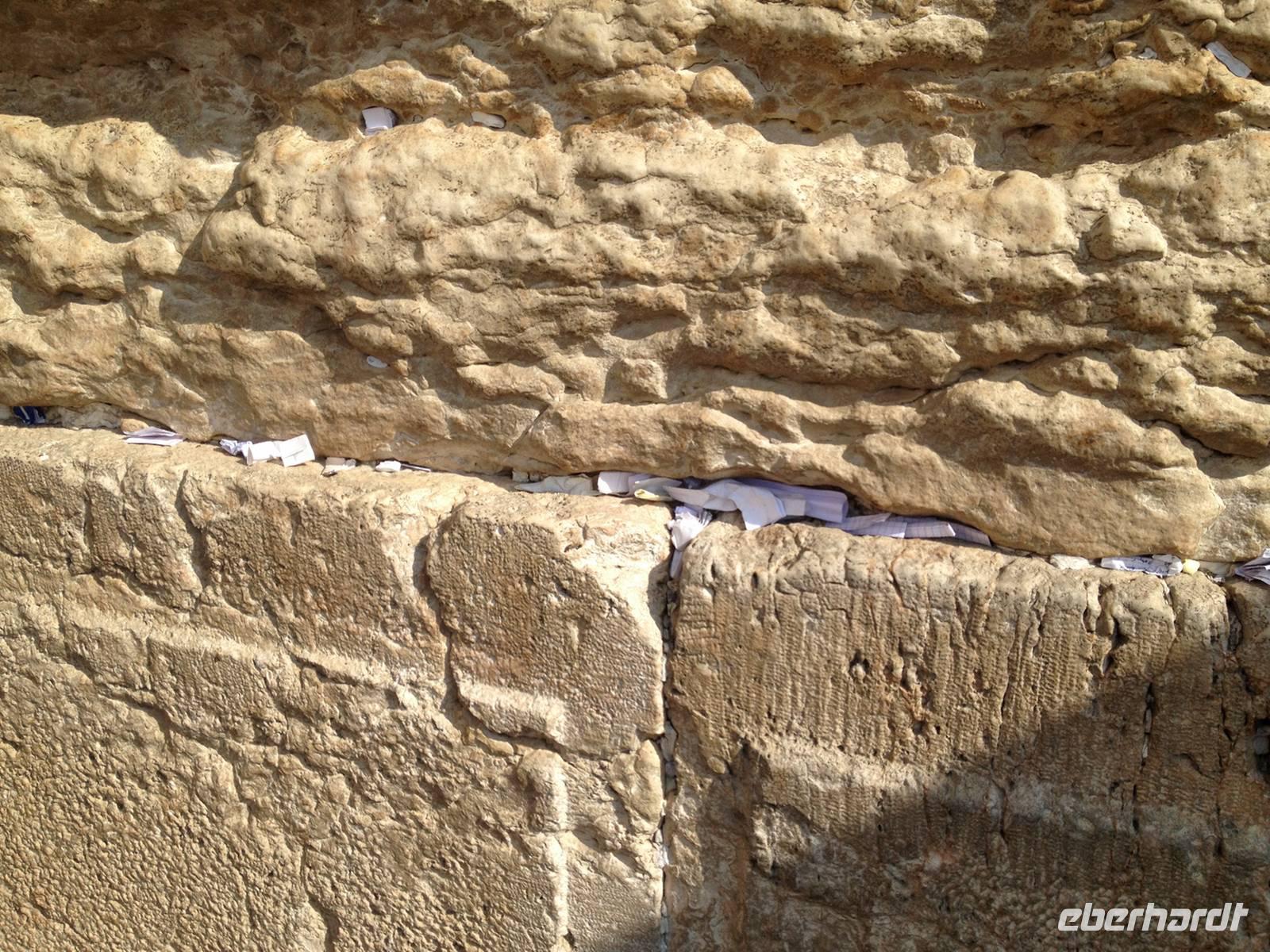 Vorbei am Cardo, die Relikte der römisch-byzantinischen Prachtstraße, erreichten wir einen ruhigen Aussichtspunkt oberhalb der Klagemauer. Hier machten wir einen kleinen Ausflug ins Judentum und David erklärte uns die Entstehung dieser Glaubensrichtung. Nur wenige Schritte waren es von hier bis zum Platz der Klagemauer, die für die Juden kein Platz für Klage ist, sondern ein Ort für Gebete. Der Platz davor ist nach Geschlechtern durch einen Zaun getrennt; der Zugang für Männer ist links, der für die Frauen rechts. Diese Trennung richtet sich nach den Regeln des orthodoxen Judentums, wonach Frauen und Männer in der Synagoge nach Geschlechtern getrennt sind.