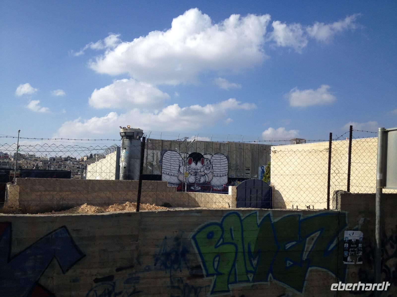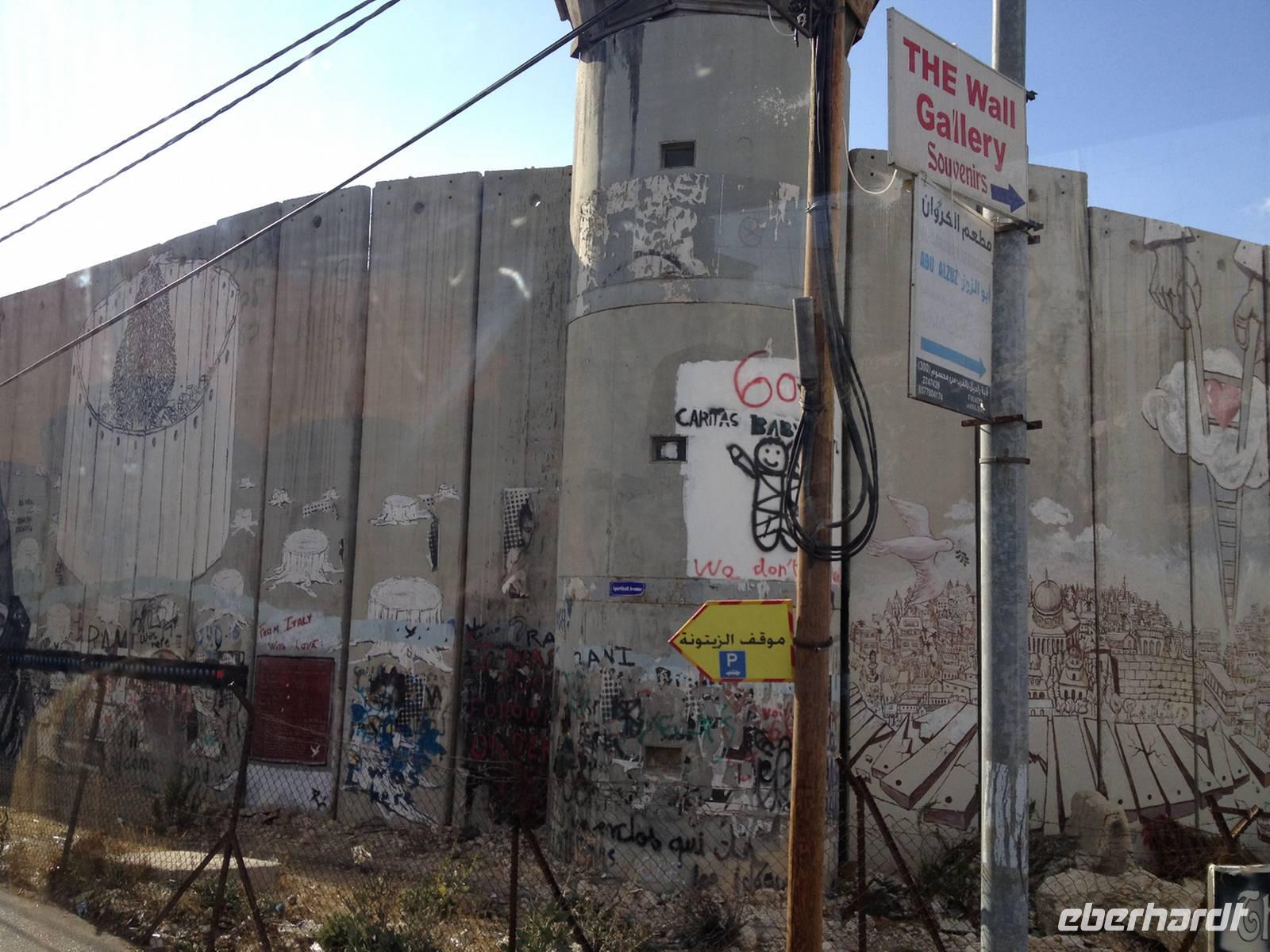 Unterwegs von Jerusalem ins Land diesseits des Jordans (Westjordanland oder Westbank) begegnet man ihr oft: der von Israel so vehement als Schutzwall verteidigten Mauer. Sie zieht sich neben der Straße her, gewaltig und groß und ist an einigen Stellen mit Graffiti besprüht. Ctrl+Alt+Delete hat jemand auf die Wand gesprüht. Diese Abkürzungen kommen aus der Computersprache und sind der Befehl zum erzwungenen, aber kontrollierten Absturz eines Systems, wenn ein Neustart nicht mehr möglich ist - es sind Gedanken der Menschen! Und genau an dieser Mauer am Eingang nach Bethlehem ist heute Schluss für unseren Reiseleiter David. Er darf als Israeli nicht hierher. Deswegen begleitet uns heute der palästinensische Reiseleiter Shukrin hier in Palästina.