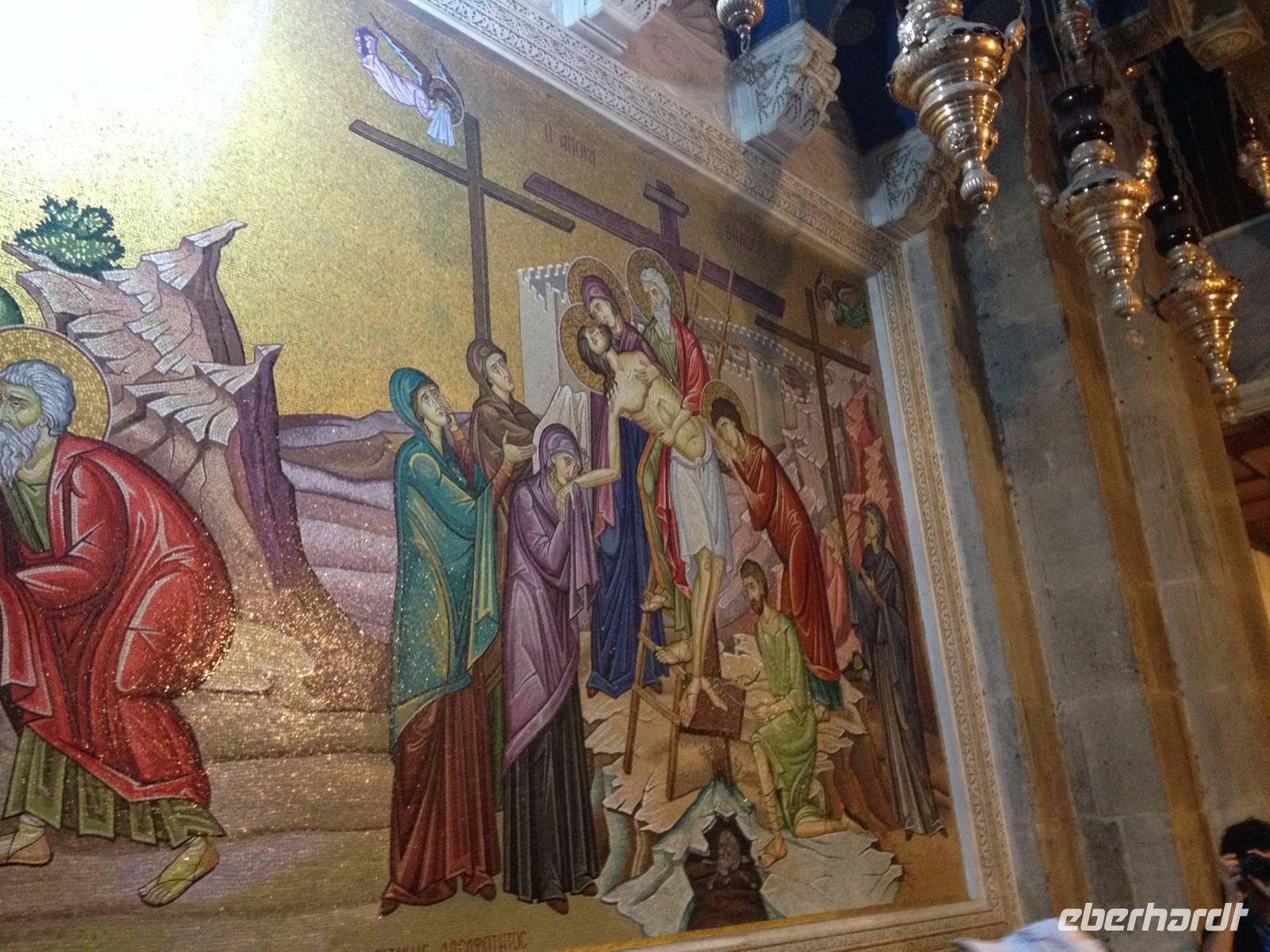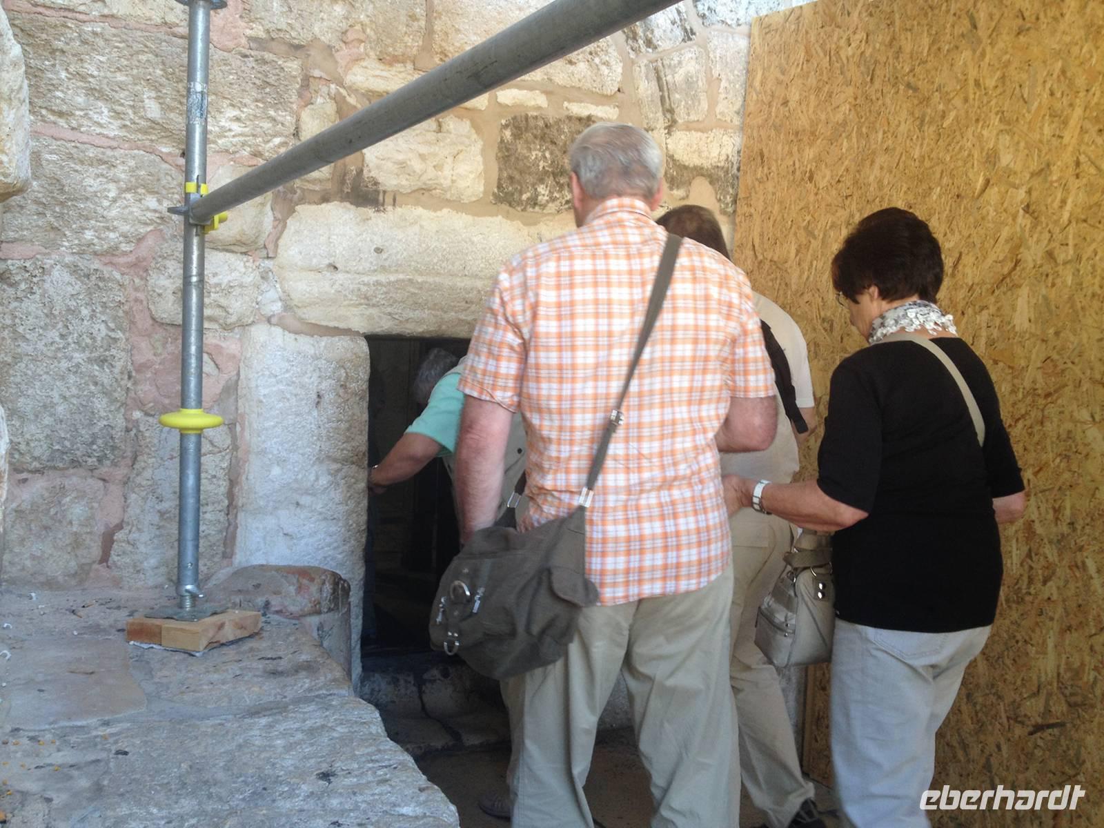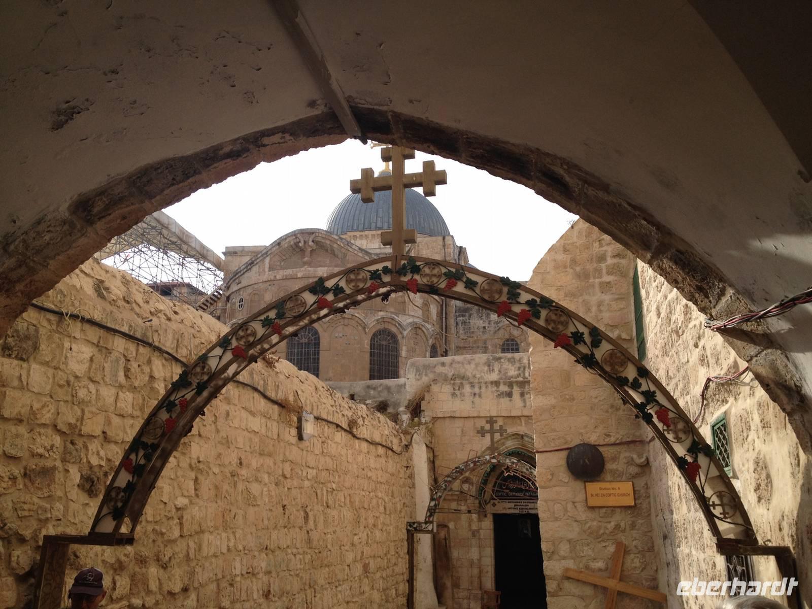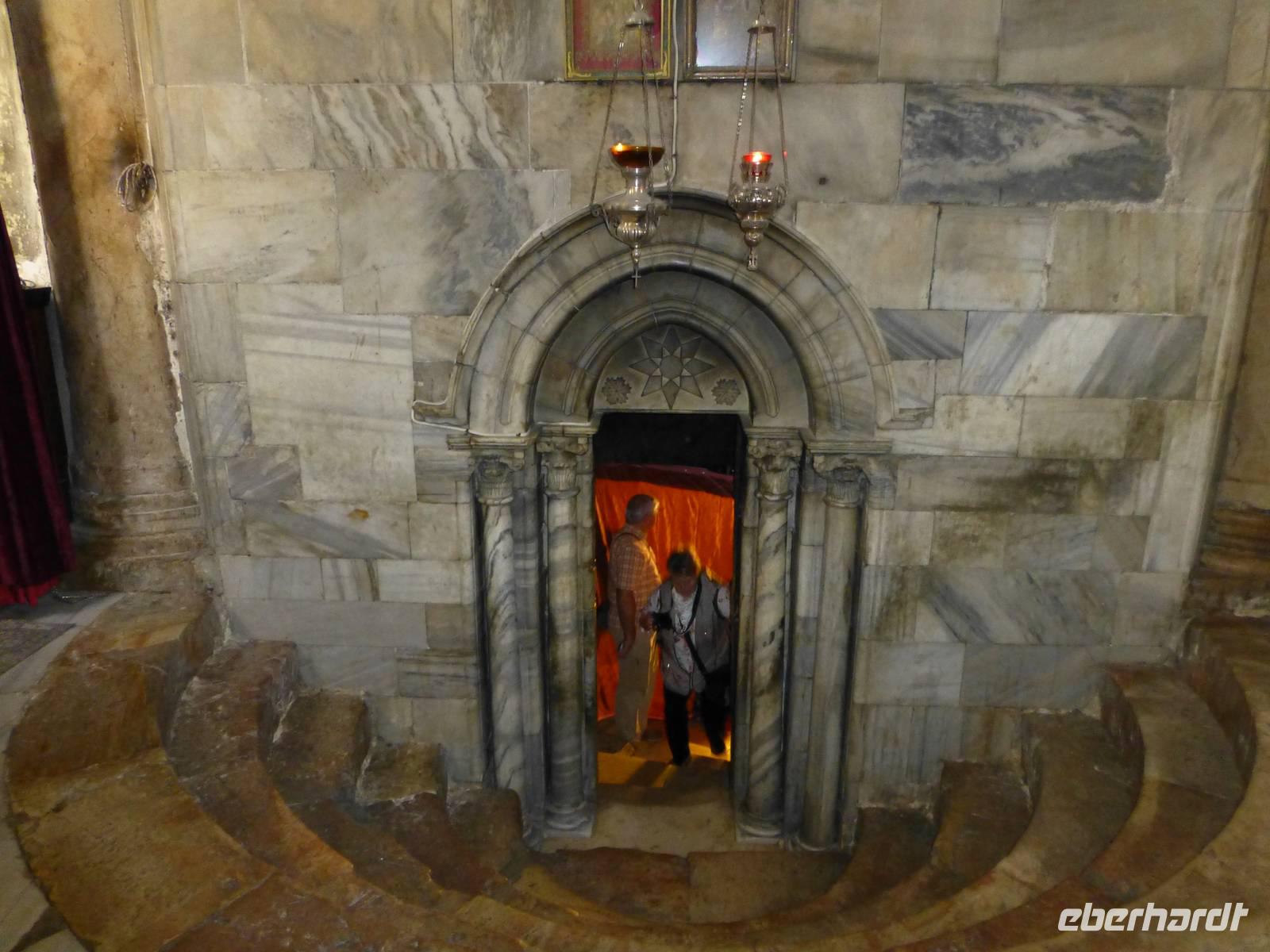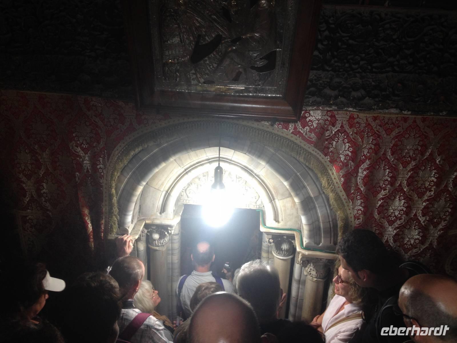 Beim Betreten der Kirche fielen uns gleich kniende Gläubige auf, die den Salbungsstein vor und nach dem Gebet küssten. Selbst als stiller Beobachter ist es wahnsinnig interessant! Unmittelbar daneben führte uns eine steile Treppe hinauf in die zweischiffige Golgotakapelle, die von drei Altären dominiert wird. Hier kann man (auch auf dem Boden kniend) unter einer silbernen Platte die Vertiefung ertasten, in der das Kreuz Jesu stand. Daneben befindet sich der Felsspalt, der sich beim Tod Jesu auftat. Über die Treppe gingen wir wieder hinunter und erreichten die große Grabrotunde, wo das Grab Jesu unter einer großen Kuppel liegt - die XIV. und letzte Station des Leidensweges.