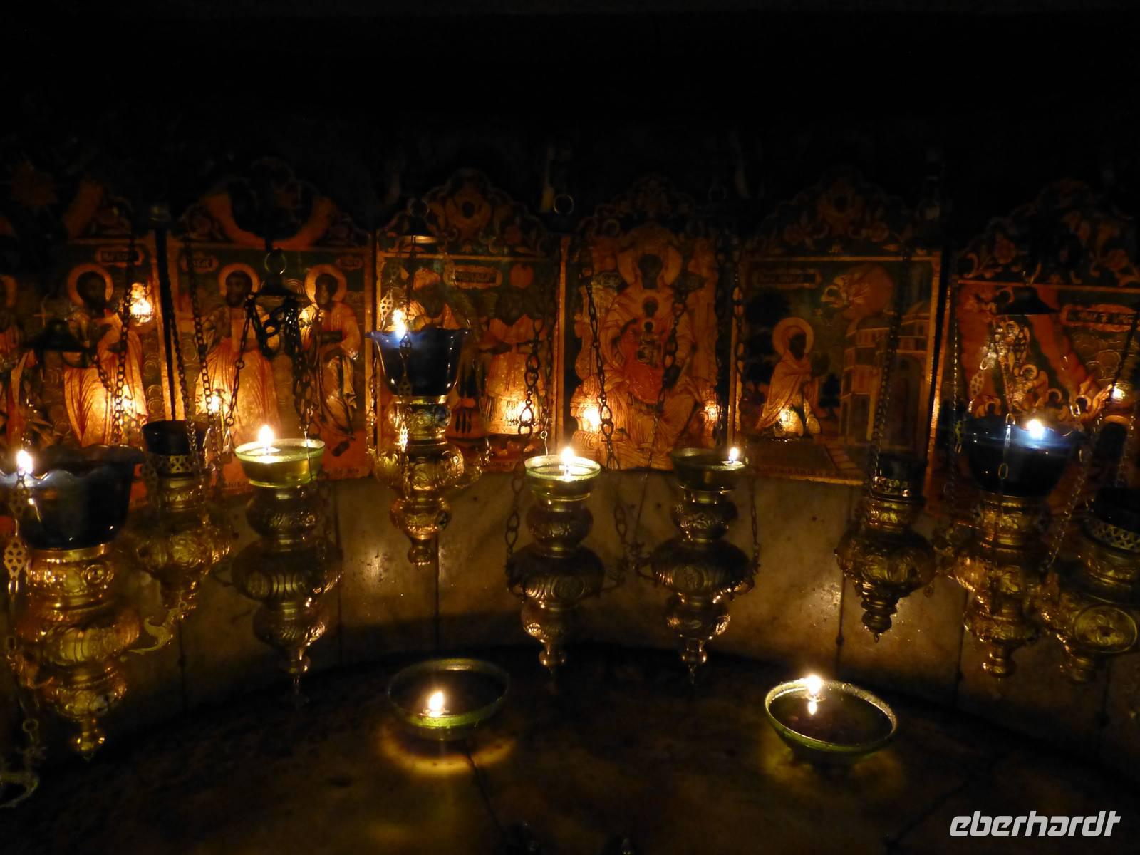 Unser erstes Ziel war die Geburtskirche, eine der wichtigsten Wallfahrtsorte der Christenheit. Aber auch hier gilt, was wir in Nazareth schon erlebten. Der Besuch war ein spirituelles Erlebnis! Nachdem wir durch das nur 1,20 m hohe Demutstor in die Kirche eintraten, mussten wir Geduld beweisen, um das Heiligste der Kirche zu sehen: die Geburtsgrotte Jesu! Der silberne Stern markiert hier die Stelle, an der Jesus geboren wurde. Öllampen brennen hier Tag und Nacht und nur griech.-orthodoxe Gläubige dürfen die Grotte für ihre Messen nutzen. Katholiken ist es lediglich erlaubt, den Silberstern zu beweihräuchern. Da die römisch-katholische, die griechisch-orthodoxe und die armenische Kirche gemeinsame Eigentümer sind, wurde aber bereits unter britischem Mandat eine Verordnung beschlossen, die bis heute regelt, wer wann seine Messen halten und die Grotte besuchen darf.