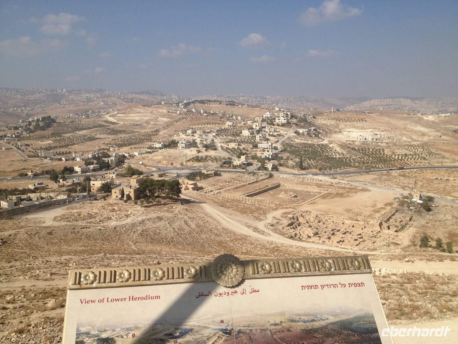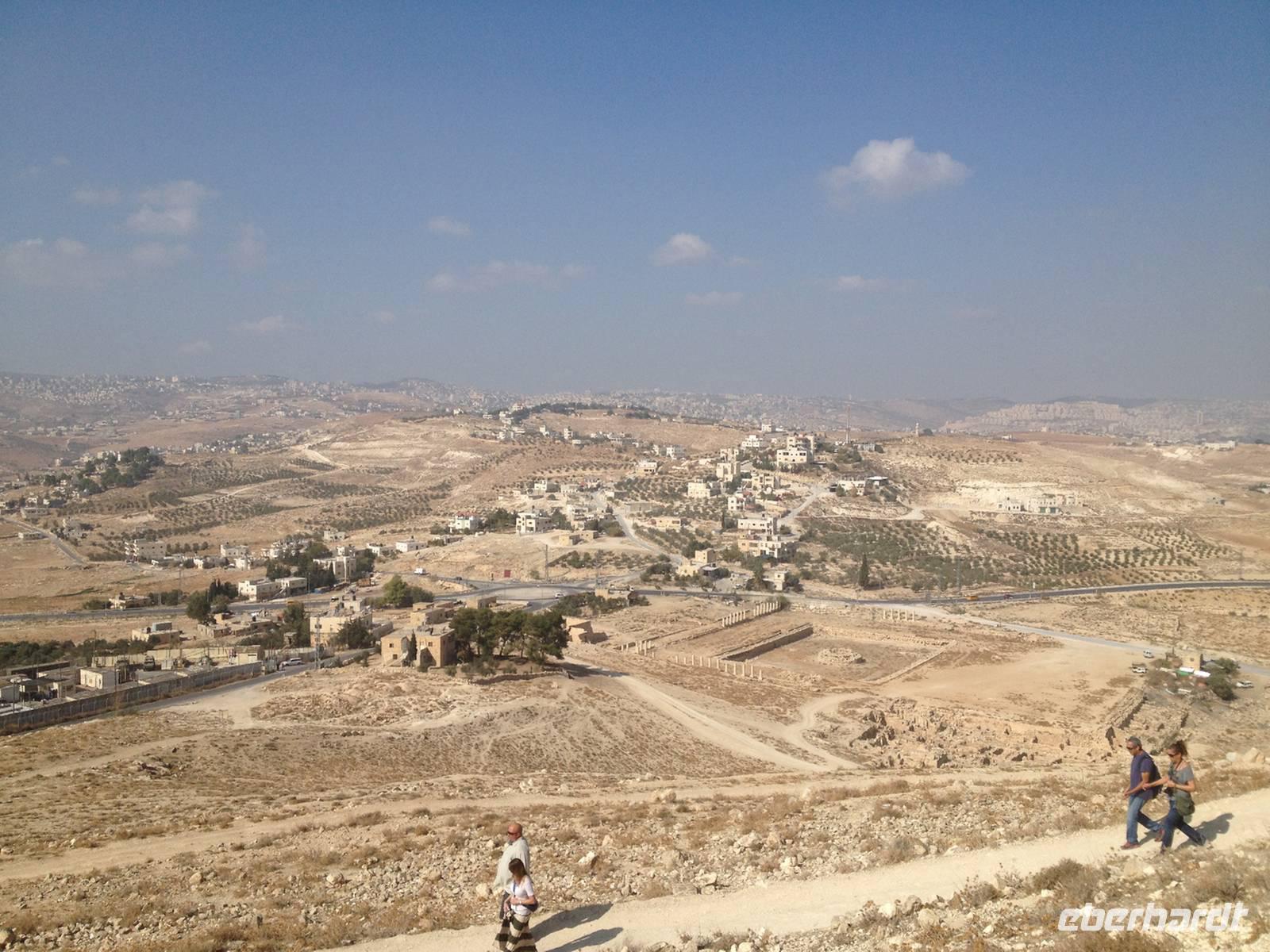 Nach diesem Besuch der besonderen Art besuchten wir das Herodion südöstlich von Bethlehem. Zwischen 24 und 15 v. Chr. ließ hier Herodes der Große den als Mausoleum gedachten Palast errichten, der die Umgebung um 100 m überragt und auf dem ersten Blick einem schlummernden Vulkan gleicht. Wir sahen einen Mauerring mit Türmen, die Gemächer, Bäder und Abwehranlagen und konnten einen sehr guten Rundblick genießen.