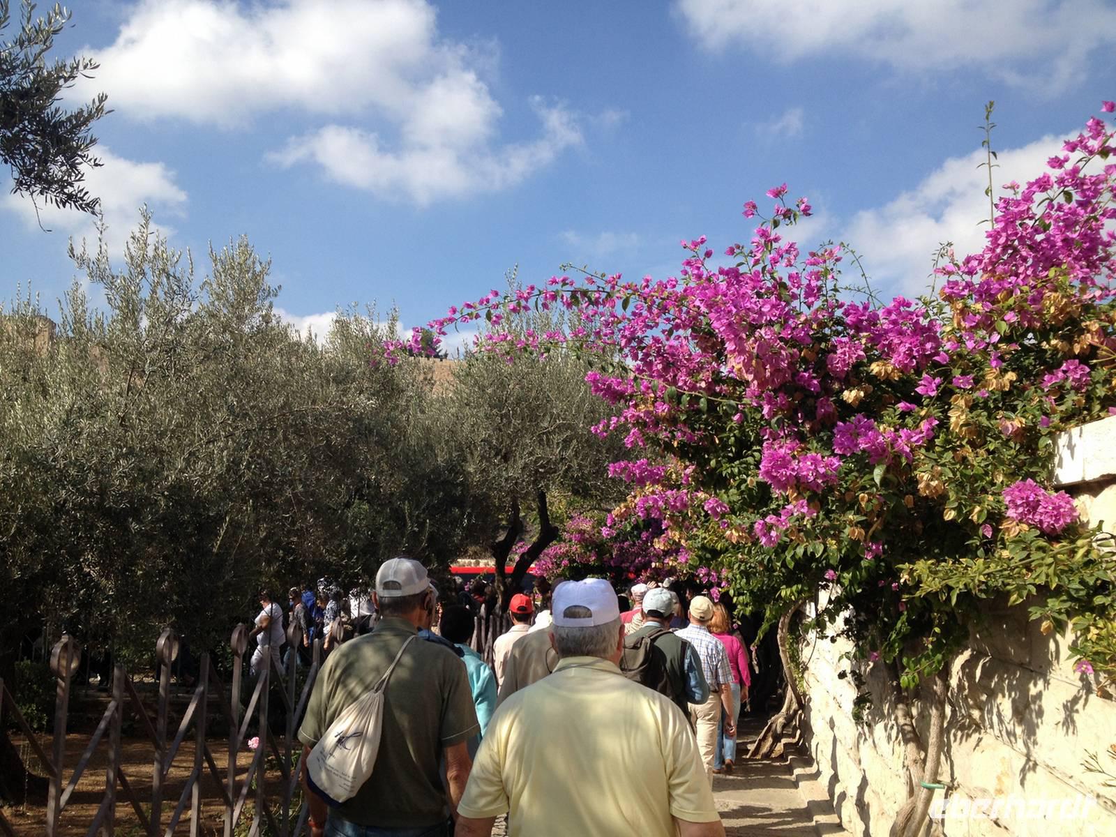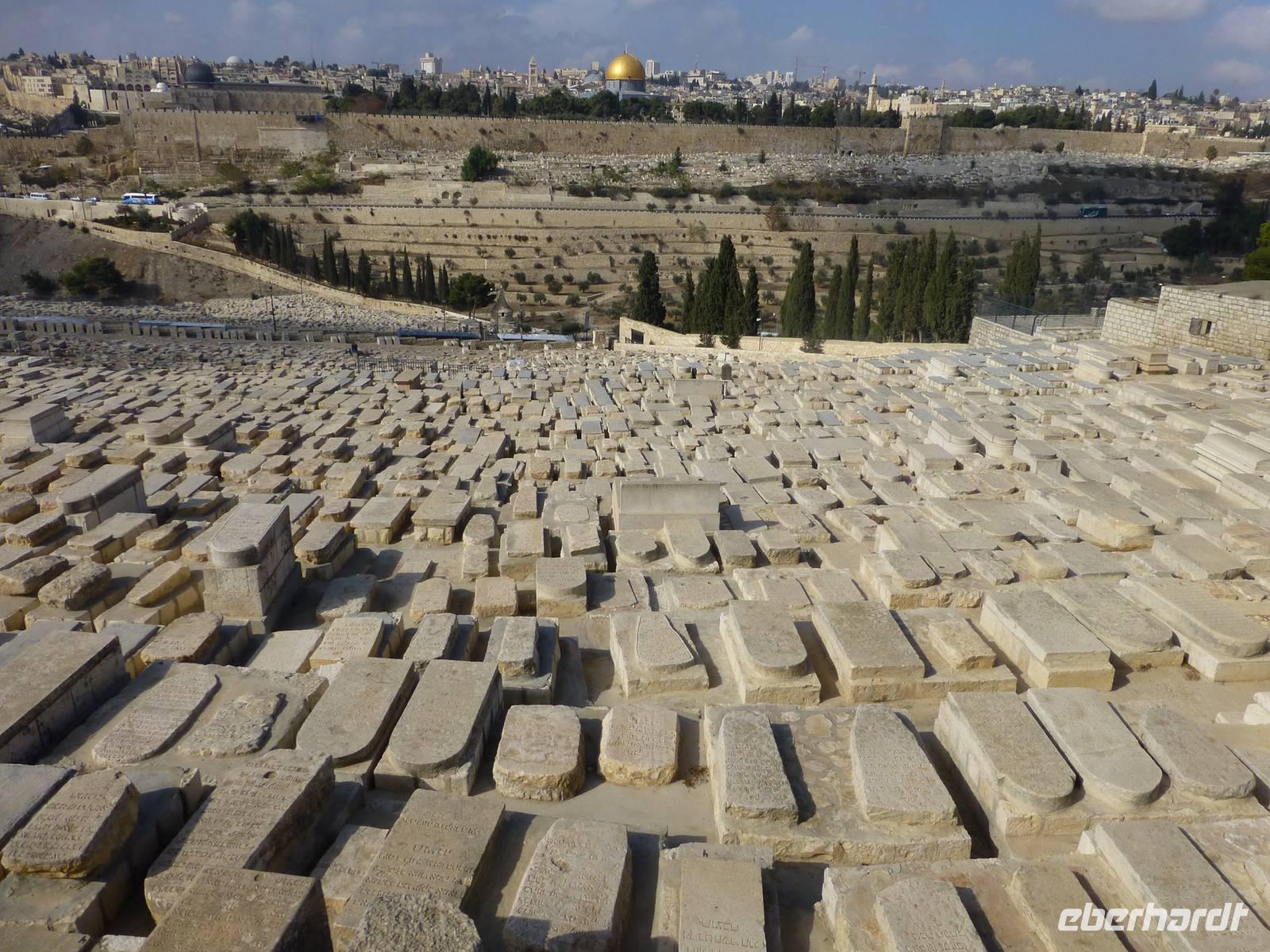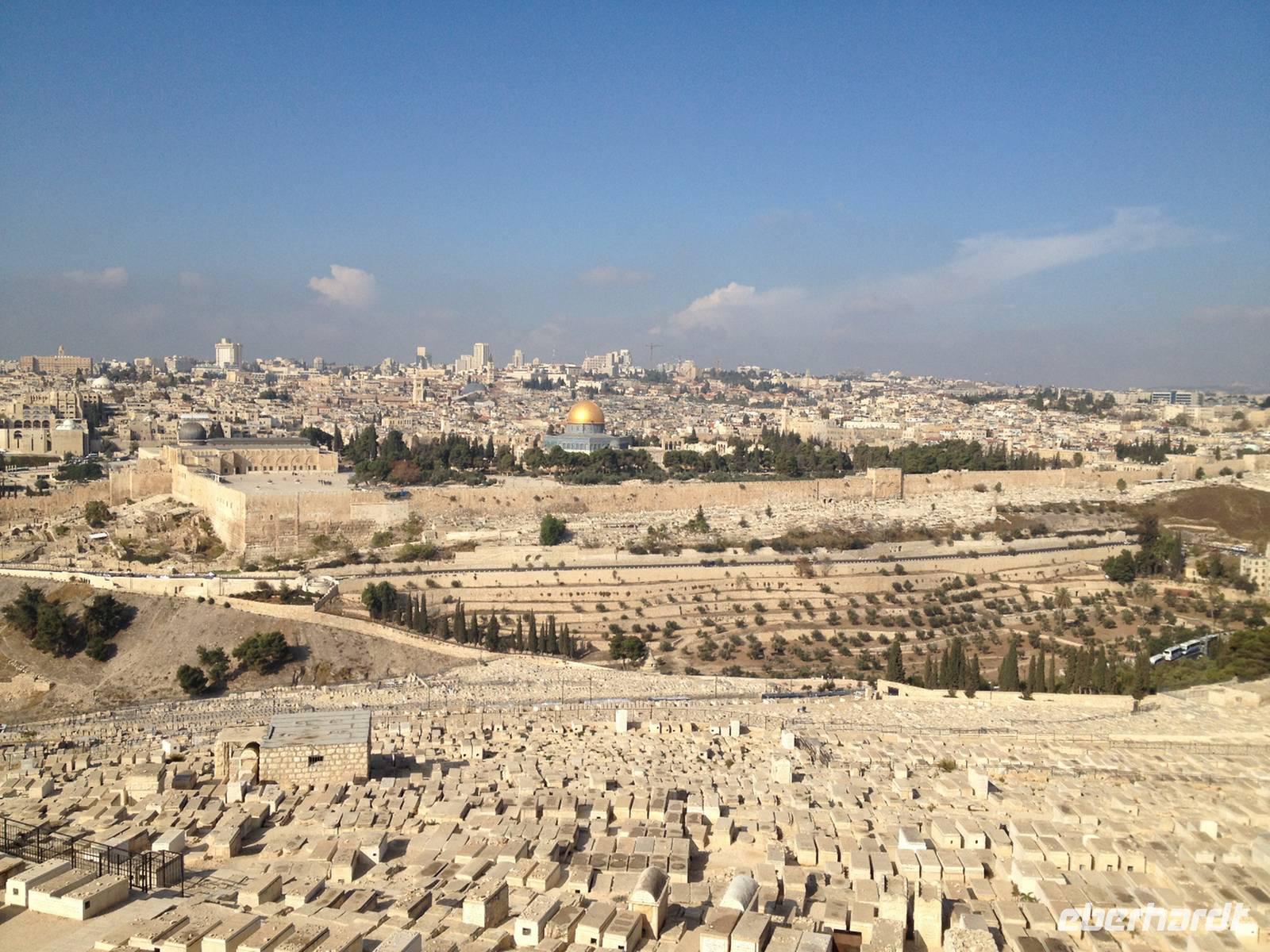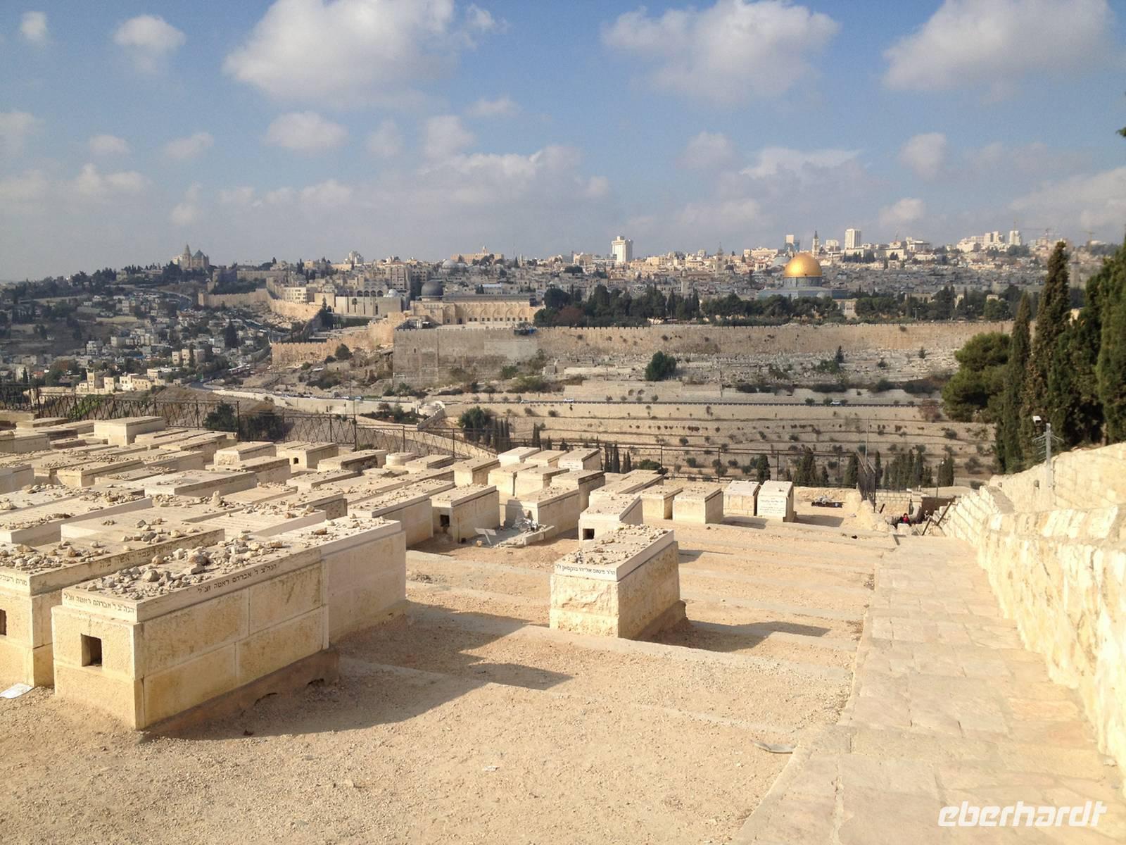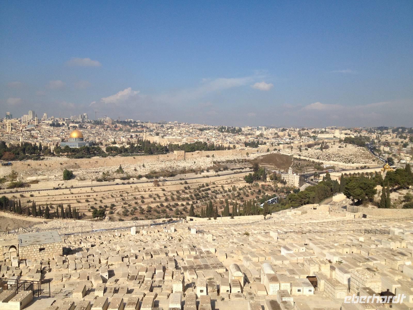 Jerusalems faszinierende Geschichte und vor allem die Spuren Jesu beginnen nicht erst an den Mauern der Stadt. Auf dem Ölberg starteten wir unseren heutigen Tag mit einem atemberaubenden Panorama auf die Stadt. Bei herrlichstem Wetter standen wir dem Felsendom mit seiner goldenen Kuppel genau gegenüber - Zeit für ein Gruppenfoto! Vor lauter Begeisterung vergisst man, dass der 740 m hohe Berg, der seinen Namen den dichten Olivenhainen verdankt, der größte jüdische Friedhof der Welt, hohes jüdisches und christliches Heiligtum ist. Hier verbrachte Jesus den letzten Abend mit seinen Jüngern. Hier wurde Jesus nach dem Verrat des Judas verhaftet. Und von diesem Berg wurde Jesus „aufgehoben gen Himmel und setzte sich zur Rechten Gottes".