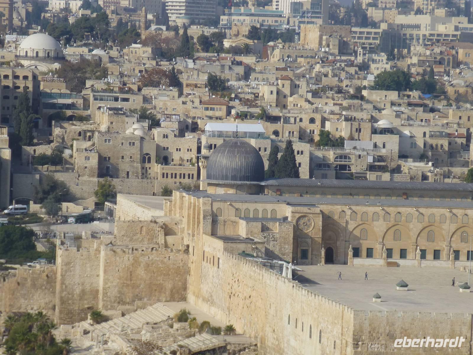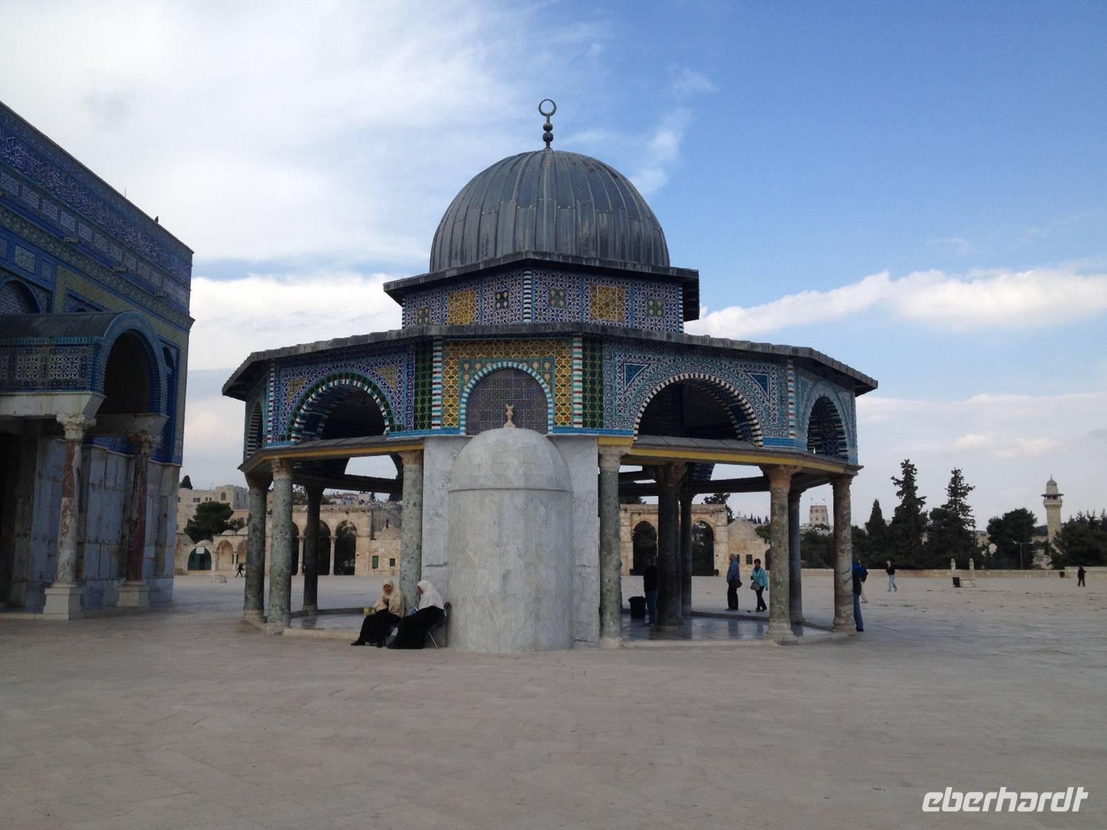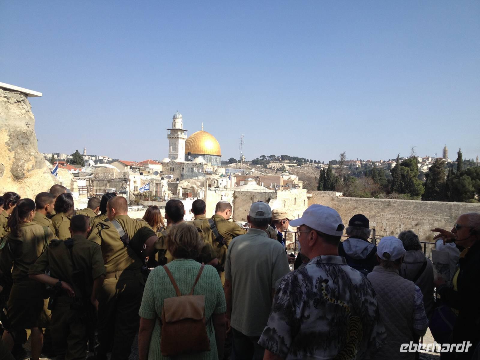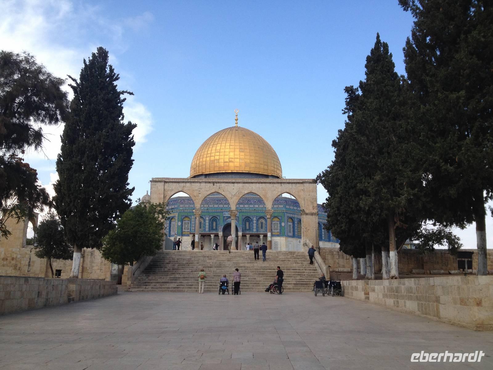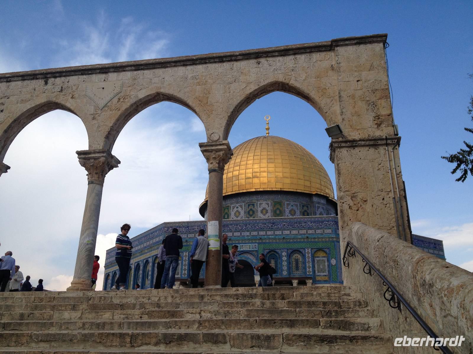 Nun hieß es wieder einmal Geduld beweisen, denn wir wollten natürlich das Heiligste der Stadt auch noch besuchen: den Tempelberg. Nur zweimal am Tag (in den frühen Morgenstunden und am Mittag) dürfen Nicht-Muslime den Tempelberg nach einer Sicherheitskontrolle über eine provisorisch errichtete Rampe für 1 Stunde betreten. Zum Glück hatten wir eine gute Position und hatten das große Glück, hinaufzukommen. Von der Al-Aqsa-Moschee führte uns eine breite Freitreppe zum großartigen Felsendom. Wahnsinn: 54 m misst die vergoldete Kuppel, die auf einem Oktogon ruht, das mit farbigem Marmor und blauen, weißen und grünen Kacheln verkleidet ist. Errichtet wurde dieses Wahrzeichen der Stadt 688 bis 691 zur Erinnerung an Mohammeds Himmelfahrt.
