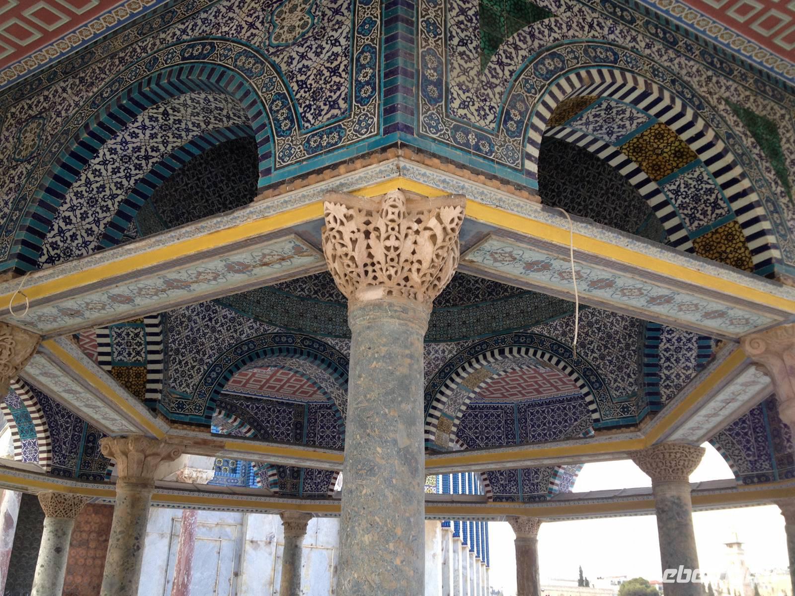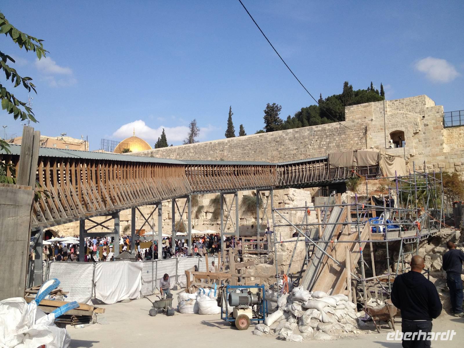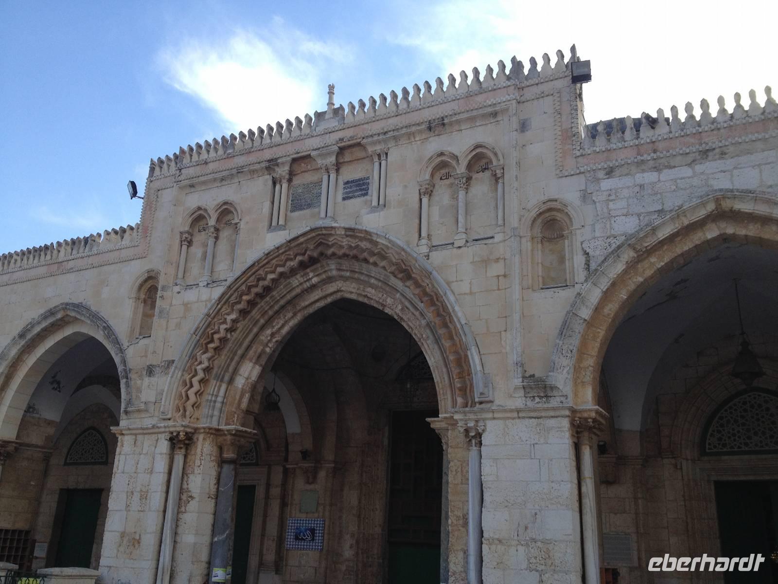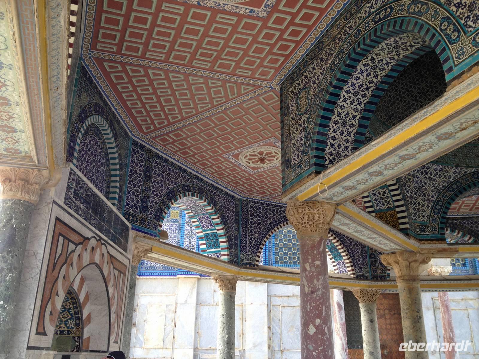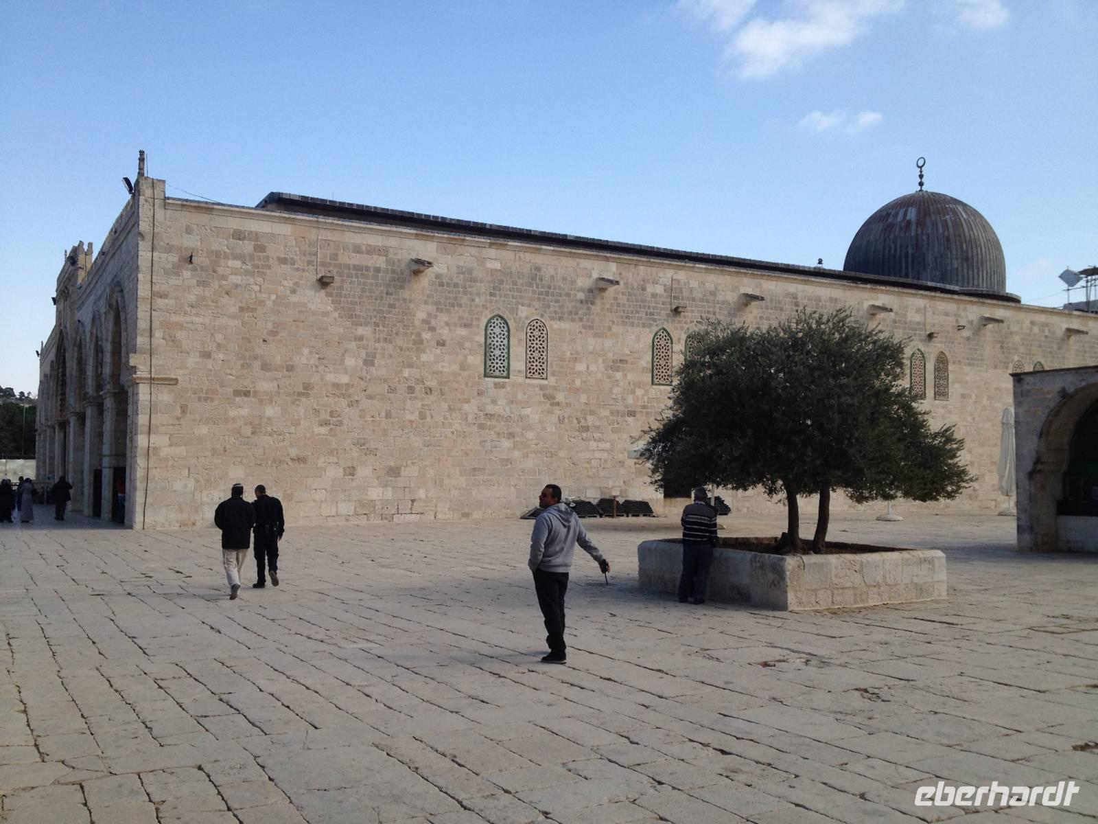 Nun hieß es wieder einmal Geduld beweisen, denn wir wollten natürlich das Heiligste der Stadt auch noch besuchen: den Tempelberg. Nur zweimal am Tag (in den frühen Morgenstunden und am Mittag) dürfen Nicht-Muslime den Tempelberg nach einer Sicherheitskontrolle über eine provisorisch errichtete Rampe für 1 Stunde betreten. Zum Glück hatten wir eine gute Position und hatten das große Glück, hinaufzukommen. Von der Al-Aqsa-Moschee führte uns eine breite Freitreppe zum großartigen Felsendom. Wahnsinn: 54 m misst die vergoldete Kuppel, die auf einem Oktogon ruht, das mit farbigem Marmor und blauen, weißen und grünen Kacheln verkleidet ist. Errichtet wurde dieses Wahrzeichen der Stadt 688 bis 691 zur Erinnerung an Mohammeds Himmelfahrt.
