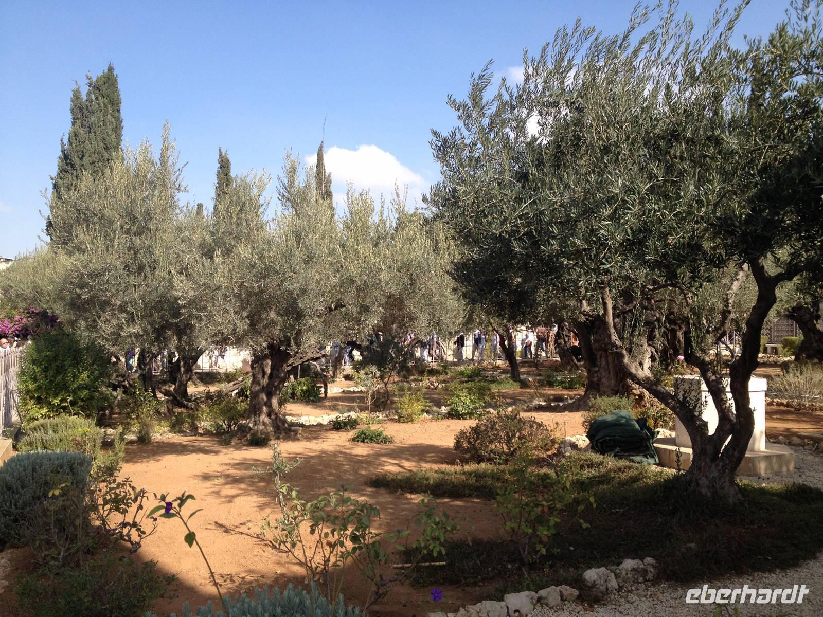 Auf dem jüdischen Friedhof, den wir vom Ölberg aus in voller Größe schon sahen, erfuhren wir von David viel Wissenswertes über das Judentum. Im Garten Gethsemane, in dem sich Jesus mit seinen Jüngern zu treffen pflegte, besuchten wir die Kirche der Nationen. Hinreißend schön ist das Giebelmosaik, welches Jesus in der Mitte zwischen Gott und den Menschen steht. Im Inneren tauchen dunkelblaue Alabasterfenster den Raum in fast mystisches Licht. Das Zentrum allerdings bildet ein mächtiger Stein, auf dem Jesus gebetet haben soll.