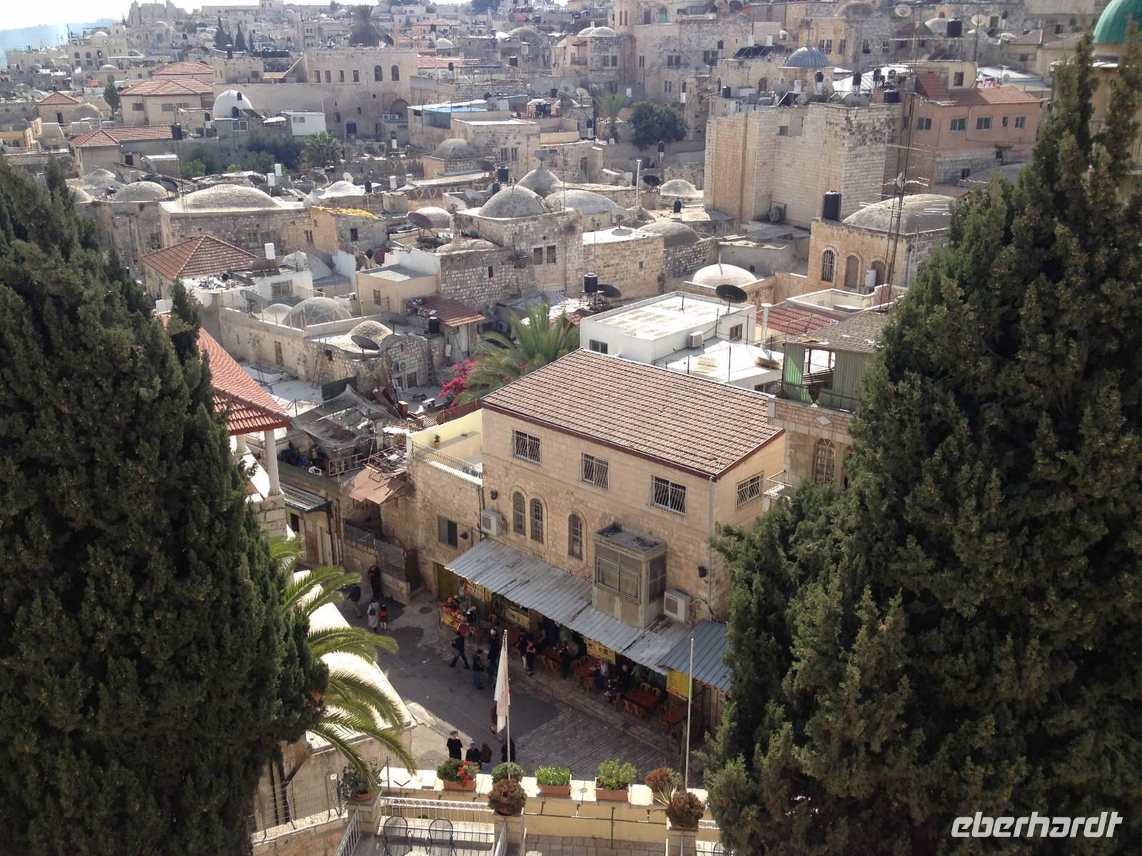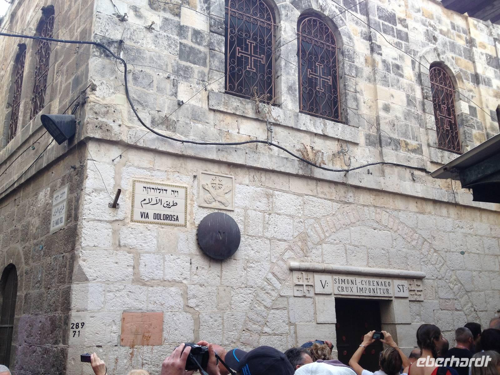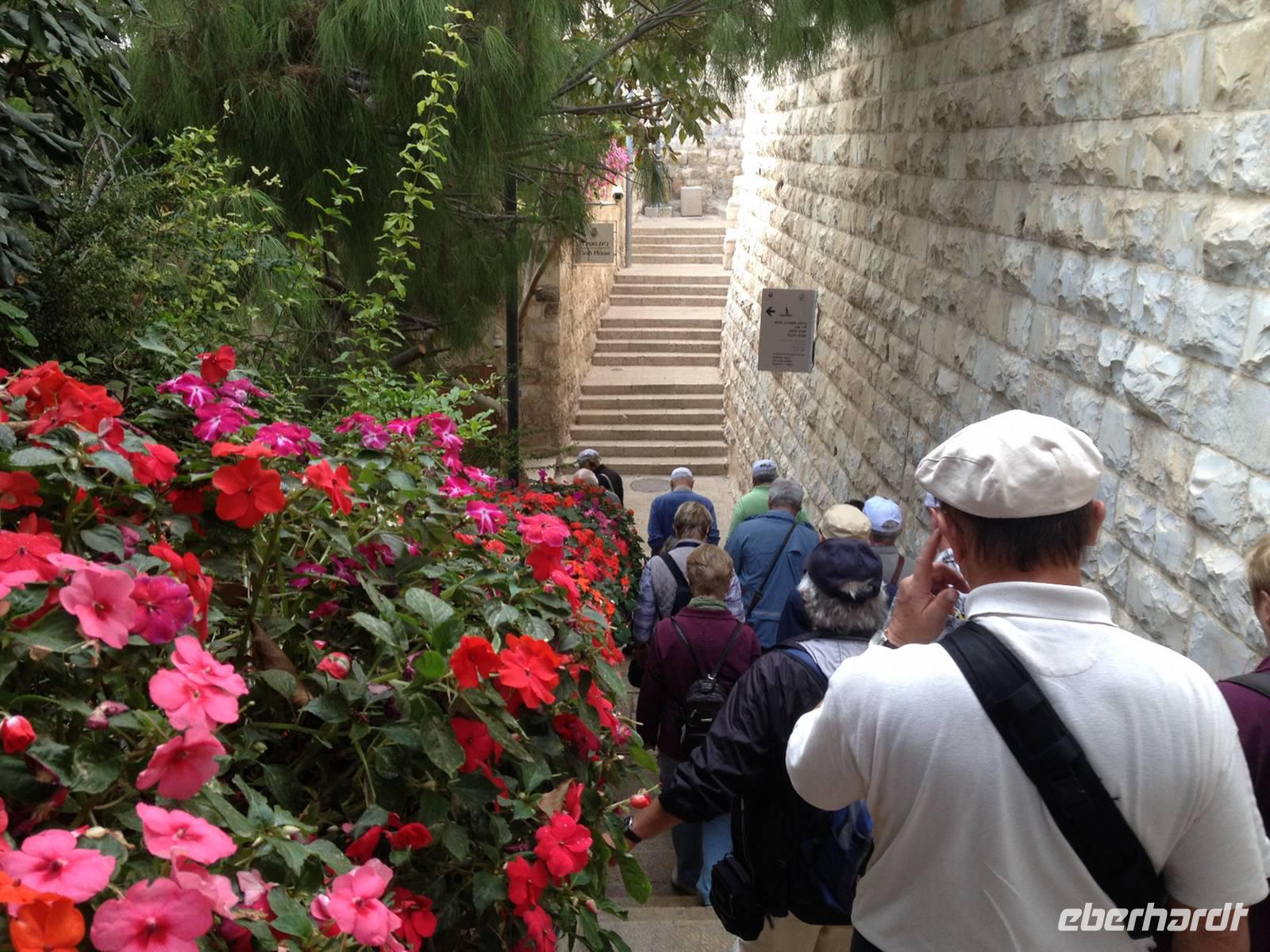 Vorbei an der Maria-Magdalenen-Kirche mit ihren vergoldeten Zwiebeltürmchen, dem Mariengrab und der Stephanskirche spazierten wir zum Löwentor, welches uns Einritt in die Altstadt gewährte. Rechts von uns schlenderten wir vorbei am St.-Anna-Kloster. Wir befanden uns schon auf der Via Dolorosa, die am Löwentor beginnt. Es ist jene Straße, die Jesus nach der Verurteilung durch Pontius Pilatus nach Golgotha entlangging - der Leidensweg! Es gibt insgesamt vierzehn Stationen, die wir während unseres Spazierganges mit David erkundeten. Wir erfuhren, wie Jesus von Pilatus zum Tode verurteilt wurde, wo und wie er das Kreuz aufnahm und das erste Mal stürzte. Im österreichischen Hospiz legten wir eine wohl verdiente Pause ein und genossen vom Dach einen grandiosen Rundblick auf die Stadt. Nach einem stärkenden Kaffee und einem Stückchen Sachertorte ging es auf der Via Dolorosa weiter durch ein Straßen- und Gassenlabyrinth. Dabei lauschten wir den Erklärungen von David zu den nächsten Stationen. Wo Jesus auf seine Mutter traf, Simon das Kreuz trug, Veronika das Gesicht Jesu trocknete, Jesus das zweite Mal stürzte und zu den weinenden Frauen sprach und schließlich das dritte Mal zu Boden fiel. Nun hatten wir schon 9 Stationen hinter uns. Die restlichen Stationen befinden sich schon in der Grabeskirche, die wir nach der Mittagspause besuchten. Mit den letzten Stationen des Leidensweges befinden sich die traditionellen Orte der Kreuzigung und der Wiederauferstehung Jesu unter einem Dach.