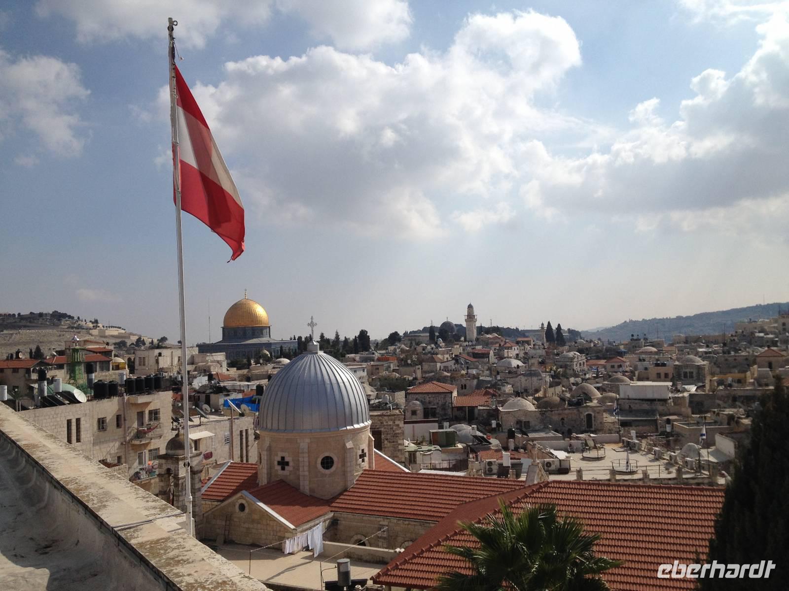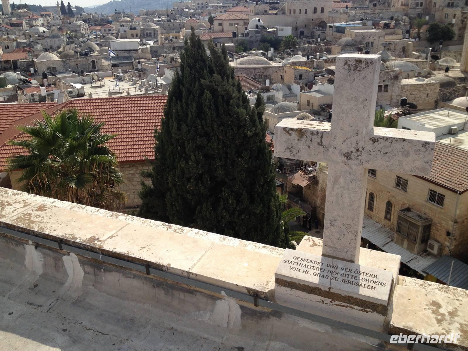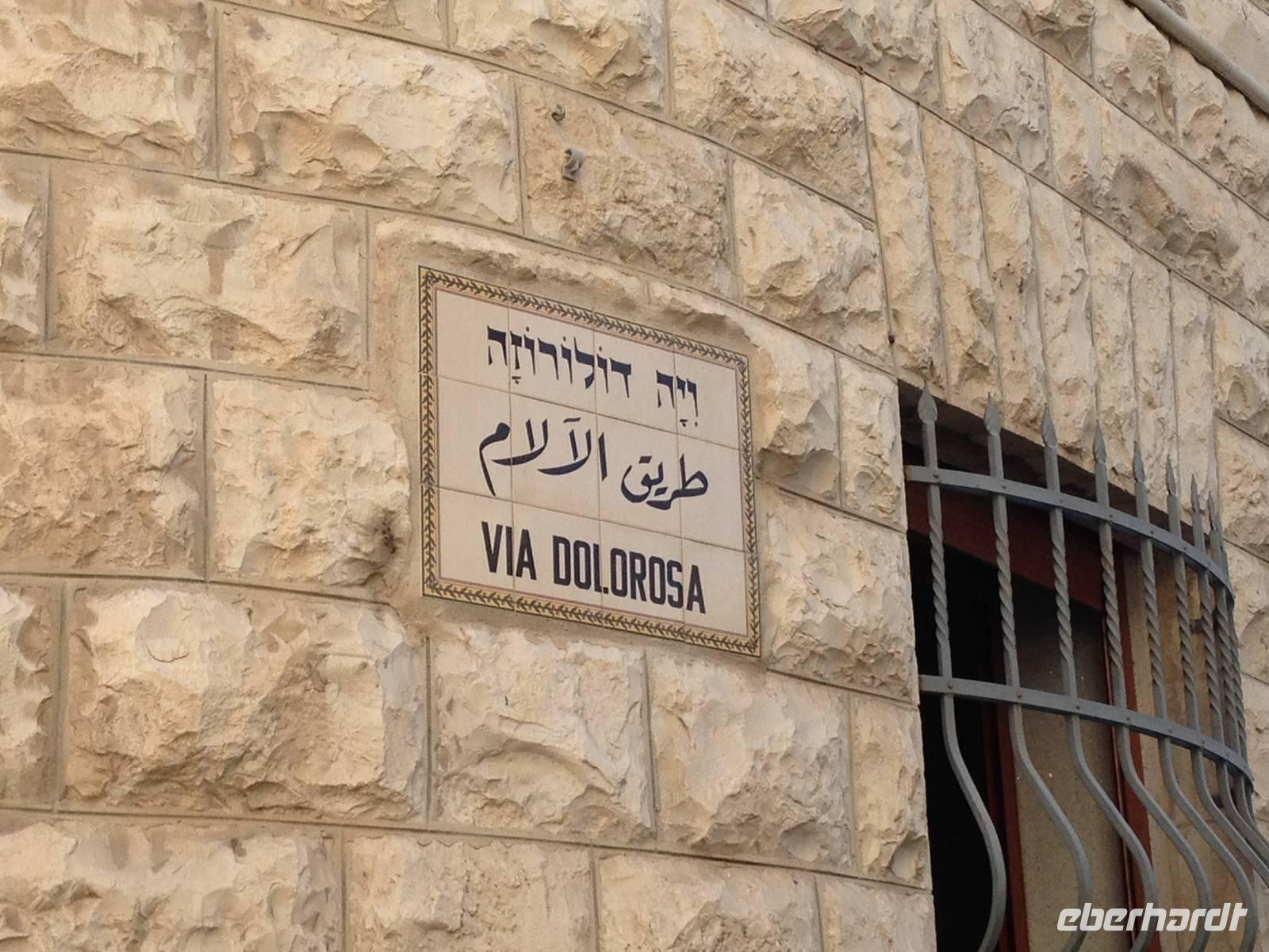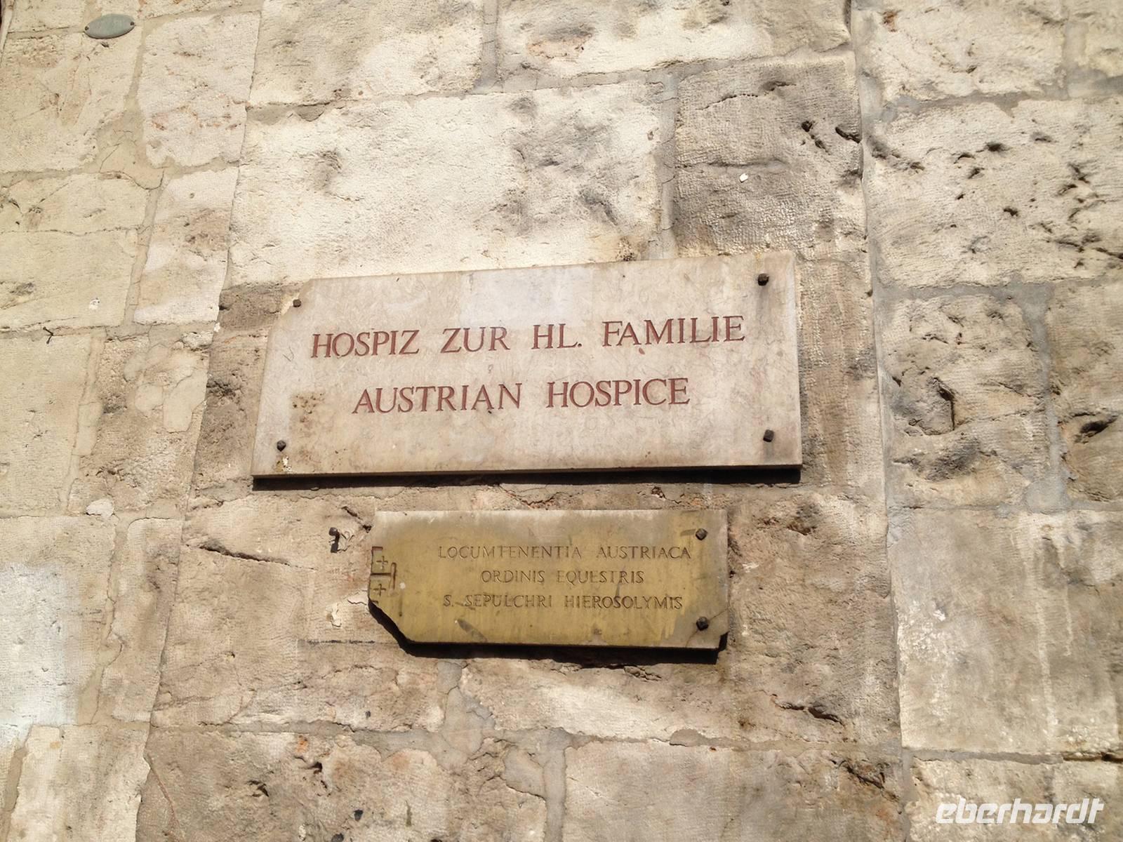 Vorbei an der Maria-Magdalenen-Kirche mit ihren vergoldeten Zwiebeltürmchen, dem Mariengrab und der Stephanskirche spazierten wir zum Löwentor, welches uns Einritt in die Altstadt gewährte. Rechts von uns schlenderten wir vorbei am St.-Anna-Kloster. Wir befanden uns schon auf der Via Dolorosa, die am Löwentor beginnt. Es ist jene Straße, die Jesus nach der Verurteilung durch Pontius Pilatus nach Golgotha entlangging - der Leidensweg! Es gibt insgesamt vierzehn Stationen, die wir während unseres Spazierganges mit David erkundeten. Wir erfuhren, wie Jesus von Pilatus zum Tode verurteilt wurde, wo und wie er das Kreuz aufnahm und das erste Mal stürzte. Im österreichischen Hospiz legten wir eine wohl verdiente Pause ein und genossen vom Dach einen grandiosen Rundblick auf die Stadt. Nach einem stärkenden Kaffee und einem Stückchen Sachertorte ging es auf der Via Dolorosa weiter durch ein Straßen- und Gassenlabyrinth. Dabei lauschten wir den Erklärungen von David zu den nächsten Stationen. Wo Jesus auf seine Mutter traf, Simon das Kreuz trug, Veronika das Gesicht Jesu trocknete, Jesus das zweite Mal stürzte und zu den weinenden Frauen sprach und schließlich das dritte Mal zu Boden fiel. Nun hatten wir schon 9 Stationen hinter uns. Die restlichen Stationen befinden sich schon in der Grabeskirche, die wir nach der Mittagspause besuchten. Mit den letzten Stationen des Leidensweges befinden sich die traditionellen Orte der Kreuzigung und der Wiederauferstehung Jesu unter einem Dach.