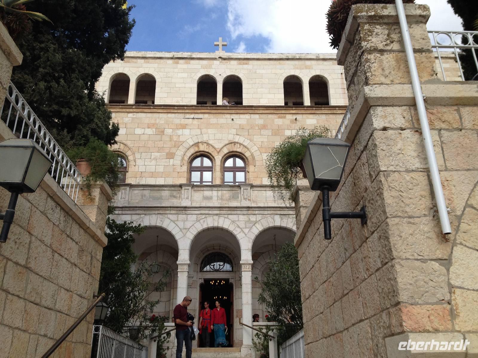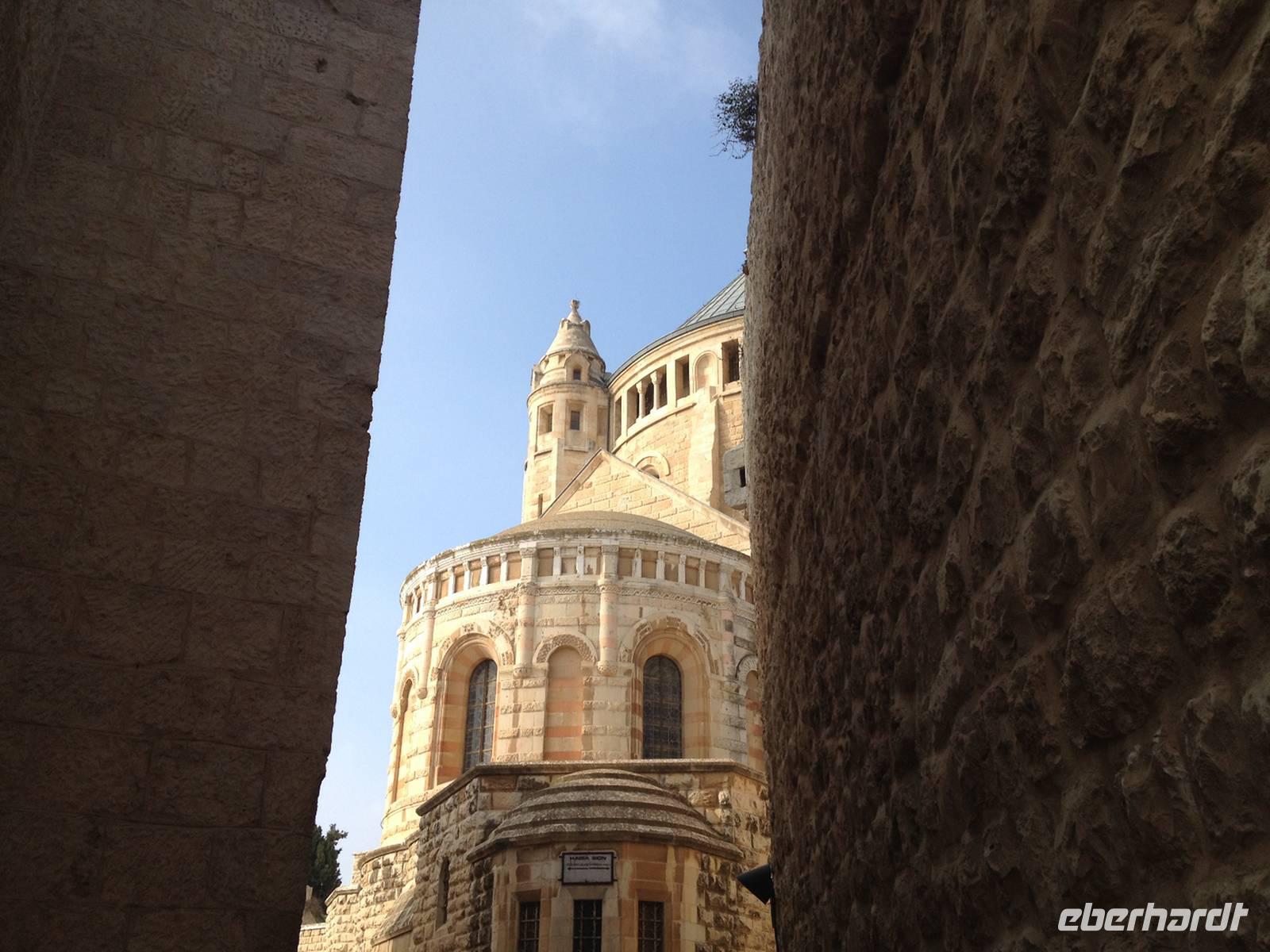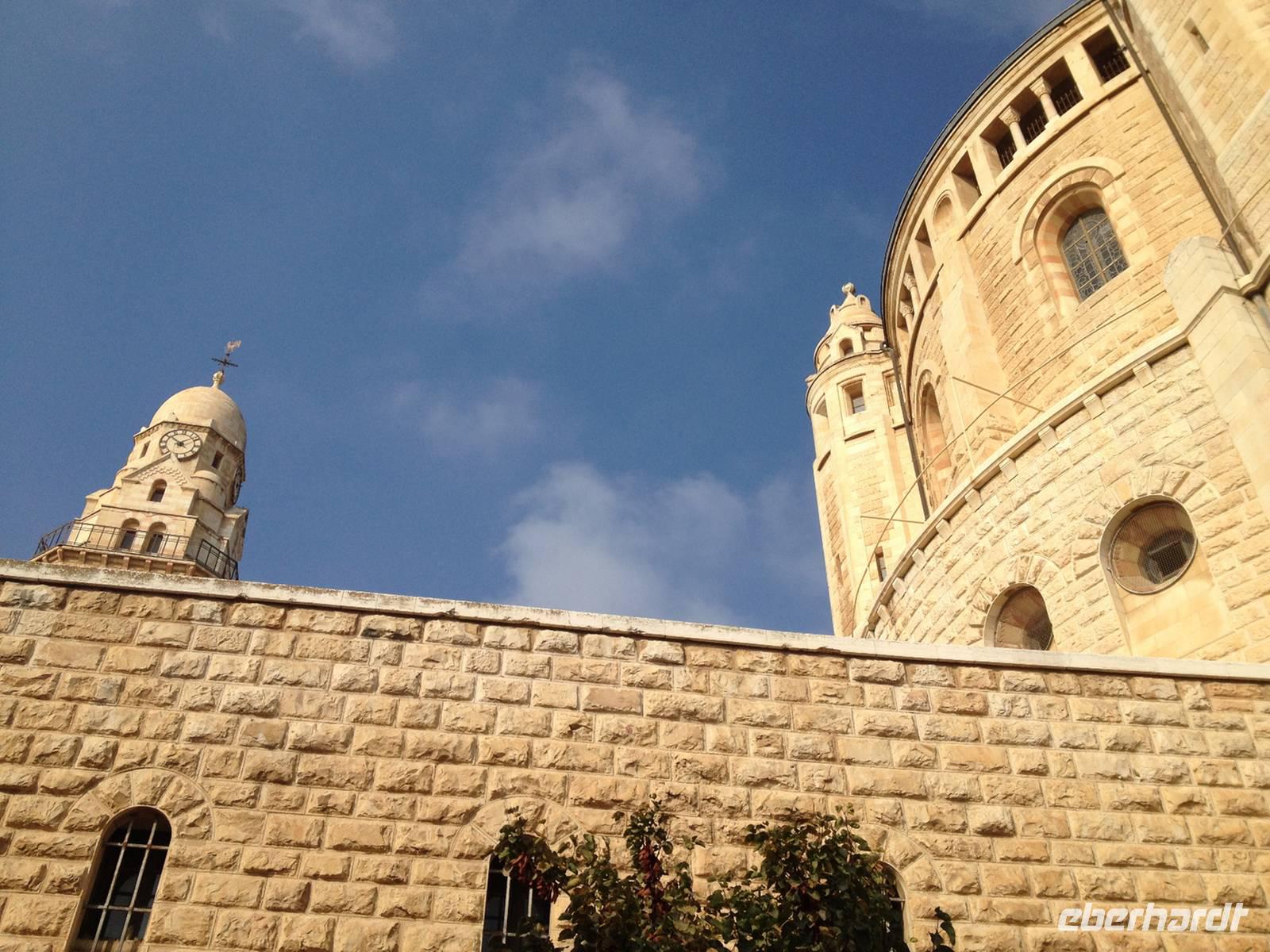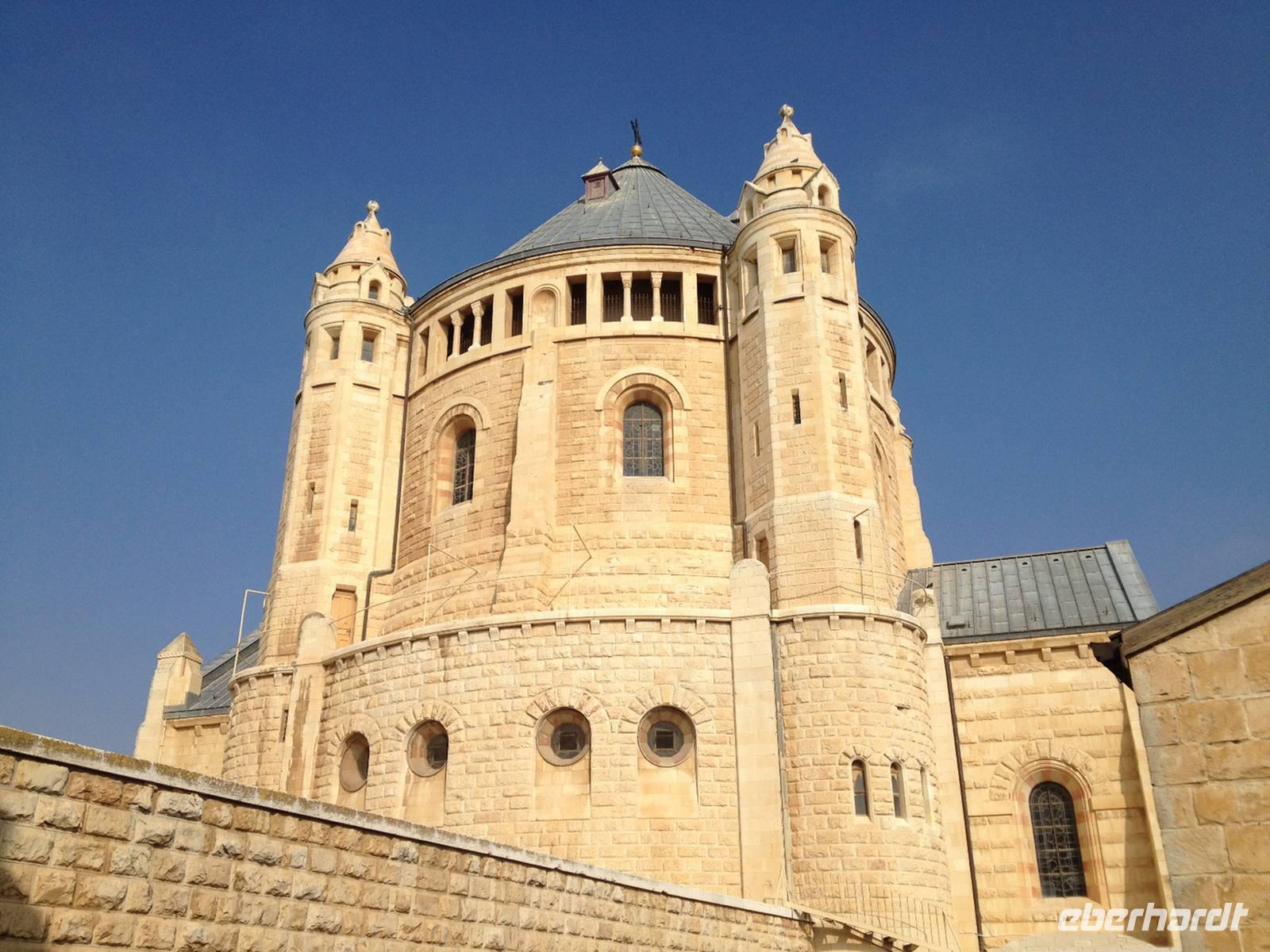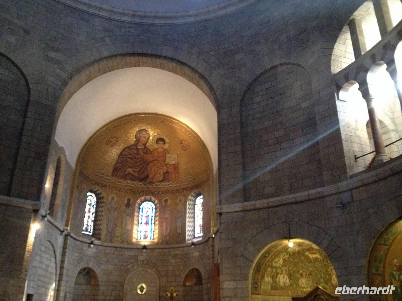 Bis zur Zerstörung des zweiten Tempels befand sich der Berg Zion, wo wir unsere heutige Tagestour begannen, noch innerhalb der Stadtmauern. Heute ist es eines der schönsten Bezirke des modernen Jerusalems. Bekannt ist dieser Ort als Stelle, wo Jesus den Jüngern die Füße wusch, die Verleugnung durch Petrus und den Verrat durch Judas prophezeite und das letzte Abendmahl stattfand. Unübersehbar war der Turm der Dormitiokirche, die an den Tod der Gottesmutter erinnert und gleichzeitig das moderne Wahrzeichen des Zionberges darstellt. Nachdem Kaiser Wilhelm II. das Grundstück geschenkt bekam, ließ er einen Rundbau nach dem Vorbild der Pfalzkapelle Aachen errichten. Ein Mosaik - Maria mit dem Jesuskind - schmückt die Kuppel der Apsis.