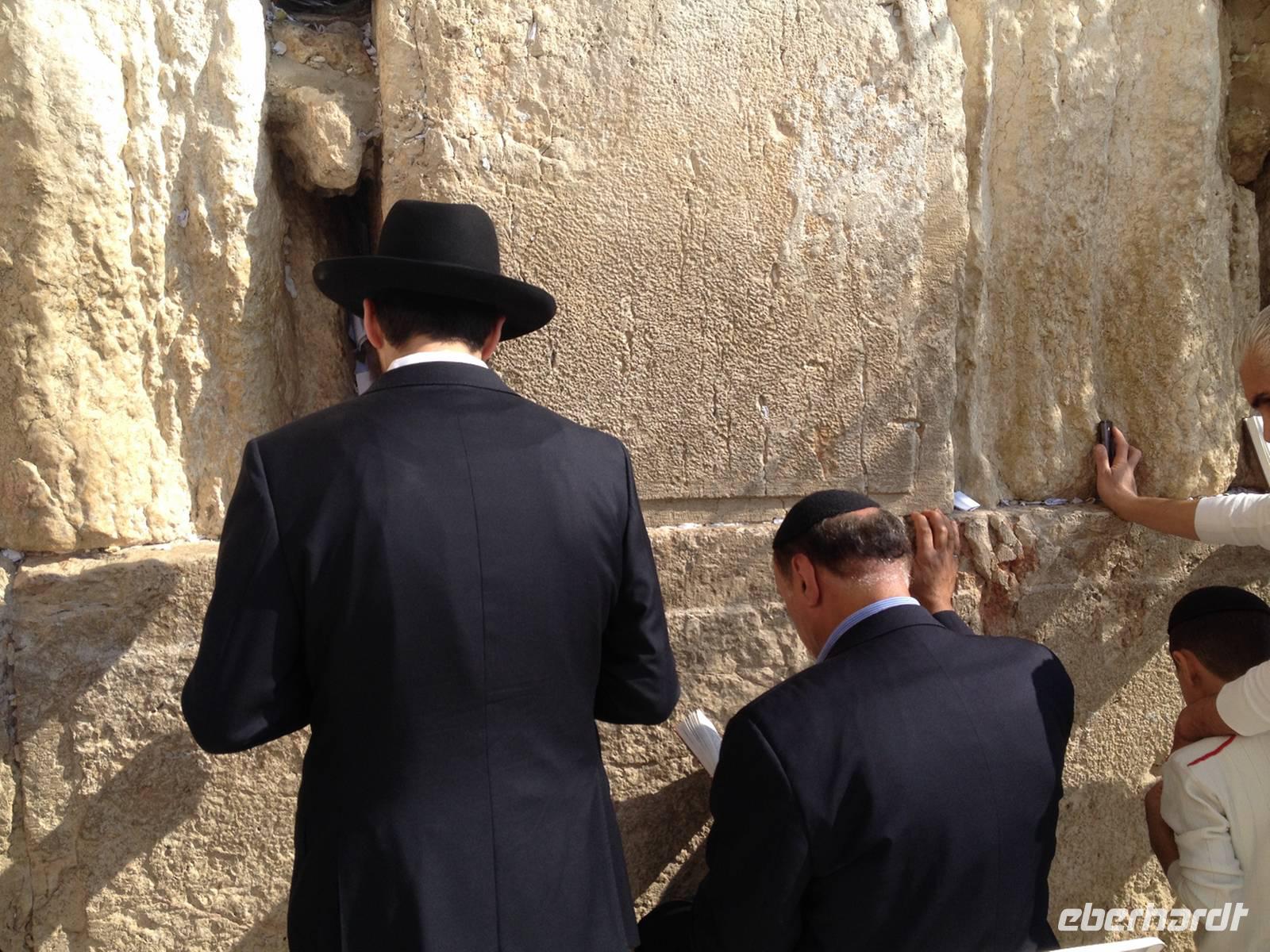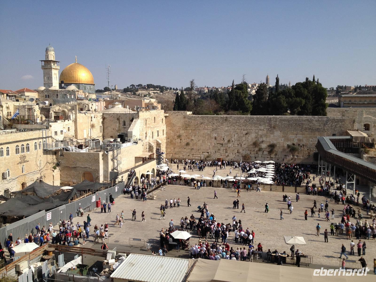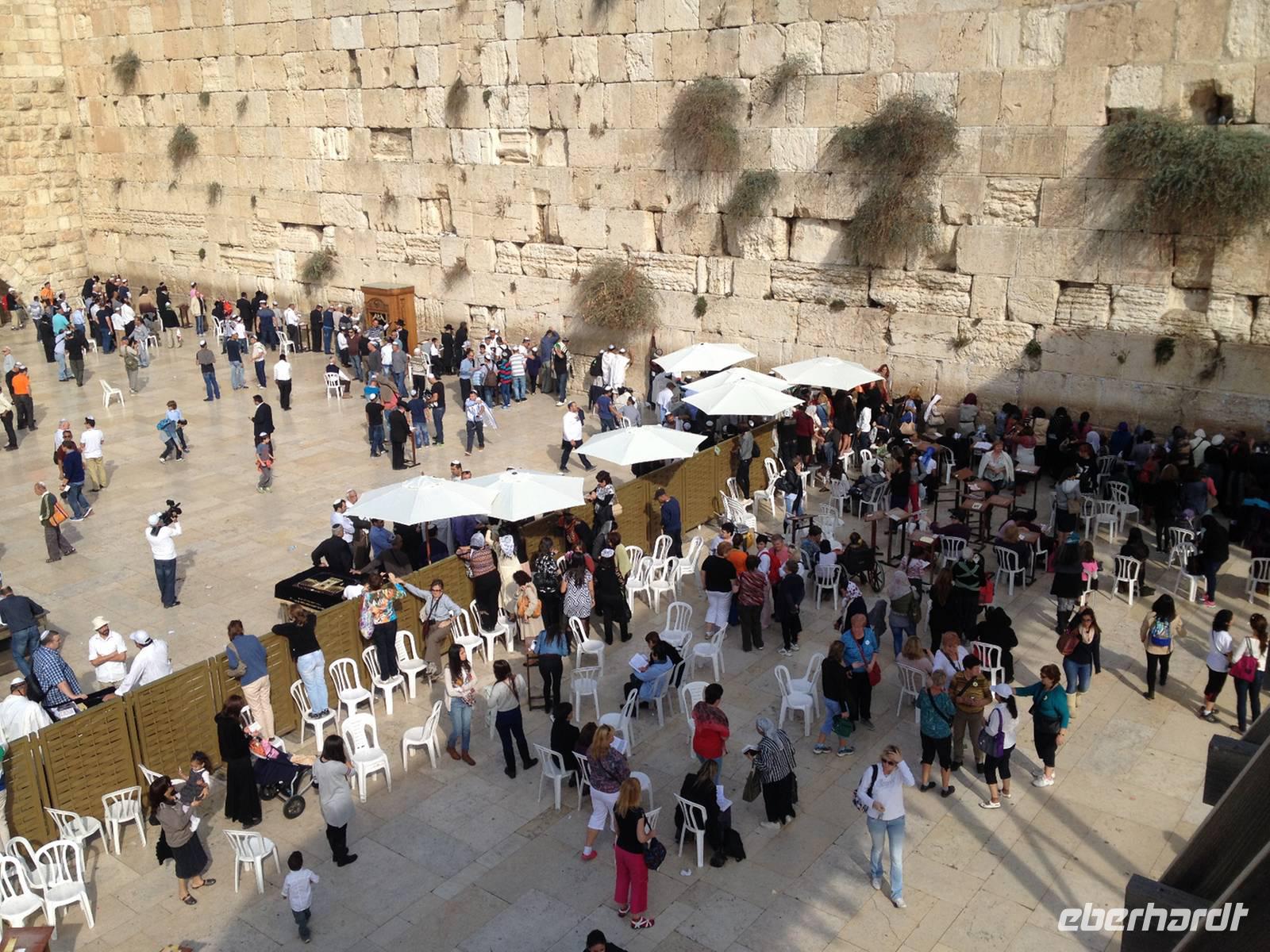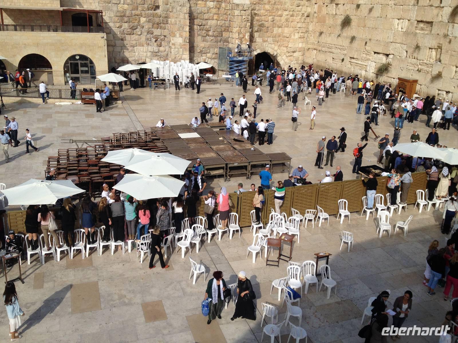 Wir haben uns extra einen Montag für den Besuch der Klagemauer ausgesucht, da stets montags und donnerstags die Feierlichkeiten der Bar Mitzwa hier stattfinden. An diesem Tag ist ein 13jähriger jüdischer Junge ein vollwertiges Mitglied der jüdischen Gemeinde. Er gehört nun zu den Erwachsenen, den Männern. Er darf aus der Thora (die 5 Bücher Mose) vorlesen und kann mit neun anderen Männern den Minjan (Gebetskreis) bilden. Ab der Bar Mitzwa ist der jüdische Junge für sein Handeln selbst verantwortlich. Beim Morgengebet an den Wochentagen kann auch er nun den Teffilin (Gebetsriemen) und den Tallit (Gebetsmantel) tragen. Genauso muss er ab diesem Tag die Gesetze der Thora ausnahmslos beachten und ehren. Wir stürzten uns ins Getümmel und waren von den hier gesammelten Eindrücken und Erlebnissen mehr als begeistert, sodass man es kaum in Worte fassen kann.