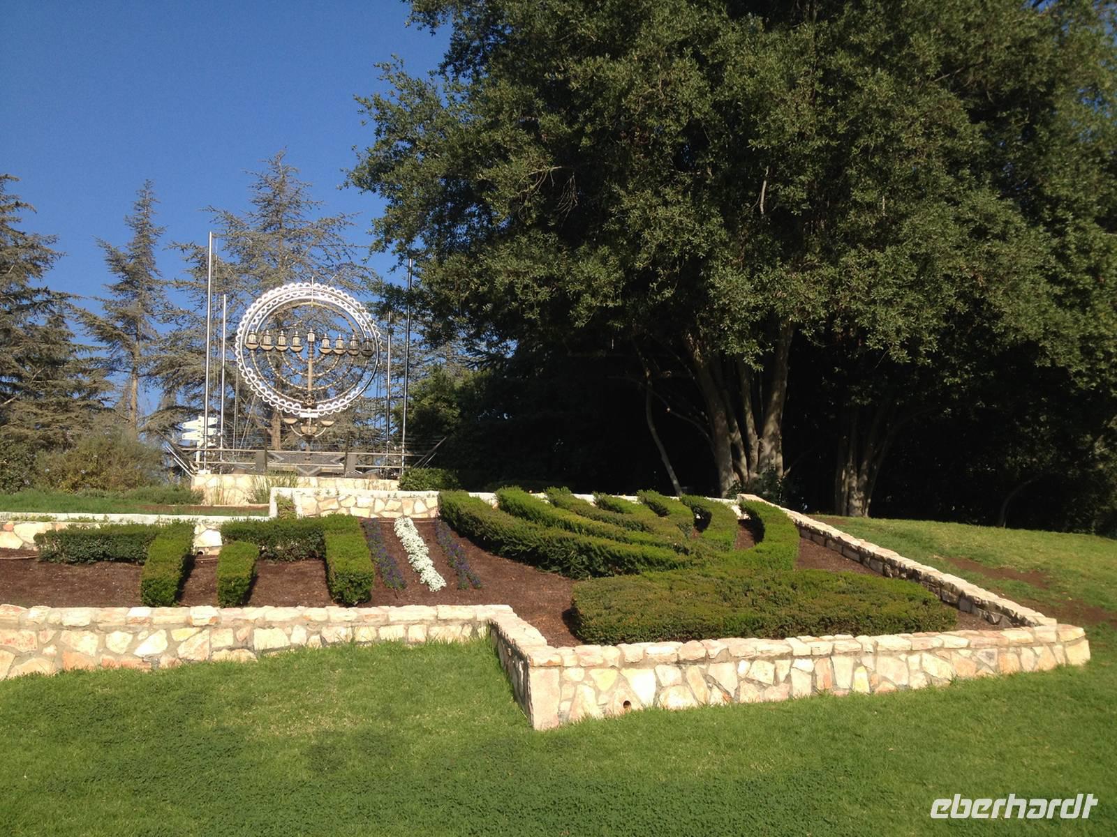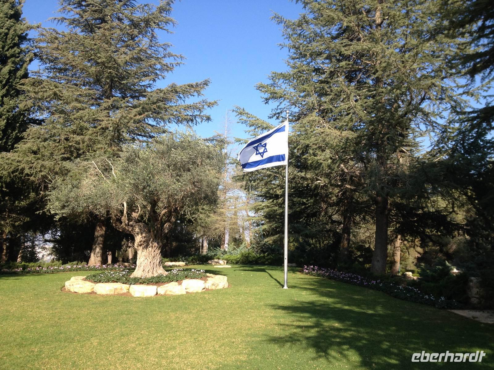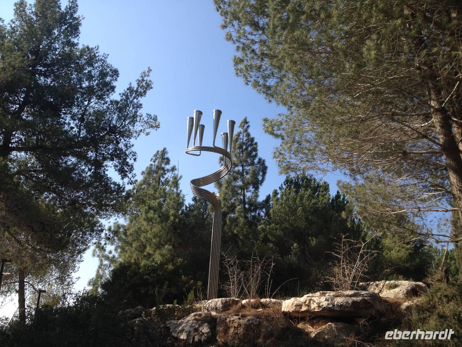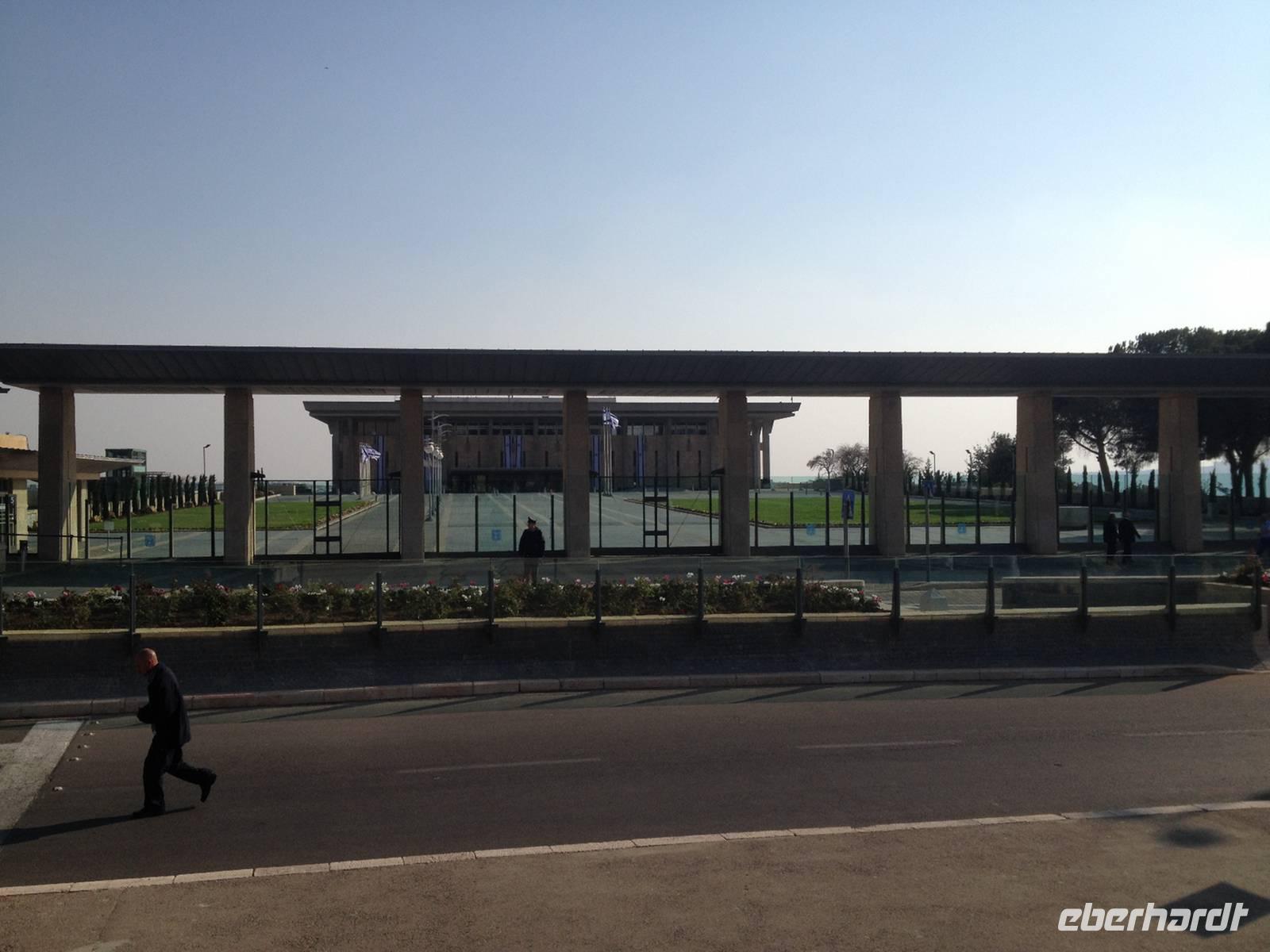 Durch den Skulpturengarten gingen wir zurück zum Bus, der uns ins nahegelegene Regierungsviertel brachte. Leider wurde uns der Eintritt und somit unsere geplante Führung in der Knesset verwehrt, da gerade der französische Staatspräsident François Hollande hier verweilte. Dennoch sahen wir das israelische Einkammerparlament von außen und unterhielten uns an der 5 m hohen, mit Szenen der jüdischen Geschichte verzierten Bronzemenora über das politische System des Staates Israel. Mit diesem Programmpunkt und dem letzten Gruppenfoto war das vorgeschriebene Reiseprogramm eigentlich erfüllt und es sollte zurück zum Hotel gehen.