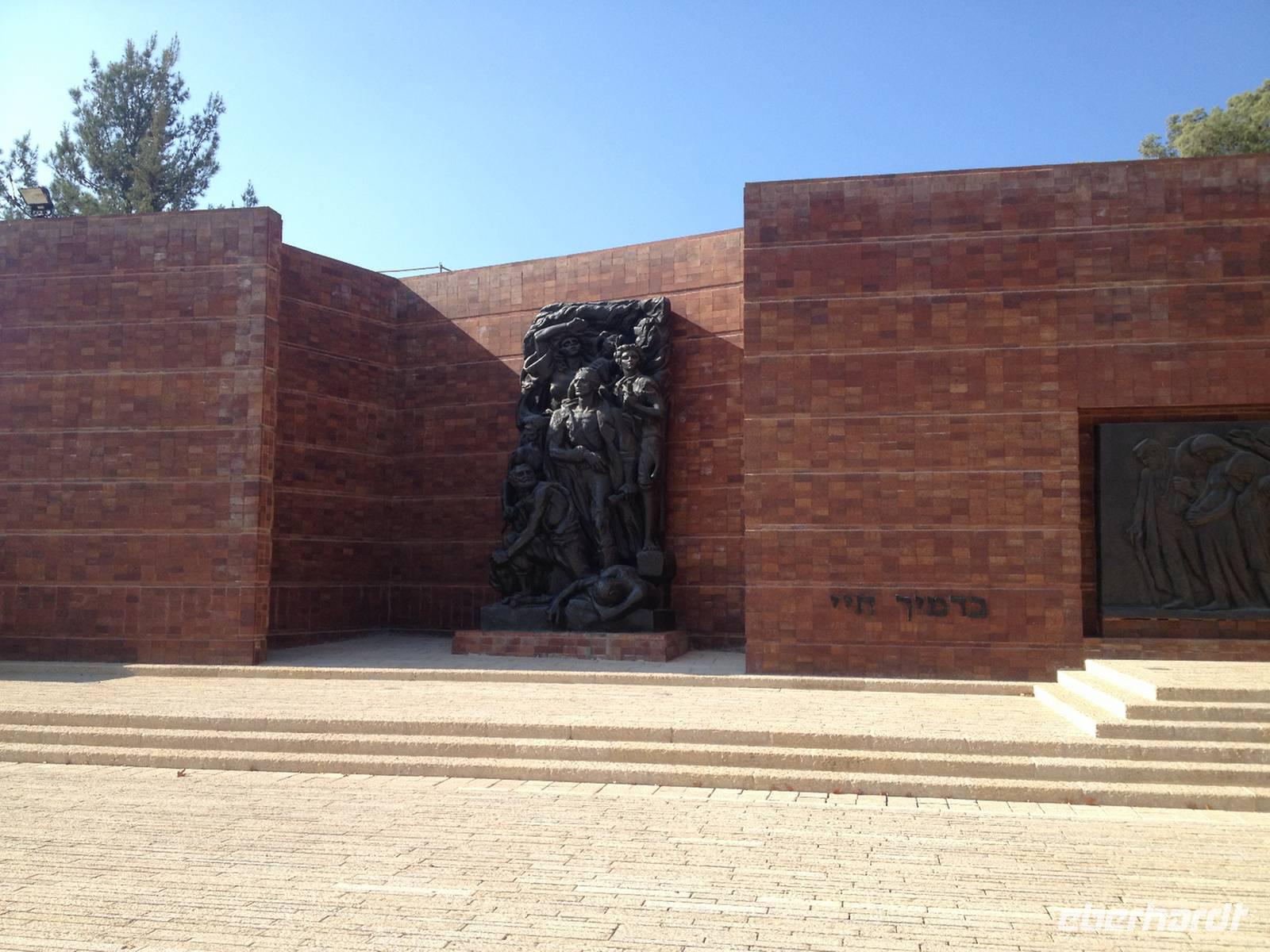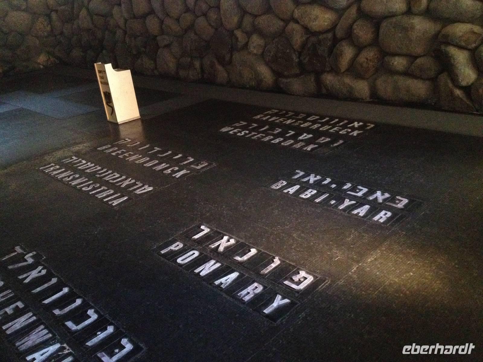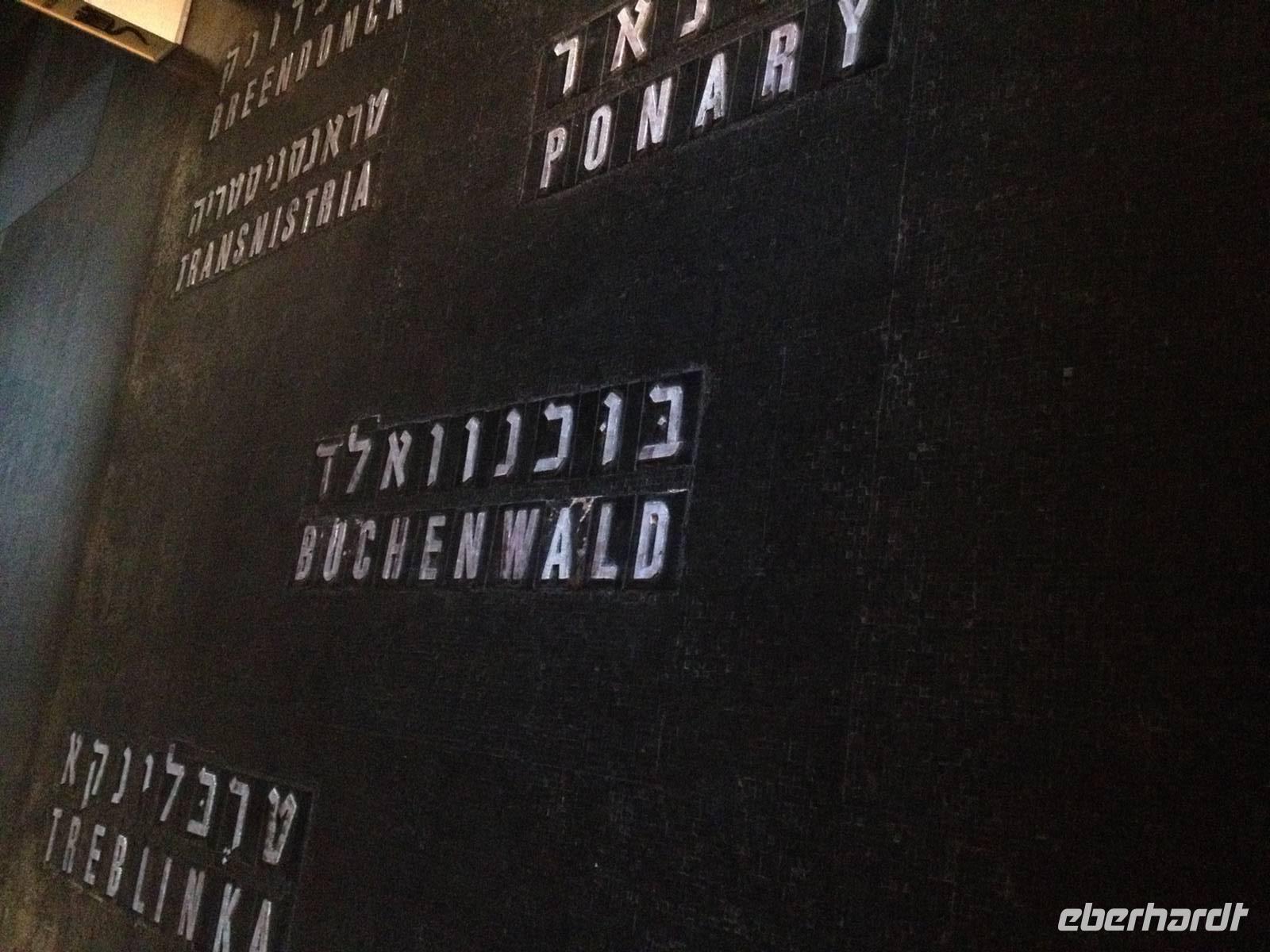 Im Holocaust-Museum konnten wir uns individuell die sehr schöne Ausstellung anschauen. Durch die 180 m lange, in den Berg getriebene Betonröhre wird man quasi im erzwungenen Zickzack hindurchgeführt. Videos, KZ-Mobiliar, Nazi-Fahnen, Tagebücher, Kopfsteinpflaster aus dem Warschauer Ghetto, Viehwaggons und vieles mehr versperrte uns den direkten Weg. Überall lagen Meldebücher, die zu Sterberegistern wurden. Nicht nur in diesem fantastischen Museum, sondern auch in der Halle der Namen (ein runder Kuppelbau voller Porträts am Ende des Museums als symbolischer Friedhof) wurde uns die Grausamkeit dieser Epoche verdeutlicht.