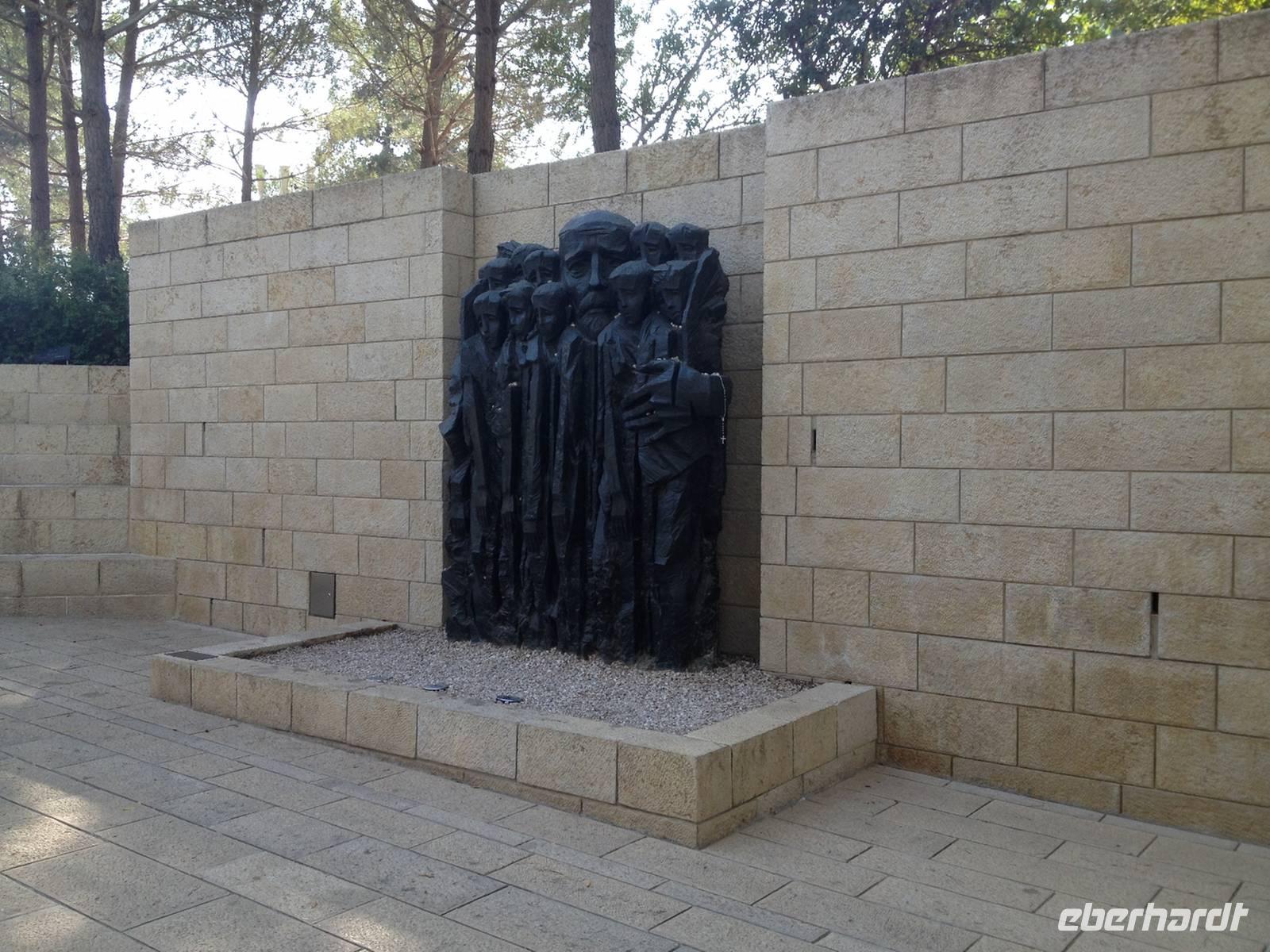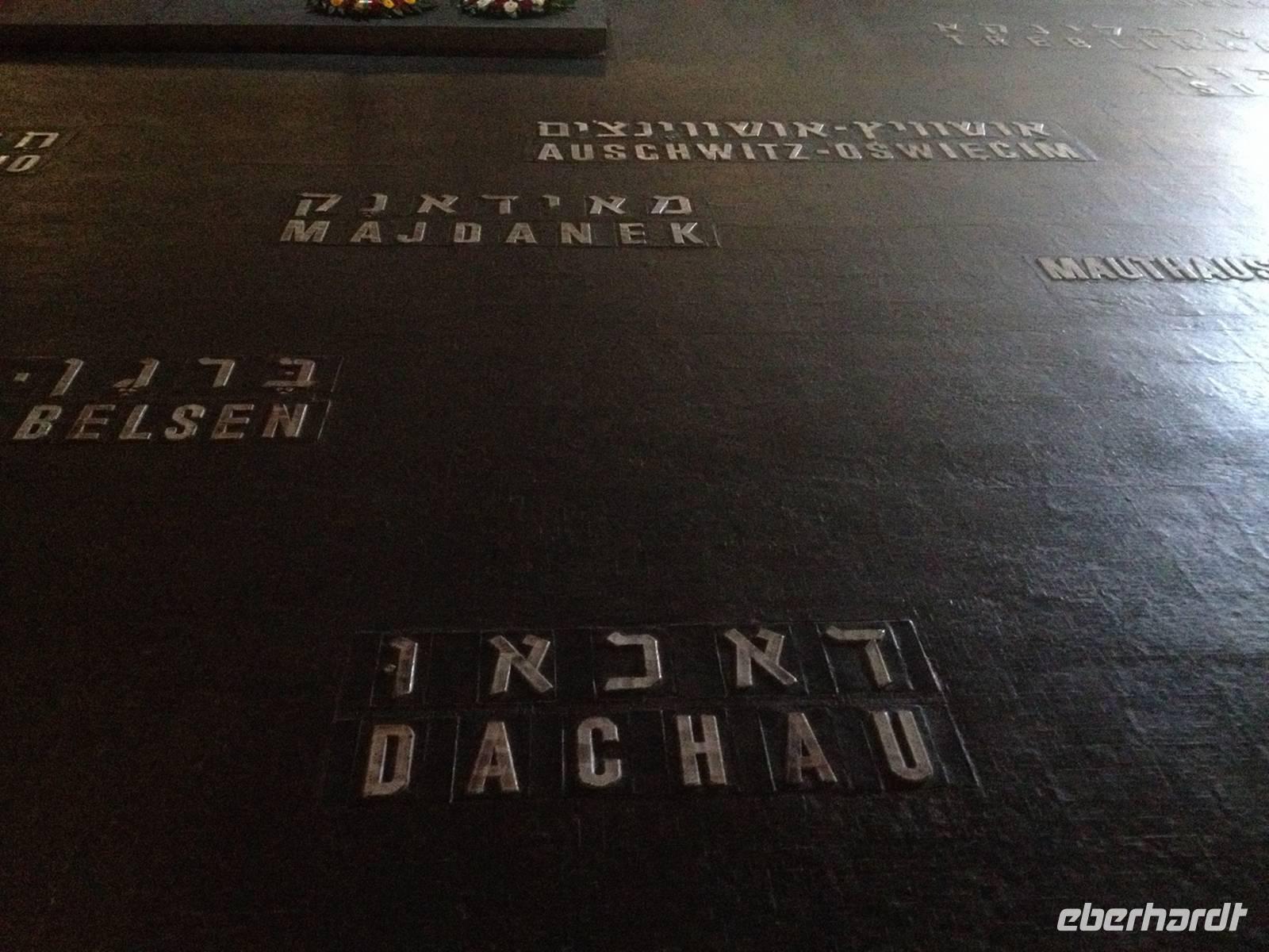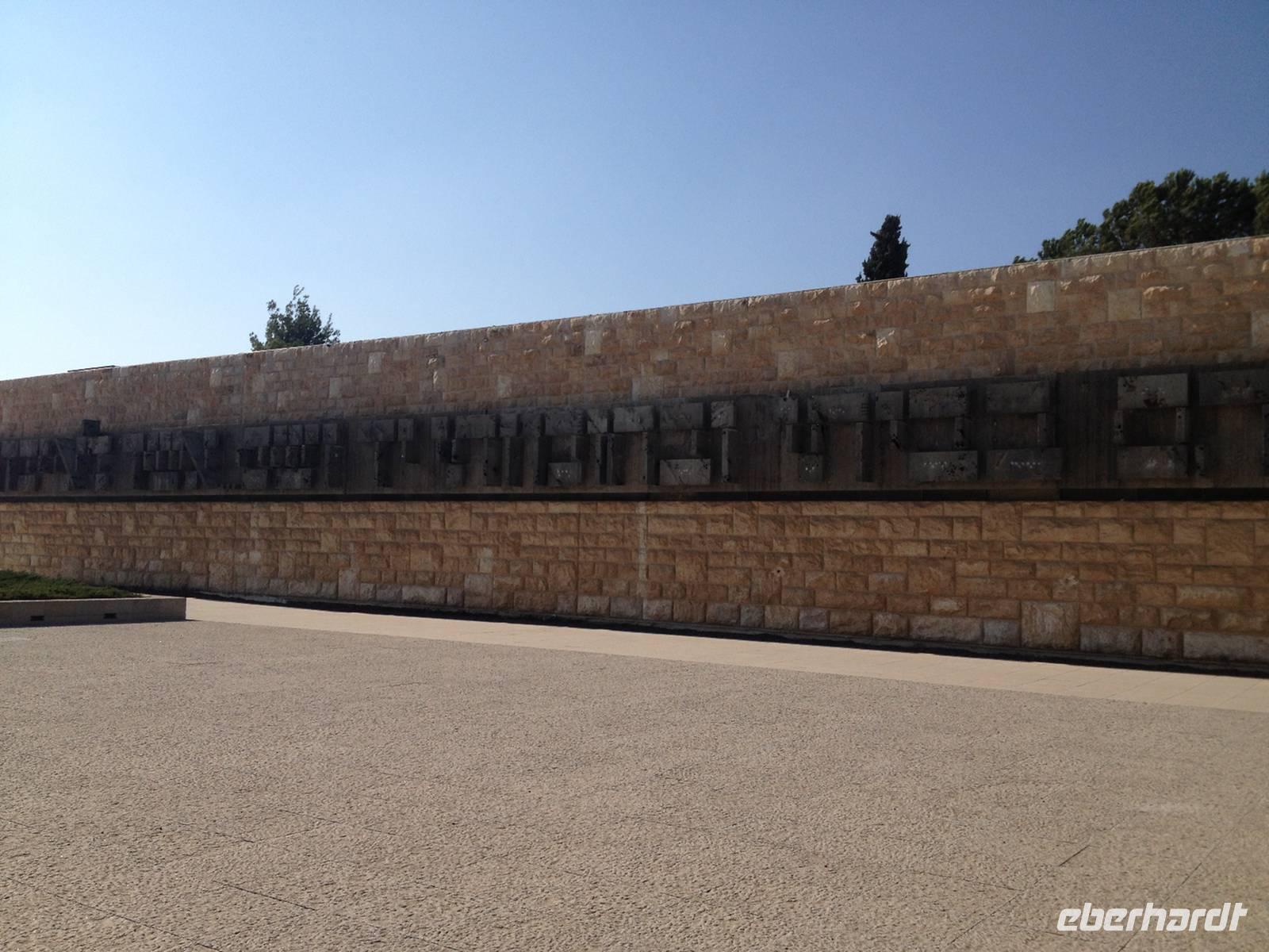 Im Holocaust-Museum konnten wir uns individuell die sehr schöne Ausstellung anschauen. Durch die 180 m lange, in den Berg getriebene Betonröhre wird man quasi im erzwungenen Zickzack hindurchgeführt. Videos, KZ-Mobiliar, Nazi-Fahnen, Tagebücher, Kopfsteinpflaster aus dem Warschauer Ghetto, Viehwaggons und vieles mehr versperrte uns den direkten Weg. Überall lagen Meldebücher, die zu Sterberegistern wurden. Nicht nur in diesem fantastischen Museum, sondern auch in der Halle der Namen (ein runder Kuppelbau voller Porträts am Ende des Museums als symbolischer Friedhof) wurde uns die Grausamkeit dieser Epoche verdeutlicht.