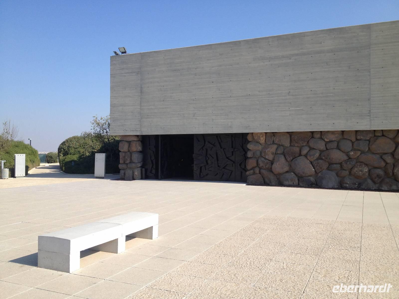 Auch auf dem Herzl-Berg liegt die berühmte und zugleich bedrückende Holocaust-Gedenkstätte der über 6 Mio. Opfer der grausamen Judenverfolgung, die wir selbstverständlich besuchen. Denn dieses heikle Thema gehört zu einem Israelbesuch einfach dazu. Zunächst machten wir mit David einen kleinen Rundgang auf dem „Berg der Erinnerung" und sahen unter anderem die mit Johannisbrotbäumen gesäumte Allee der Gerechten unter den Völkern und Skulpturen, die Szenen aus der tragischen Vergangenheit zeigen. Wir besuchten auch die Halle der Erinnerung, wo sonst Staatsgäste Kränze niederlegen. In der Mitte des dunklen Raumes brennt in einem zerbrochenem Kelch die Ewige Flamme, auf dem Boden sind Namen zu lesen: Theresienstadt, Buchenwald, Dachau, Bergen-Belsen - insgesamt 22 der größten Konzentrationslager und Namen anderer Vernichtungsstätten. Das wohl bedrückendste Gefühl hinterließ zweifelsohne die Kindergedenkstätte. An einem Geländer tasteten wir uns durch einen nachtdunklen Raum. Aus dem Schwarz leuchteten nur die überlebensgroßen Gesichter ermordeter Kinder auf, danach verlor sich unser Blick in einem Meer von Lichtern - eines für jedes Kind. Und aus dem Nichts sprach eine Stimme Namen, Namen getöteter Kinder.
