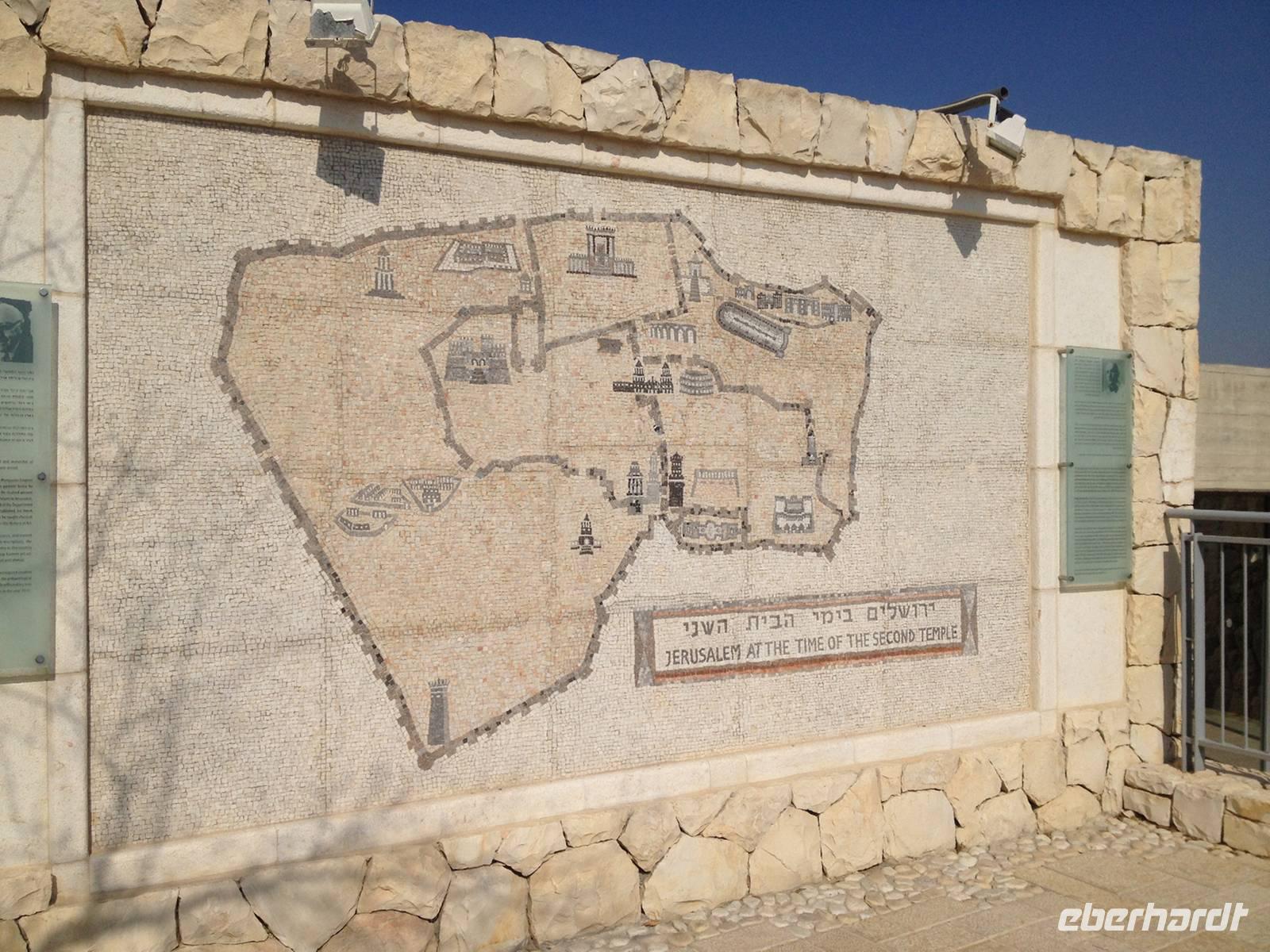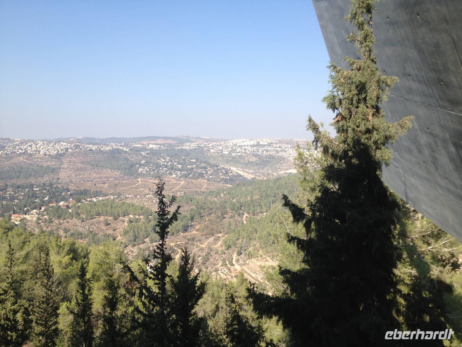 Am Ende der Röhre (also des Museums) befindet sich eine Terrasse, erstmals ist der Himmel wieder zu sehen und nach der Enge des Museums öffnet sich der Blick nach Jerusalem.