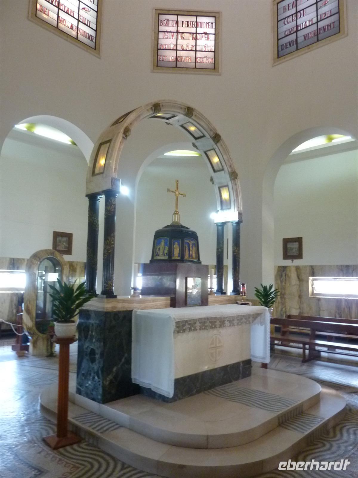 Die bezaubernde rote Steinfassade der Kirche ist ein ungewöhnlicher Akzent in einer Stadt, die mit Steinen erbaut wurde; ihr Innenraum mit gewölbten Decken, Farbglasfenstern, marmorbedeckten Wänden und einem riesigen Gemälde über dem Altar von Petrus Heimsuchung durch einen Engel erinnert an die Kirchen italienischer Tradition. Weiter fuhren wir ins Dorf Neve Shalom.