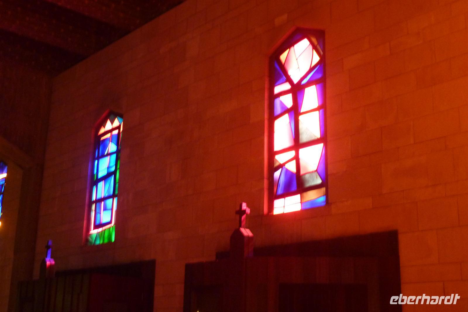 Das Thema der Fenster sind die zwölf Söhne Jakobs und damit auch die zwölf Stämme Israels. Nach dem Besuch der Synagoge verließ uns Reiseleiter David und wir fuhren nach Bethlehem. Gegen Mittag erreichten wir Bethlehem und unser örtlicher Reiseleiter hat uns an einem Restaurant in Empfang genommen. Dort verbrachten wir noch unsere Mittagspause und weiter ging es zu unsere heutigen Unterkunft - der „Abraham Herberge“ in Beit Jala. Wir bezogen schnell die Zimmer und fuhren direkt zur Geburtskirche. Dort warteten schon mehrere hunderte Touristen - sie wollten ja schließlich das gleich sehen wie wir. Im Untergeschoss der Geburtskirche befindet sich die Geburtsgrotte. Diese wurde durch einen 14-zackigen Stern, der genau auf der Mittelachse der Kirche liegt, im Jahr 1717 durch die katholische Kirche geschmückt. Er trägt die Inschrift “” (Übers.: Hier wurde Jesus Christus von der Jungfrau Maria geboren). Leider konnten wir dies nicht betrachten, da wir sonst hätten zwei Stunden anstehen müssen. Am späten Nachmittag erreichten wir wieder unsere Herberge. Nach dem Abendessen erklärte uns Pfarrer Shihadeh alles über die „Abrahams Herberge“ sowie über das Leben in Bethlehem.