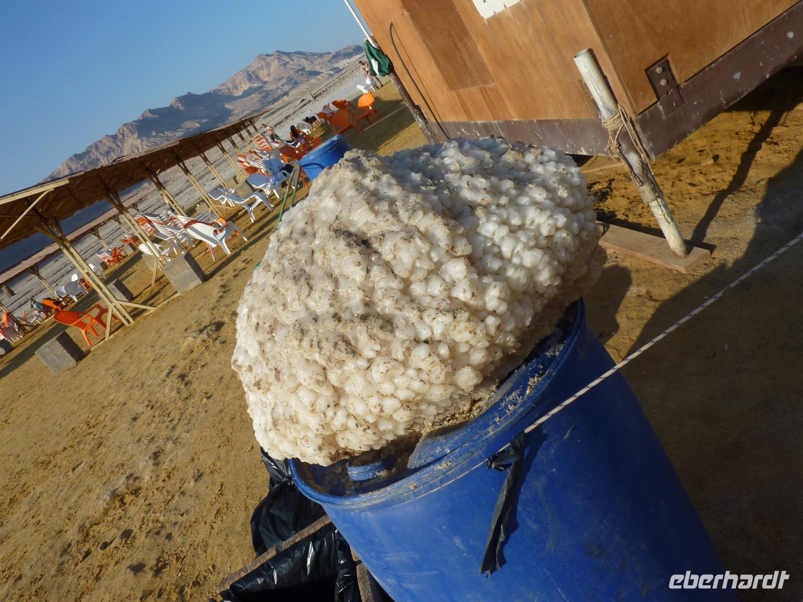 Die Landwirtschaft, insbesondere der Anbau von Datteln und Pomelos ist die zweite Haupteinnahmequelle von En Gedi. Nun ging es wohl mit zum größten Highlight der Reise zum Toten Meer. Wir besuchten den Spa Ein Gedi. Zuerst sättigten wir uns bei einem Mittagessen und anschließend fuhren wir mit einer Shuttle-Bahn direkt ans Tote Meer. Wie bereits schon überall in den Medien gesehen konnte man sich wirklich einfach auf dem Wasser treiben lassen ohne unter zu gehen. Auch mit dem Schlamm haben sich einige Gäste eingeschmiert. Danach sollte man ja angeblich jünger aussehen. Am Abend erreichten wir wieder unser Kibbuz „ „.