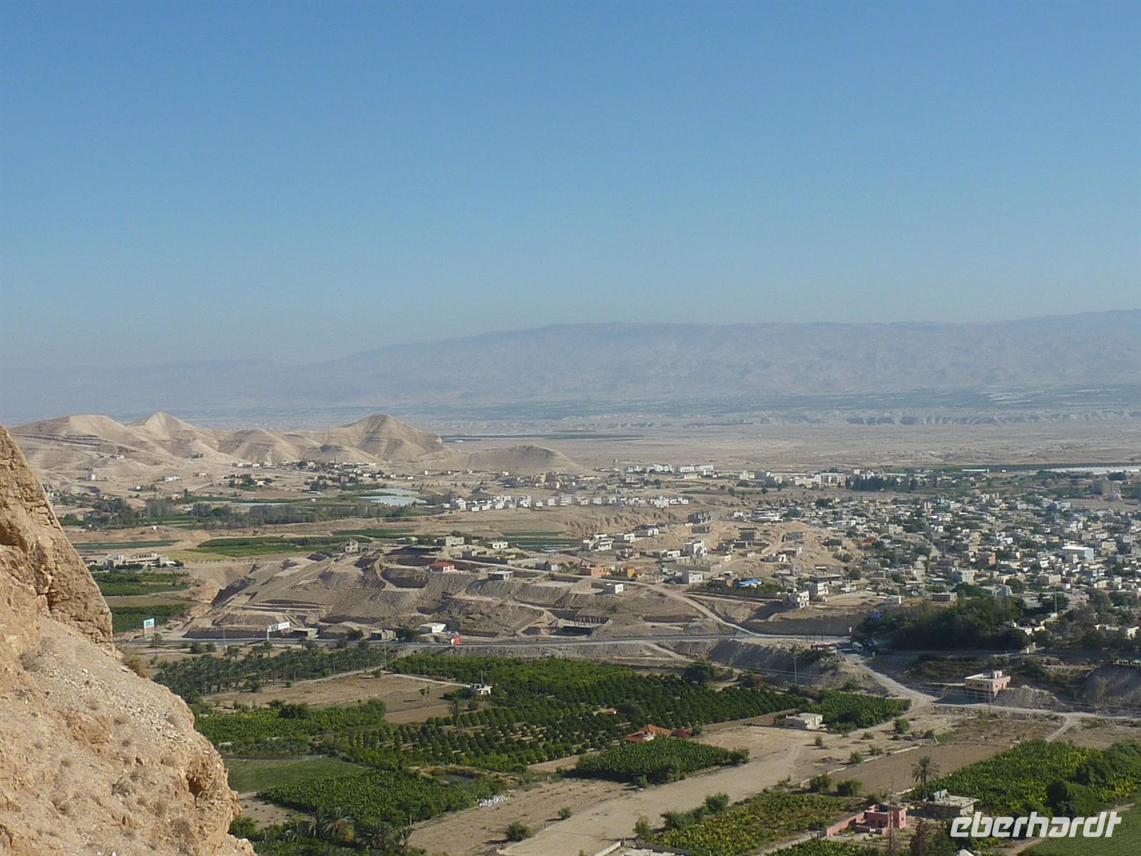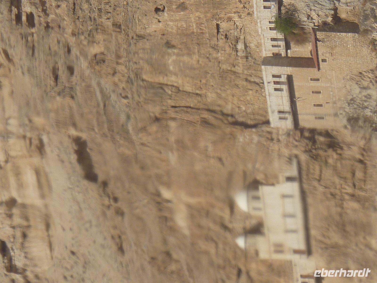 Wir verlassen unser Kibbuz und fahren nach Jericho. Da unser Reiseleiter David nicht mit in das Gebiet der Palästinenser darf, verließ er uns ein paar Kilometer vor der Grenze. Unser angeblich deutsch-sprechender Reiseleiter Maschi, der nur englisch sprach, empfing uns freundlich in Jericho. Ich probierte so gut wie möglich zu übersetzen und wir fuhren mit der Seilbahn auf dem Berg der Versuchung. Dort besichtigten wir das Kloster. Es ist auf eindrucksvolle Weise erbaut, durch die in der Konstruktion enthaltenen Höhlen. Gemäß der Überlieferung nahm der Herr hier Zuflucht nach seiner Taufe, betete und fastete vierzig Tage lang (Saranda bedeutet auf griechisch vierzig) und wurde zum Schluß vom Satan versucht. Bevor wir das Palästinensische Gebiet verließen, sind wir noch am ehemaligen Palast des König Hishma vorbeigefahren. Weiter ging es zur der Stelle wo die Geschichte mit dem Barmherzigen Samariter geschehen ist.